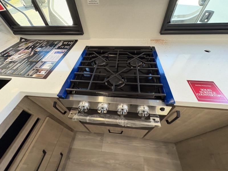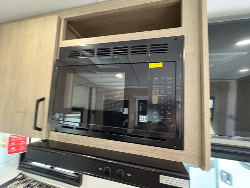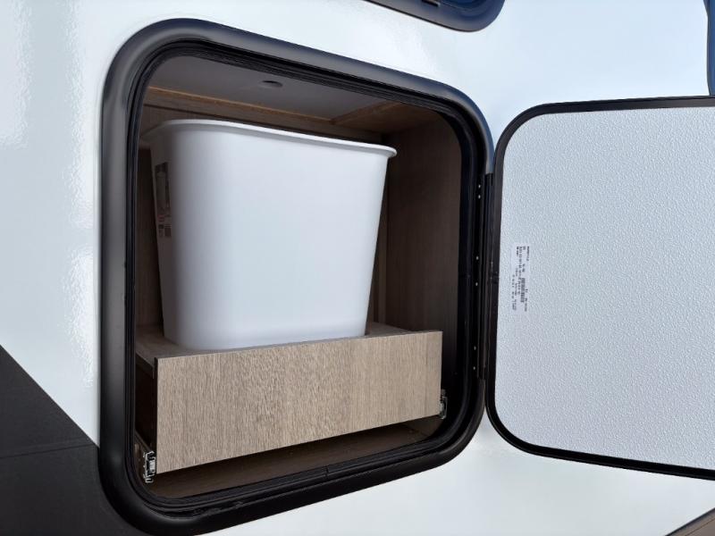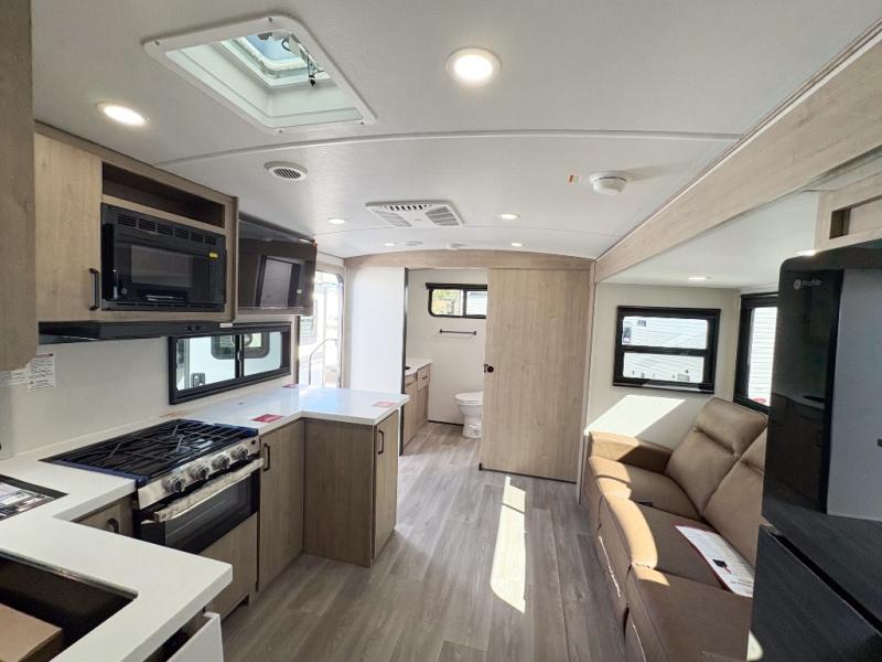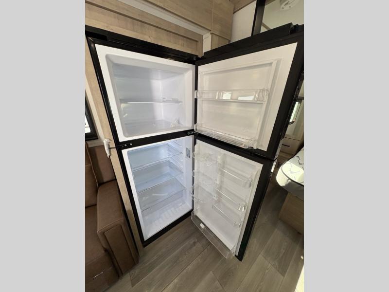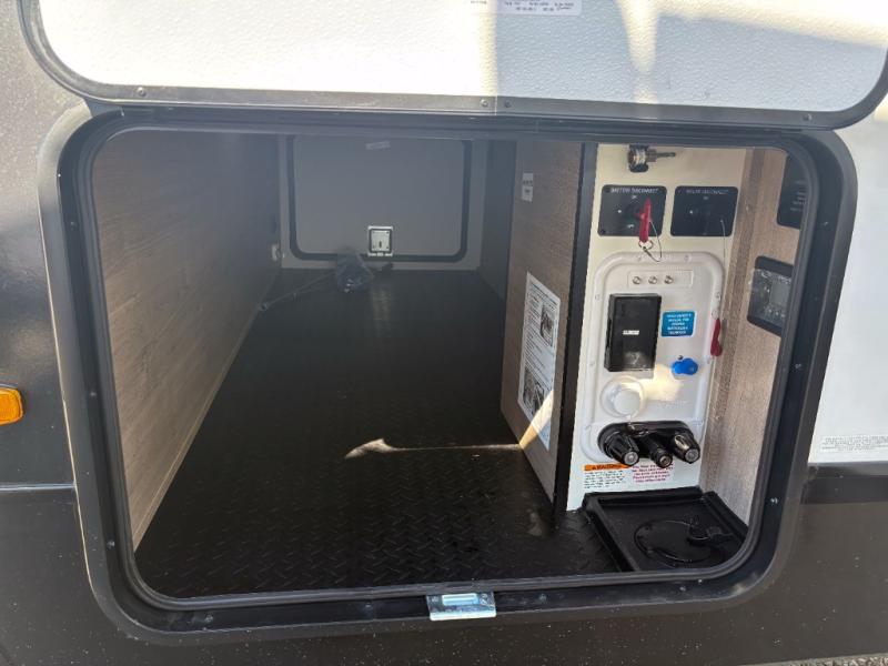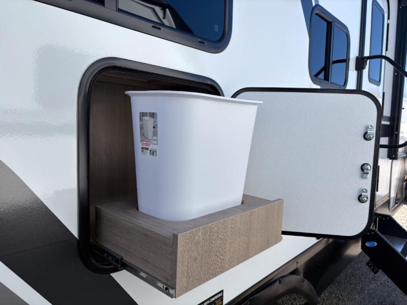 Escape to adventure with this fantastic travel trailer! The private bedroom features a plush 60" x 80" queen bed, spacious wardrobe, and TV prep for entertainment. The kitchen area is fitted with a pull-out pantry, 10 cu. refrigerator, microwave, and three-burner cooktop for gourmet meal prep. Enjoy extra counter space with the flip-up countertop extension, ideal for easy and comfortable cooking. Gather with family and friends at the theater dinette, featuring an LED HDTV for movie nights and game days after that, you can take a relaxing bath in the full rear bathroom, with ample storage. Stay organized on the go with pass-thru storage, 20” x 20” baggage door/trash can storage, and a spacious interior. Enjoy outdoor living under the shade of the 18’ awning, perfect for weekend getaways, or outdoor activities for the adventure-seekers.