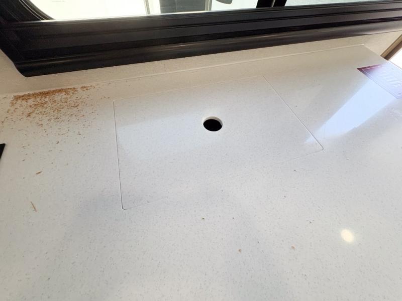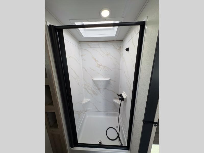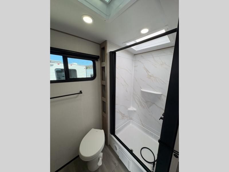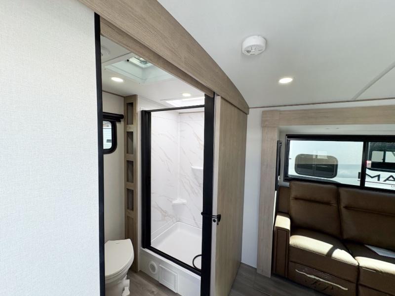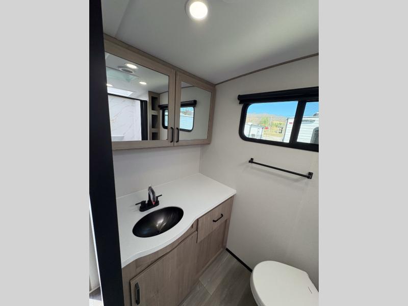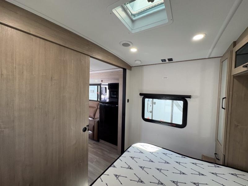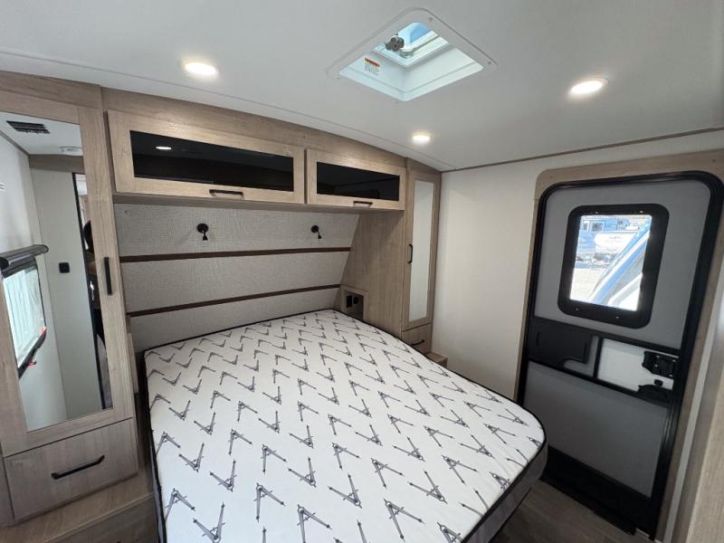 Escape to adventure with this fantastic travel trailer! The private bedroom features a plush 60" x 80" queen bed, spacious wardrobe, and TV prep for entertainment. The kitchen area is fitted with a pull-out pantry, 10 cu. refrigerator, microwave, and three-burner cooktop for gourmet meal prep. Enjoy extra counter space with the flip-up countertop extension, ideal for easy and comfortable cooking. Gather with family and friends at the theater dinette, featuring an LED HDTV for movie nights and game days after that, you can take a relaxing bath in the full rear bathroom, with ample storage. Stay organized on the go with pass-thru storage, 20” x 20” baggage door/trash can storage, and a spacious interior. Enjoy outdoor living under the shade of the 18’ awning, perfect for weekend getaways, or outdoor activities for the adventure-seekers.