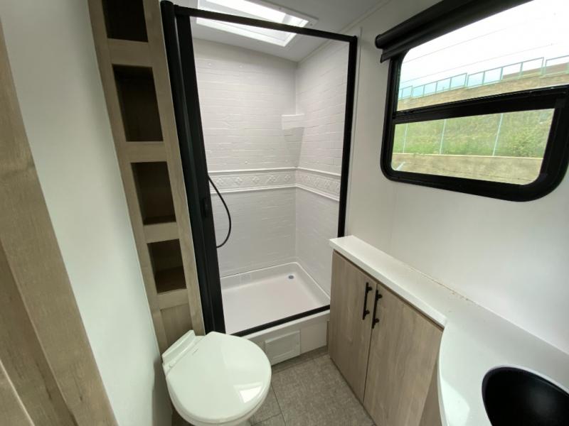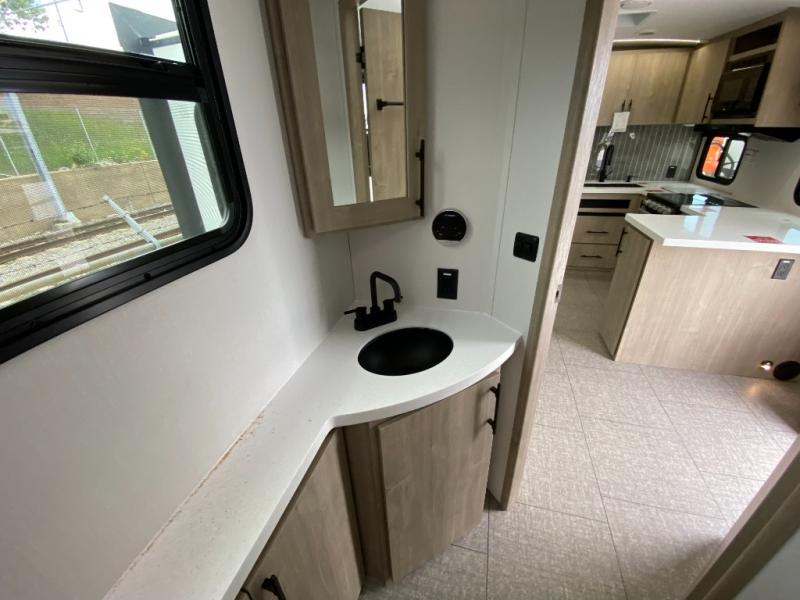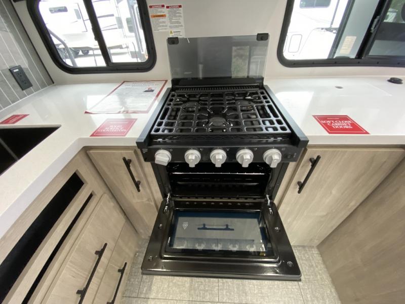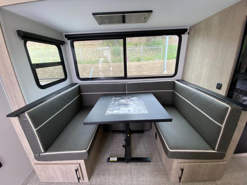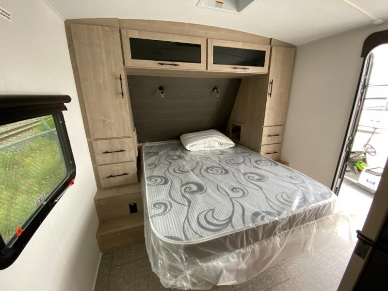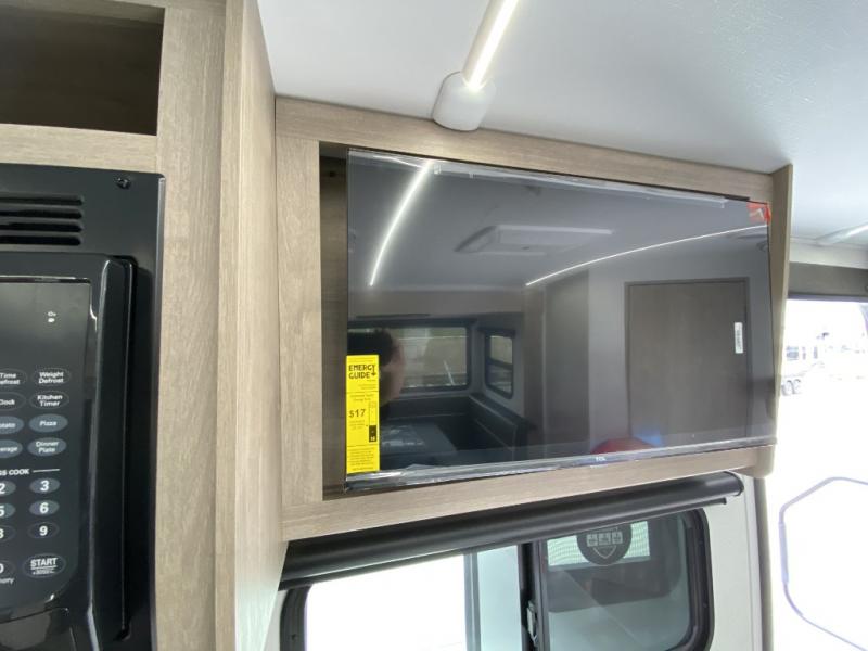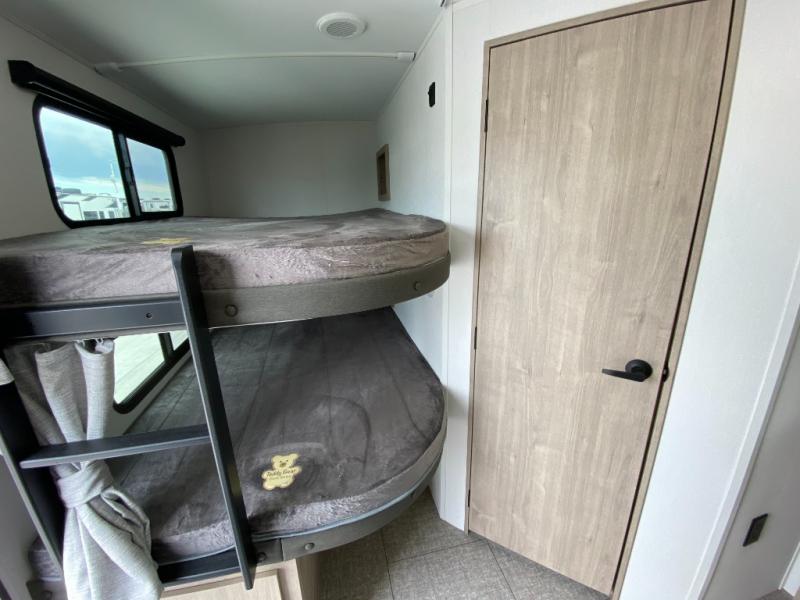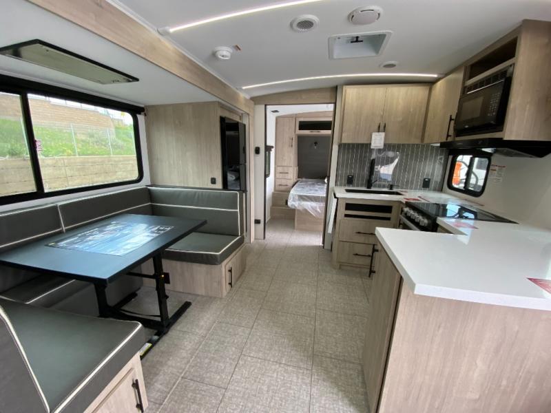 Unleash adventure with this incredible travel trailer! Sleep in style in the serene bedroom, featuring a plush queen bed, spacious wardrobe, and TV prep for entertainment. The kitchen is equipped with a pull-out pantry, 10 cu. refrigerator, microwave, and three-burner cooktop for delicious meal prep. Enjoy extra counter space with the flip-up countertop extension, optimal for easy and comfortable cooking. Family and friends can dine at the U-shaped dinette while watching the LED HDTV for added entertainment. The full bathroom offers a shower, and linen closet. Kids will love the double bunk bed, perfect for taking a nap. On the exterior, you will find the outdoor kitchen, pass-thru storage, and 20” x 20” baggage door/trash can storage, ideal for a better organization of your belongings. Finally, create outdoor activities without worrying about the weather thanks to the 19’ awning.
