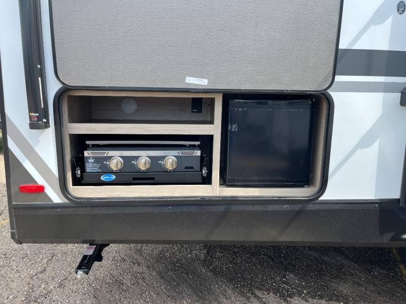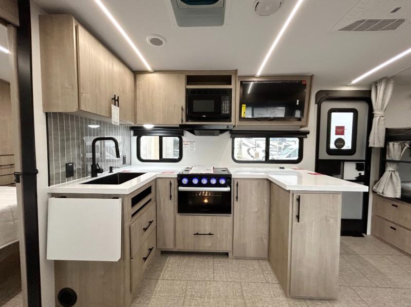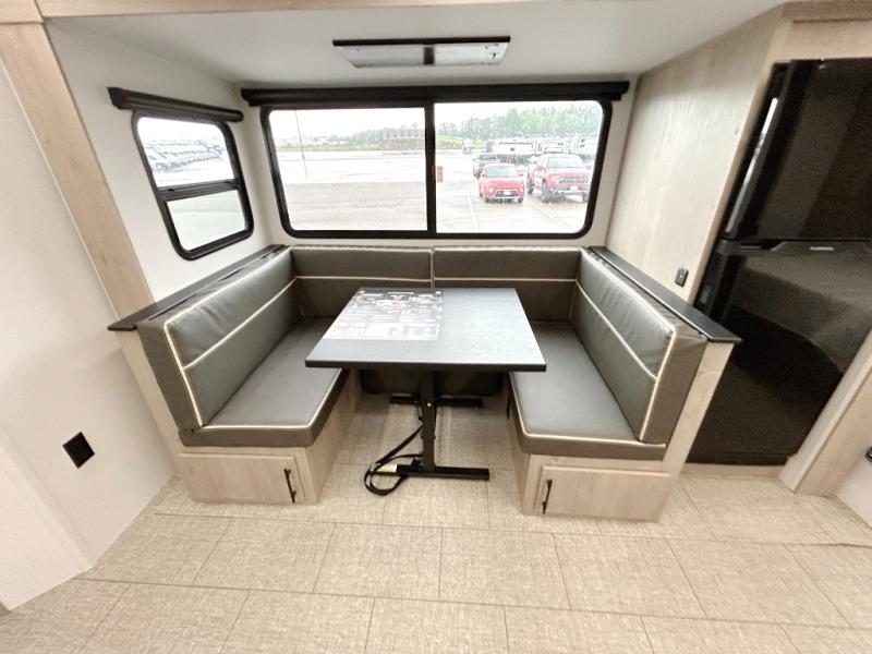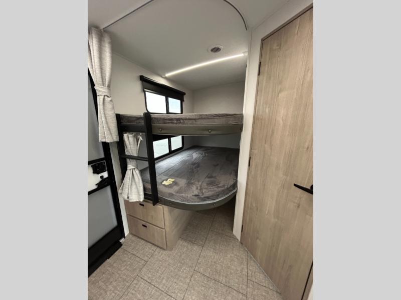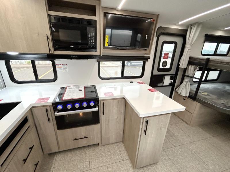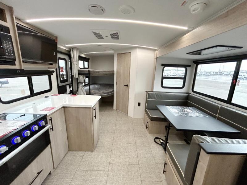 Unleash adventure with this incredible travel trailer! Sleep in style in the serene bedroom, featuring a plush queen bed, spacious wardrobe, and TV prep for entertainment. The kitchen is equipped with a pull-out pantry, 10 cu. refrigerator, microwave, and three-burner cooktop for delicious meal prep. Enjoy extra counter space with the flip-up countertop extension, optimal for easy and comfortable cooking. Family and friends can dine at the U-shaped dinette while watching the LED HDTV for added entertainment. The full bathroom offers a shower, and linen closet. Kids will love the double bunk bed, perfect for taking a nap. On the exterior, you will find the outdoor kitchen, pass-thru storage, and 20” x 20” baggage door/trash can storage, ideal for a better organization of your belongings. Finally, create outdoor activities without worrying about the weather thanks to the 19’ awning.