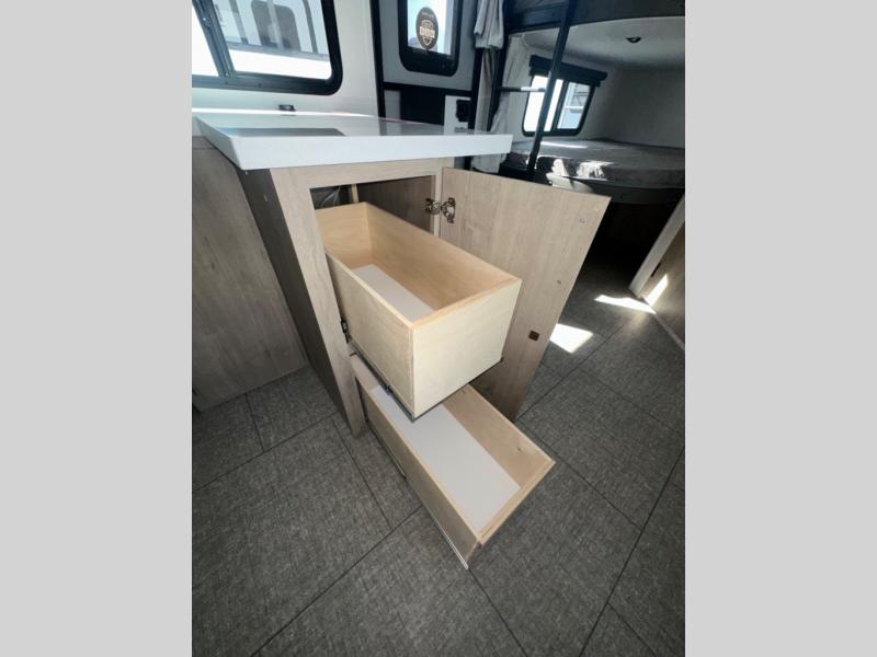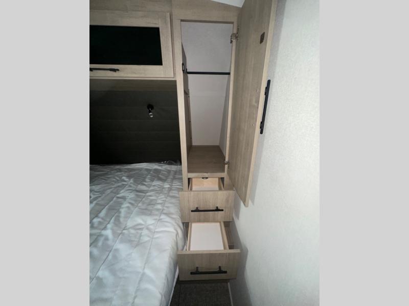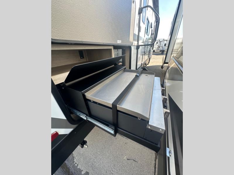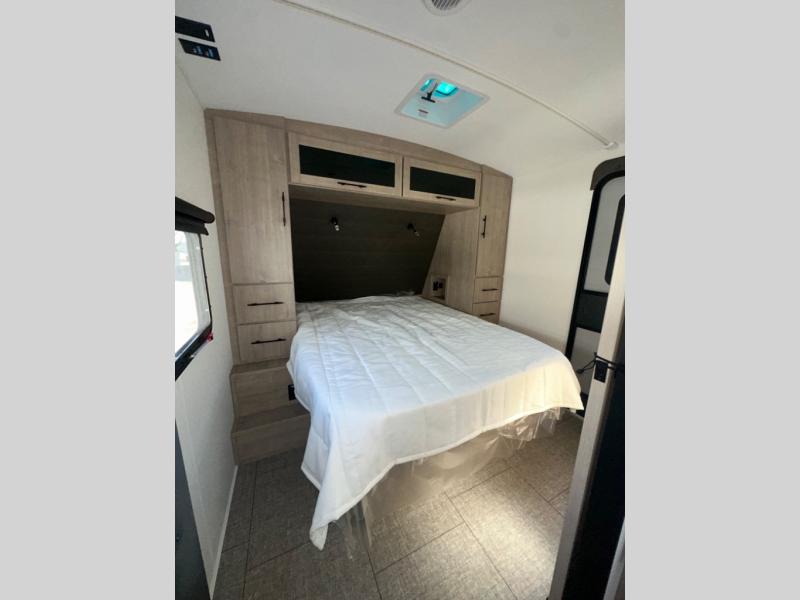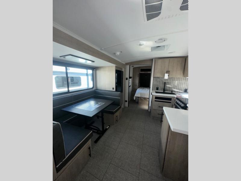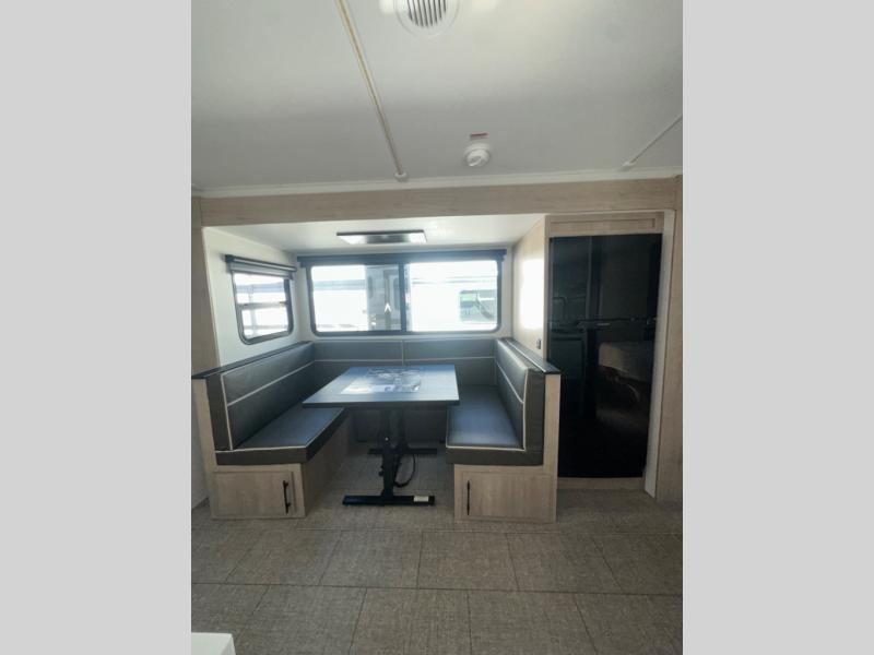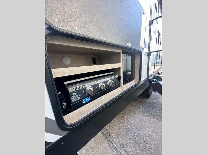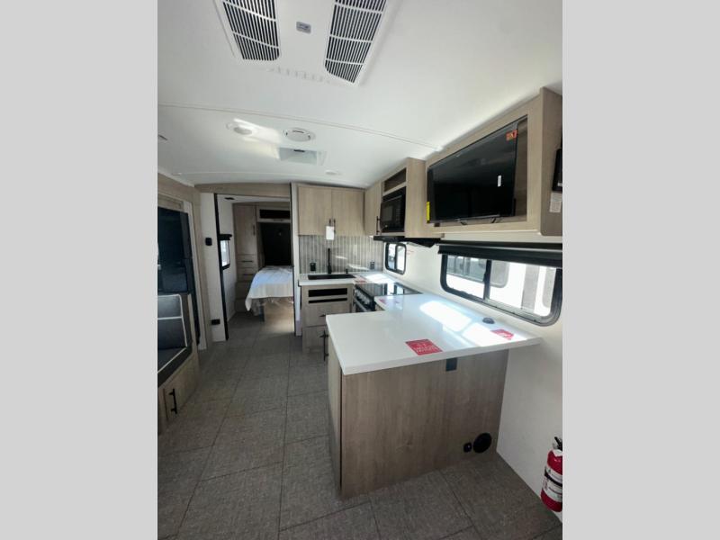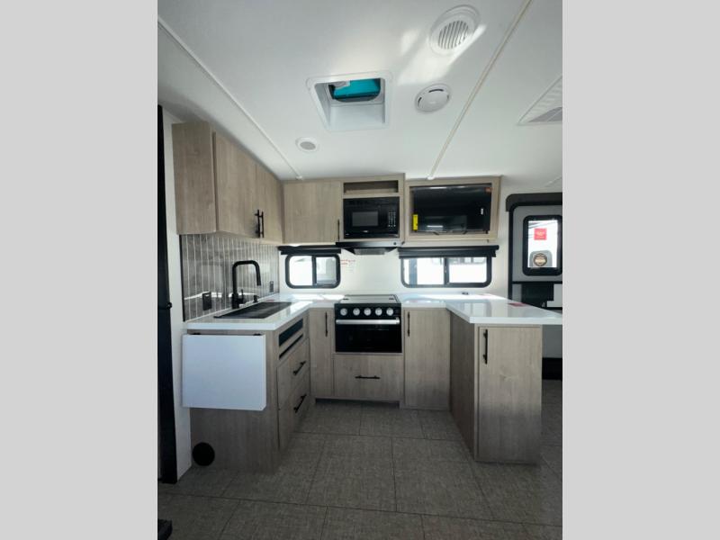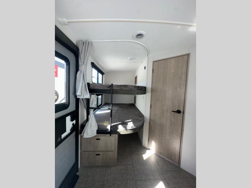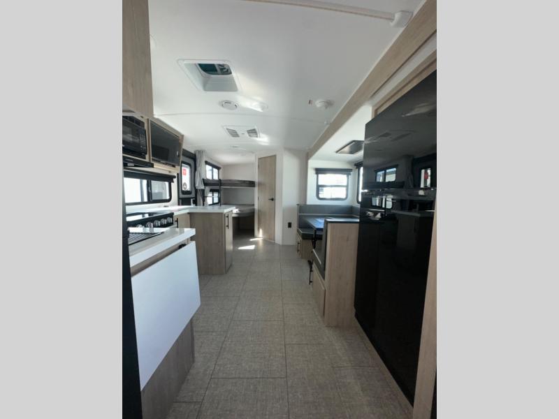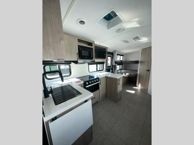 Unleash adventure with this incredible travel trailer! Sleep in style in the serene bedroom, featuring a plush queen bed, spacious wardrobe, and TV prep for entertainment. The kitchen is equipped with a pull-out pantry, 10 cu. refrigerator, microwave, and three-burner cooktop for delicious meal prep. Enjoy extra counter space with the flip-up countertop extension, optimal for easy and comfortable cooking. Family and friends can dine at the U-shaped dinette while watching the LED HDTV for added entertainment. The full bathroom offers a shower, and linen closet. Kids will love the double bunk bed, perfect for taking a nap. On the exterior, you will find the outdoor kitchen, pass-thru storage, and 20” x 20” baggage door/trash can storage, ideal for a better organization of your belongings. Finally, create outdoor activities without worrying about the weather thanks to the 19’ awning.