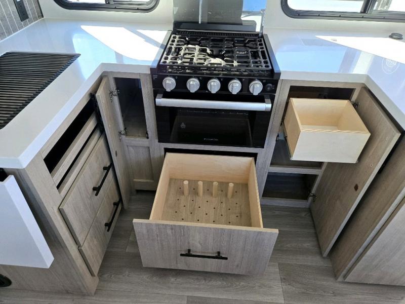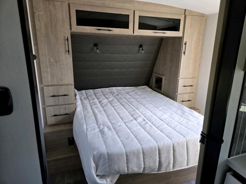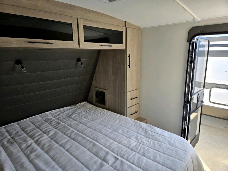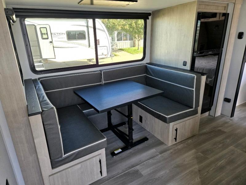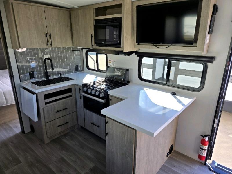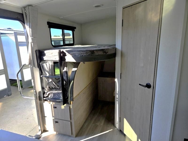 Unleash adventure with this incredible travel trailer! Sleep in style in the serene bedroom, featuring a plush queen bed, spacious wardrobe, and TV prep for entertainment. The kitchen is equipped with a pull-out pantry, 10 cu. refrigerator, microwave, and three-burner cooktop for delicious meal prep. Enjoy extra counter space with the flip-up countertop extension, optimal for easy and comfortable cooking. Family and friends can dine at the U-shaped dinette while watching the LED HDTV for added entertainment. The full bathroom offers a shower, and linen closet. Kids will love the double bunk bed, perfect for taking a nap. On the exterior, you will find the outdoor kitchen, pass-thru storage, and 20” x 20” baggage door/trash can storage, ideal for a better organization of your belongings. Finally, create outdoor activities without worrying about the weather thanks to the 19’ awning.
