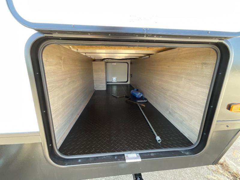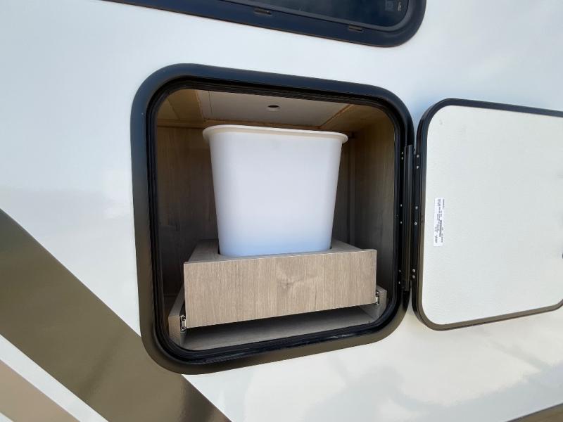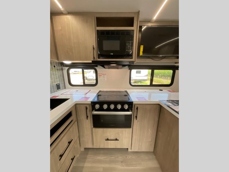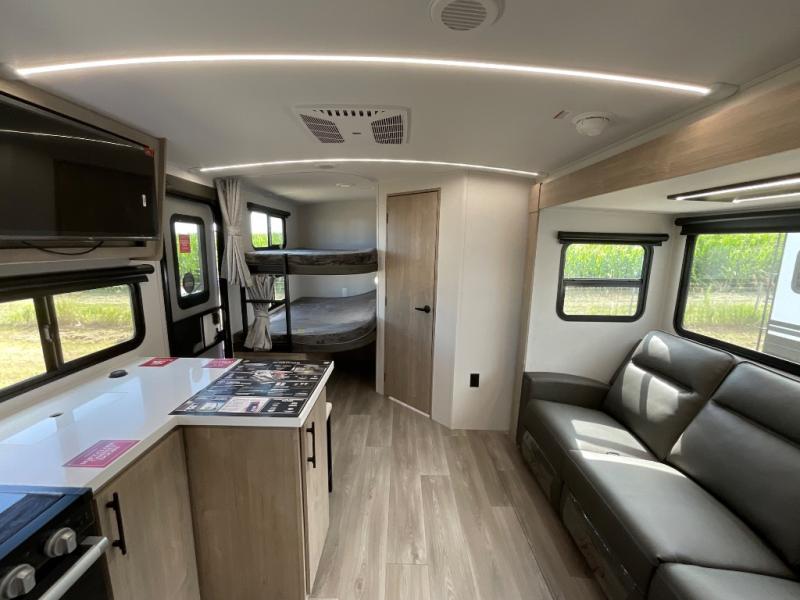 Unleash adventure with this incredible travel trailer! Sleep in style in the serene bedroom, featuring a plush queen bed, spacious wardrobe, and TV prep for entertainment. The kitchen is equipped with a pull-out pantry, 10 cu. refrigerator, microwave, and three-burner cooktop for delicious meal prep. Enjoy extra counter space with the flip-up countertop extension, optimal for easy and comfortable cooking. Family and friends can dine at the U-shaped dinette while watching the LED HDTV for added entertainment. The full bathroom offers a shower, and linen closet. Kids will love the double bunk bed, perfect for taking a nap. On the exterior, you will find the outdoor kitchen, pass-thru storage, and 20” x 20” baggage door/trash can storage, ideal for a better organization of your belongings. Finally, create outdoor activities without worrying about the weather thanks to the 19’ awning.