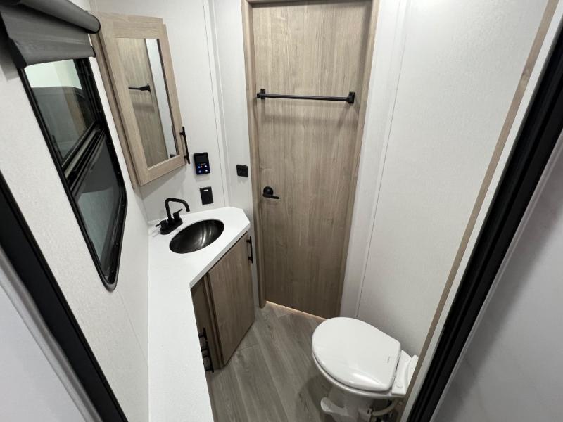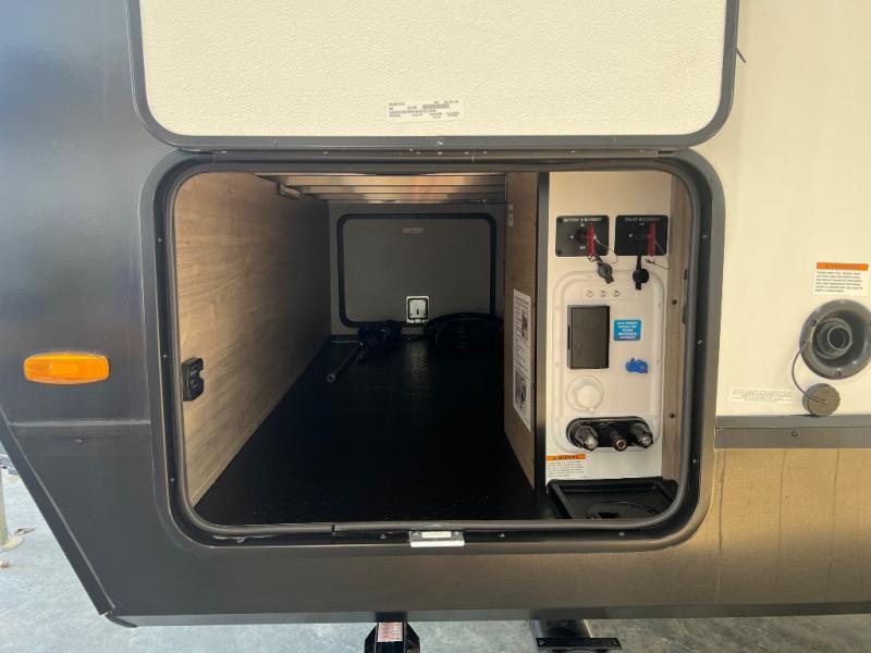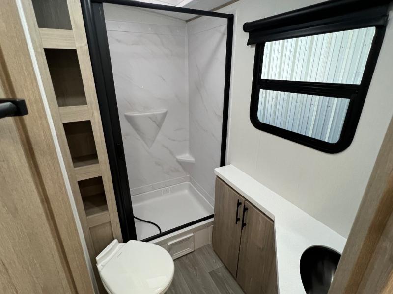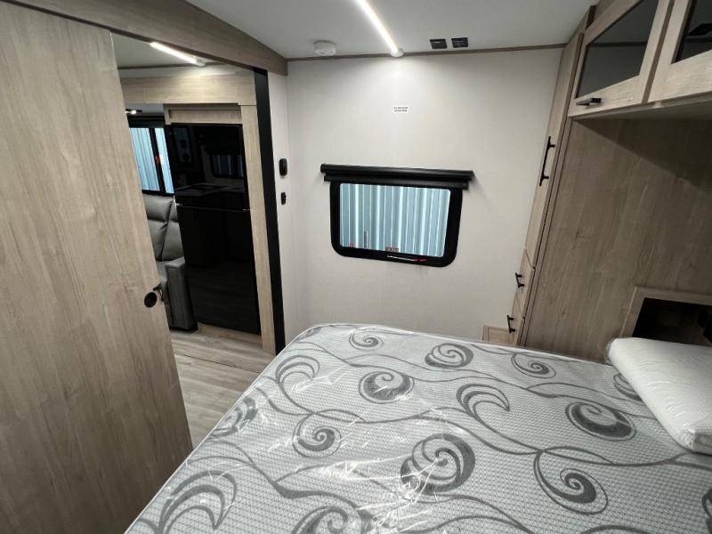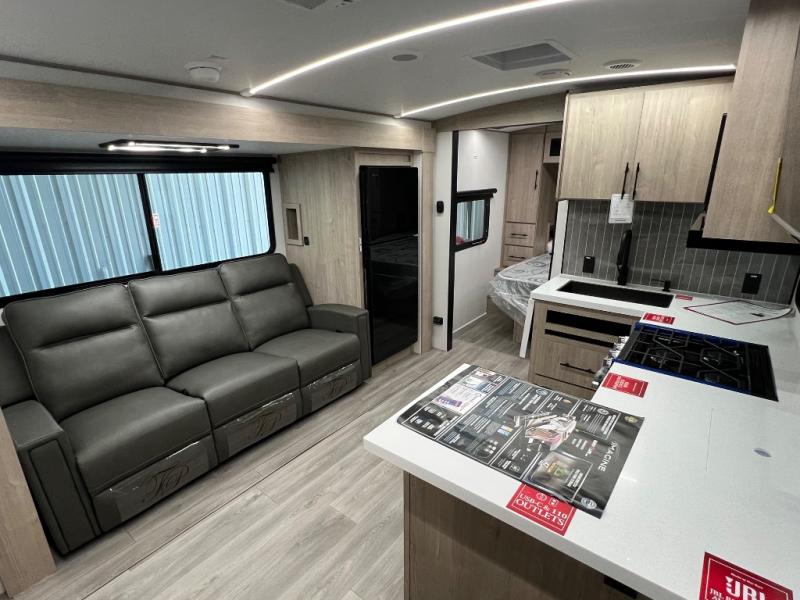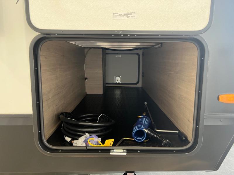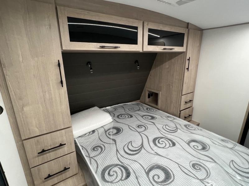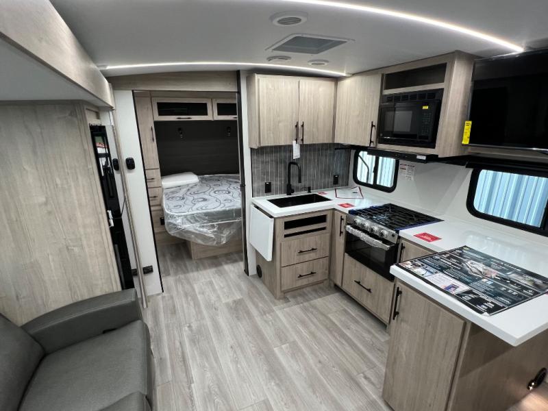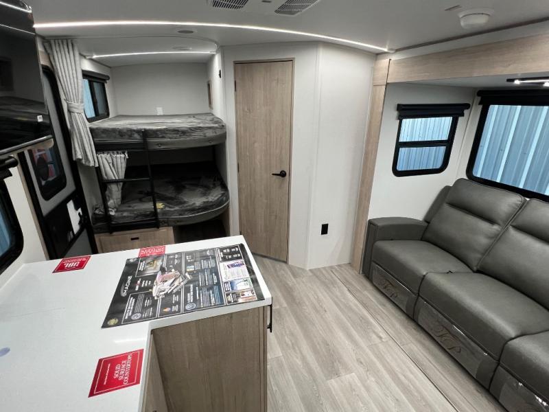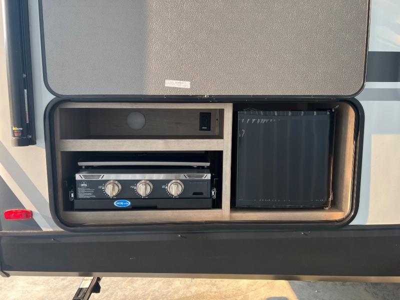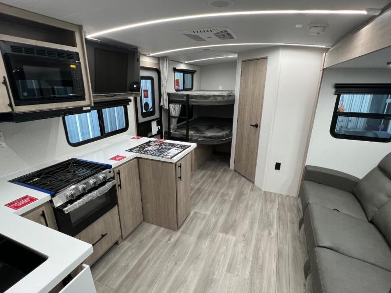 Unleash adventure with this incredible travel trailer! Sleep in style in the serene bedroom, featuring a plush queen bed, spacious wardrobe, and TV prep for entertainment. The kitchen is equipped with a pull-out pantry, 10 cu. refrigerator, microwave, and three-burner cooktop for delicious meal prep. Enjoy extra counter space with the flip-up countertop extension, optimal for easy and comfortable cooking. Family and friends can dine at the U-shaped dinette while watching the LED HDTV for added entertainment. The full bathroom offers a shower, and linen closet. Kids will love the double bunk bed, perfect for taking a nap. On the exterior, you will find the outdoor kitchen, pass-thru storage, and 20” x 20” baggage door/trash can storage, ideal for a better organization of your belongings. Finally, create outdoor activities without worrying about the weather thanks to the 19’ awning.
