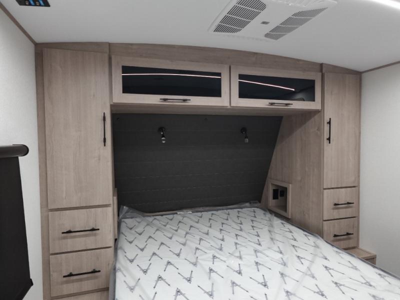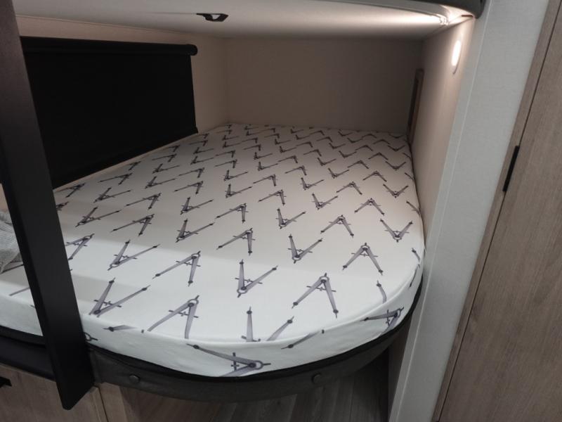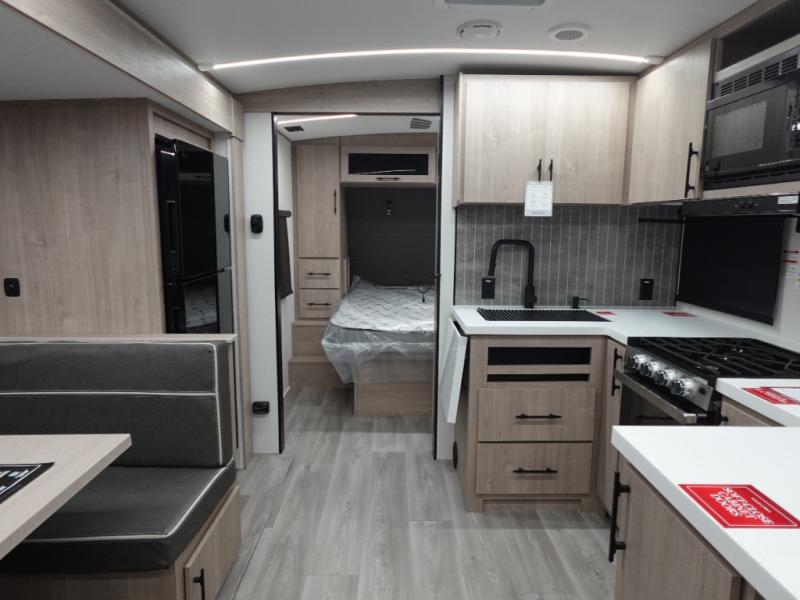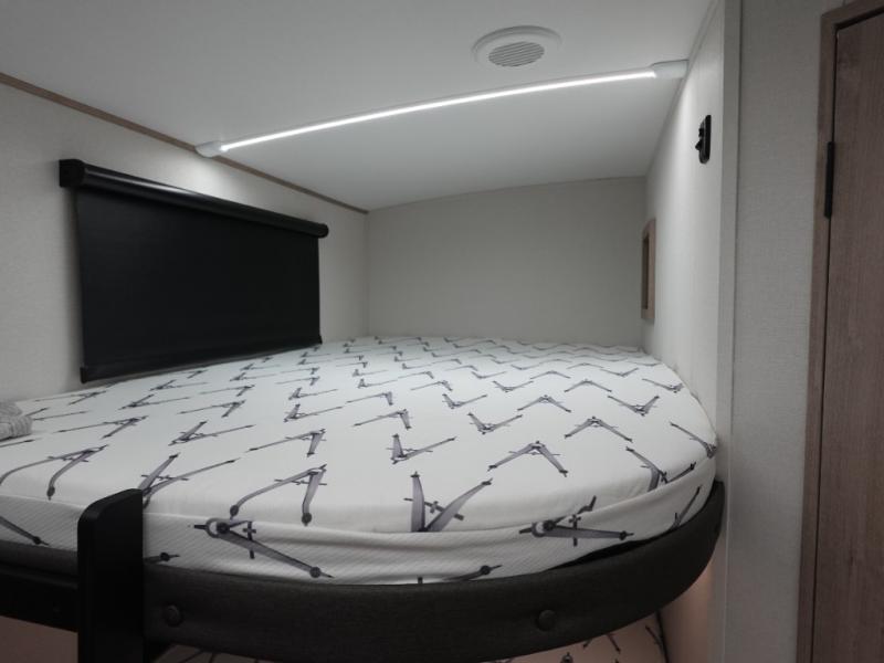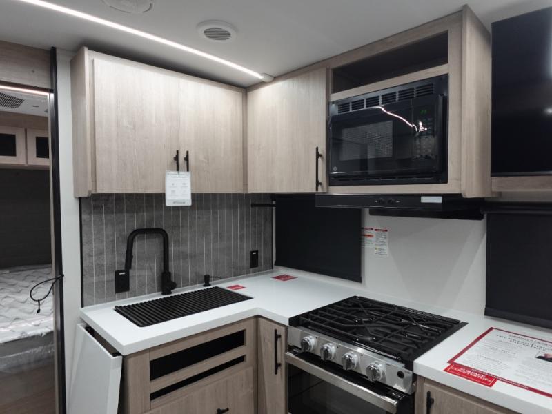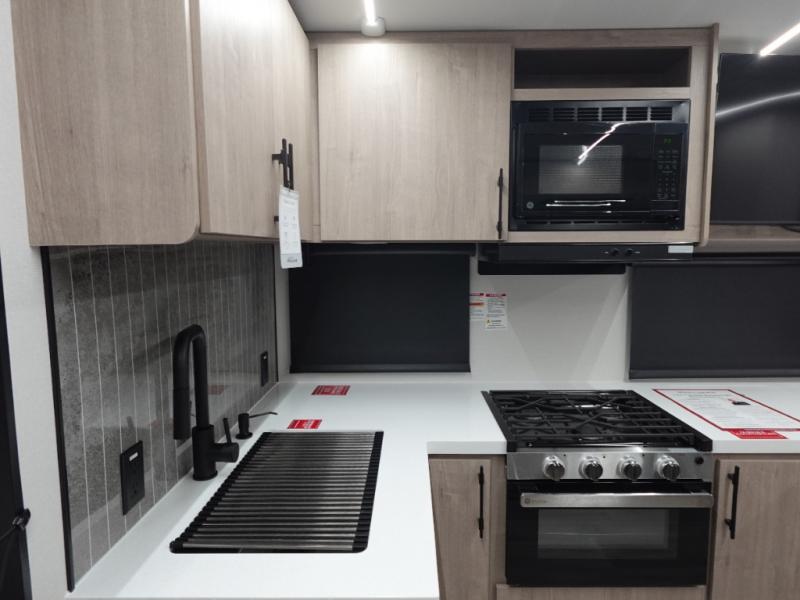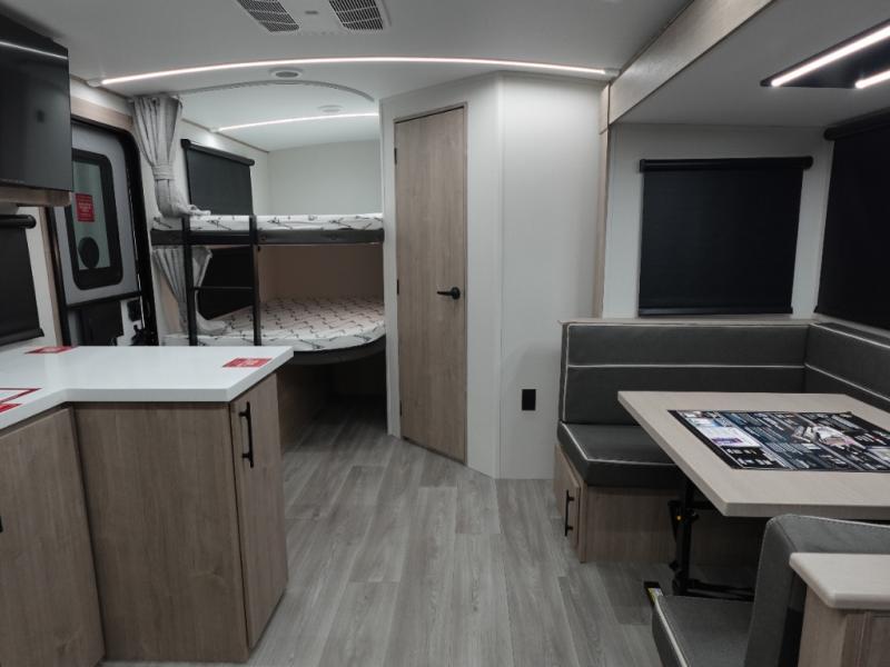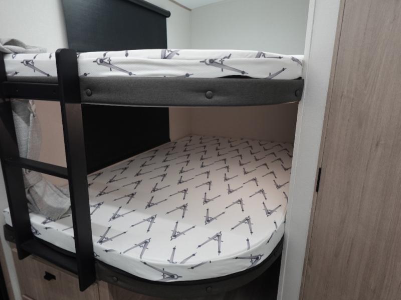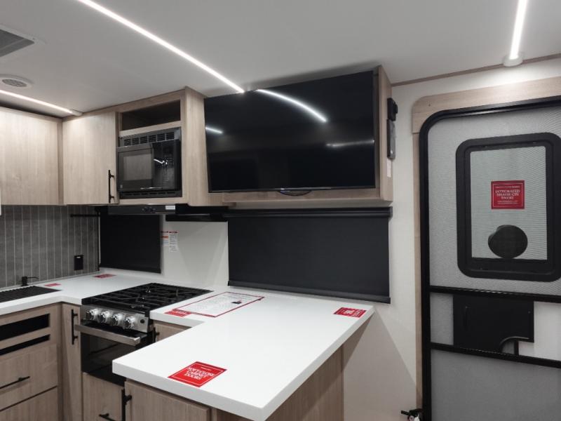 Unleash adventure with this incredible travel trailer! Sleep in style in the serene bedroom, featuring a plush queen bed, spacious wardrobe, and TV prep for entertainment. The kitchen is equipped with a pull-out pantry, 10 cu. refrigerator, microwave, and three-burner cooktop for delicious meal prep. Enjoy extra counter space with the flip-up countertop extension, optimal for easy and comfortable cooking. Family and friends can dine at the U-shaped dinette while watching the LED HDTV for added entertainment. The full bathroom offers a shower, and linen closet. Kids will love the double bunk bed, perfect for taking a nap. On the exterior, you will find the outdoor kitchen, pass-thru storage, and 20” x 20” baggage door/trash can storage, ideal for a better organization of your belongings. Finally, create outdoor activities without worrying about the weather thanks to the 19’ awning.