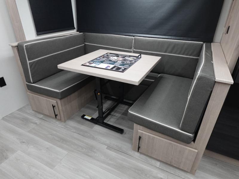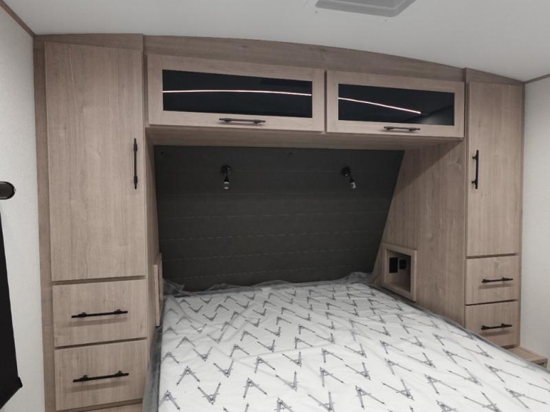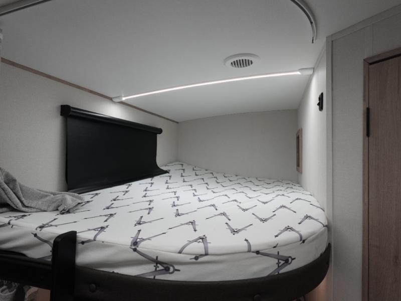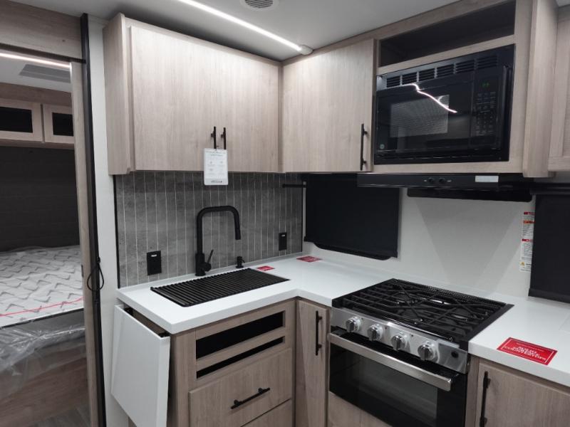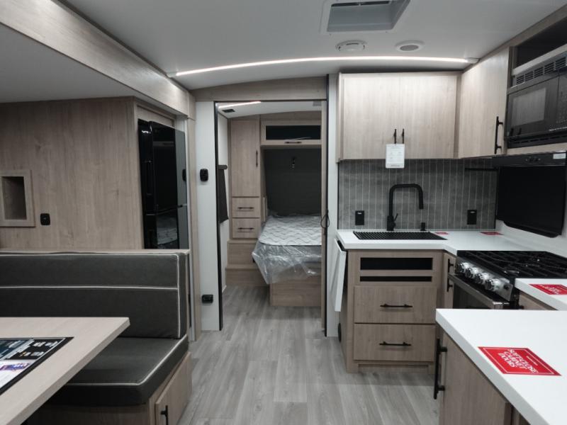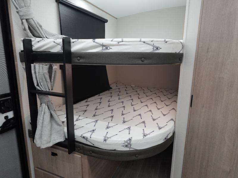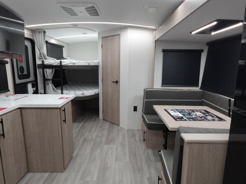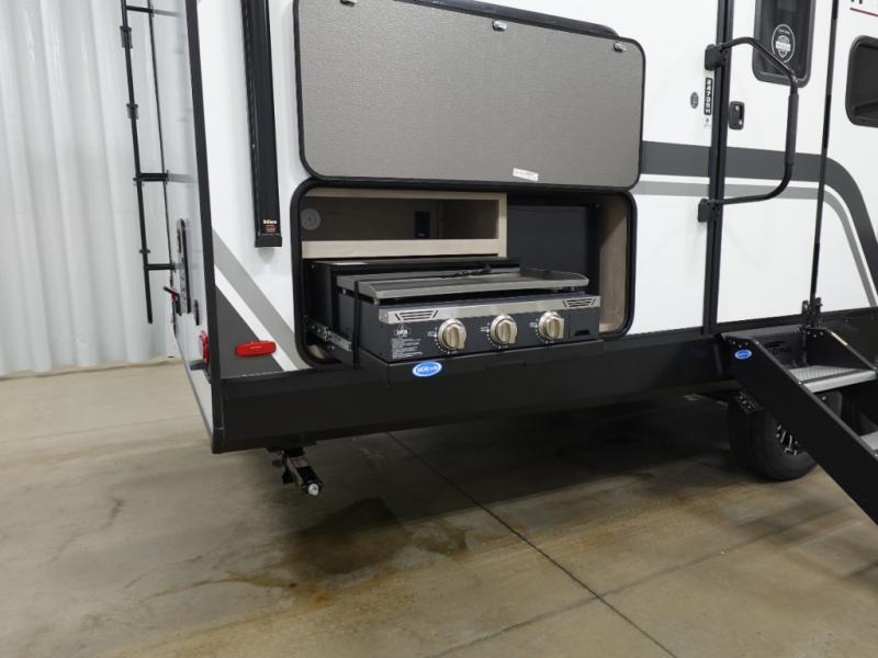 Unleash adventure with this incredible travel trailer! Sleep in style in the serene bedroom, featuring a plush queen bed, spacious wardrobe, and TV prep for entertainment. The kitchen is equipped with a pull-out pantry, 10 cu. refrigerator, microwave, and three-burner cooktop for delicious meal prep. Enjoy extra counter space with the flip-up countertop extension, optimal for easy and comfortable cooking. Family and friends can dine at the U-shaped dinette while watching the LED HDTV for added entertainment. The full bathroom offers a shower, and linen closet. Kids will love the double bunk bed, perfect for taking a nap. On the exterior, you will find the outdoor kitchen, pass-thru storage, and 20” x 20” baggage door/trash can storage, ideal for a better organization of your belongings. Finally, create outdoor activities without worrying about the weather thanks to the 19’ awning.