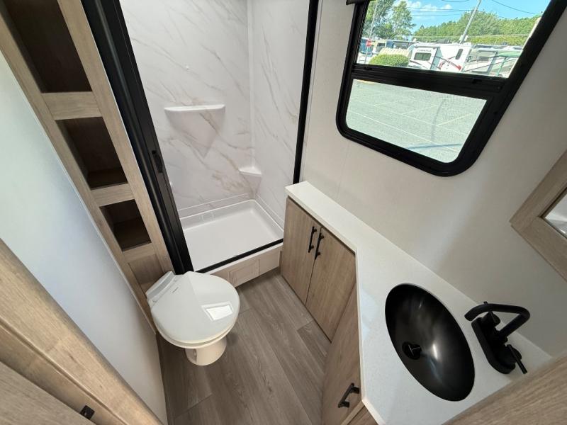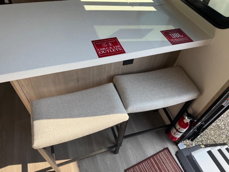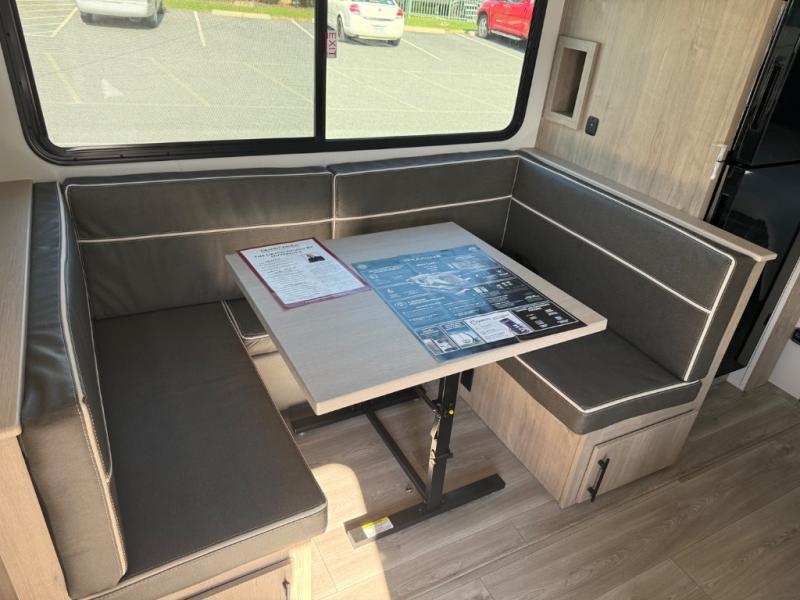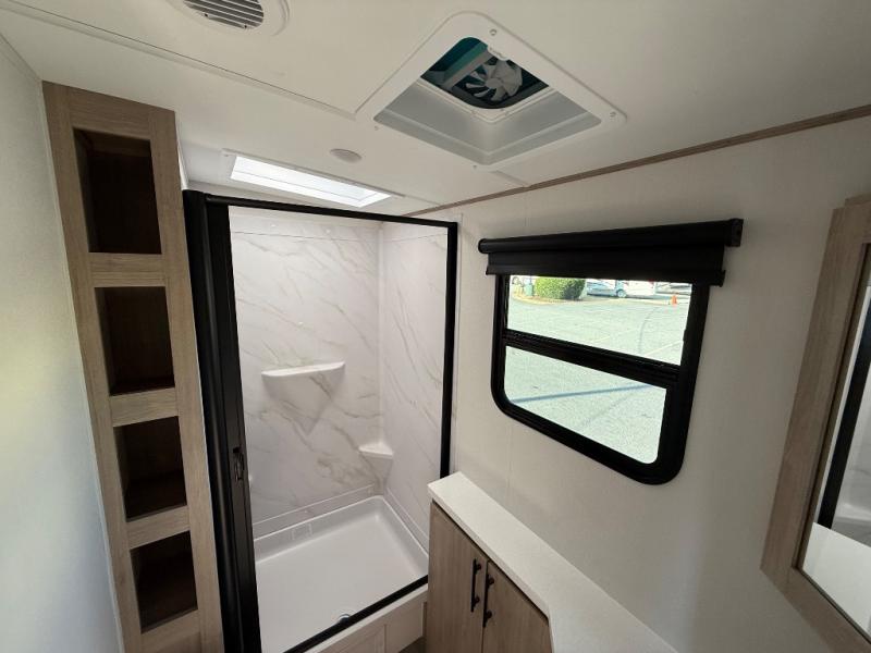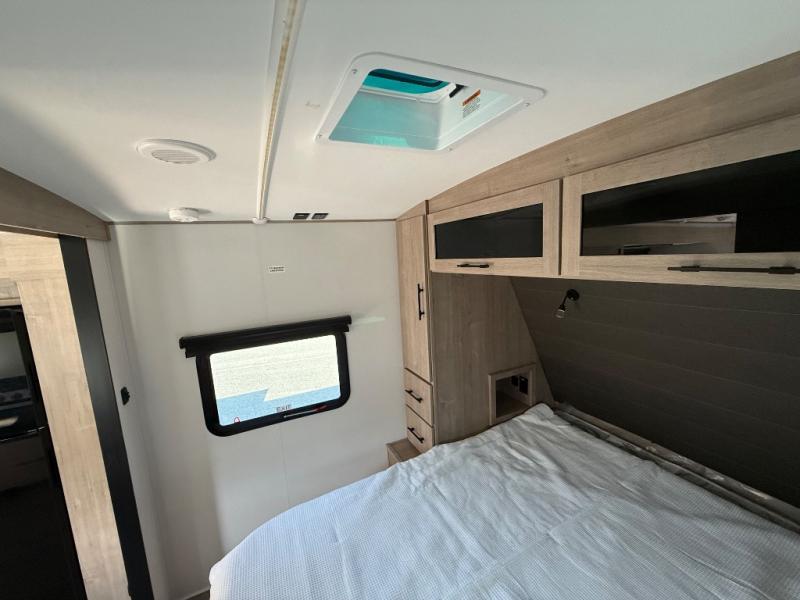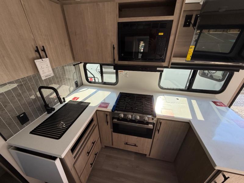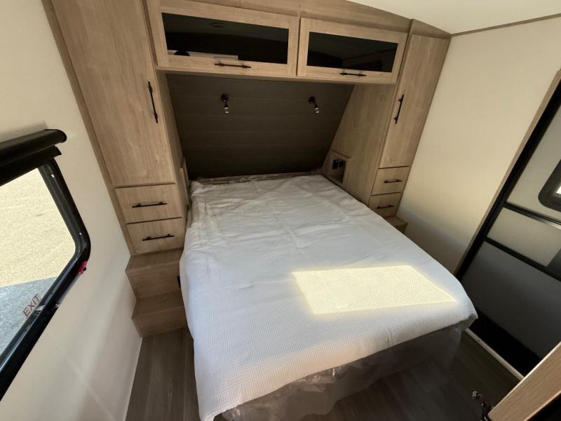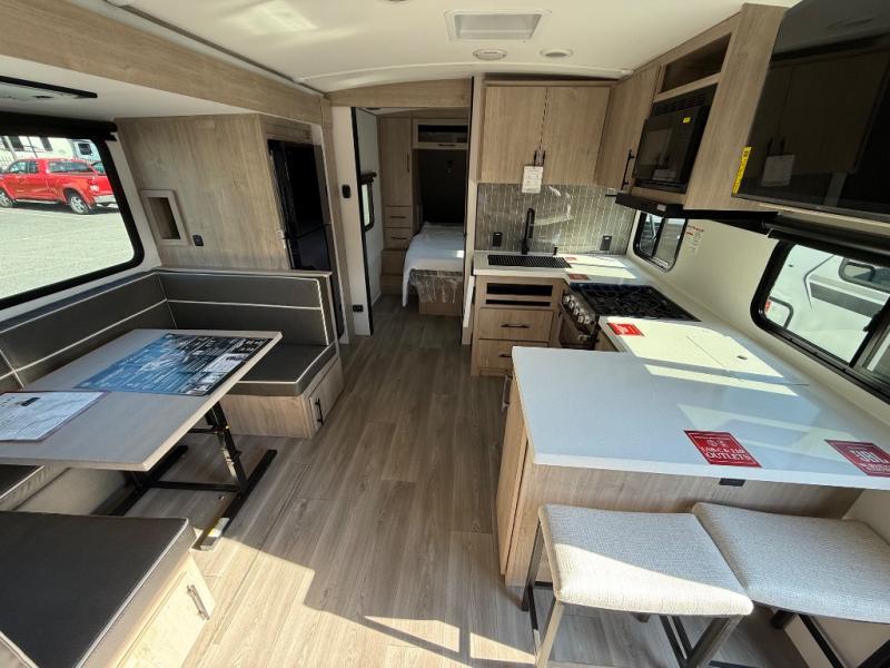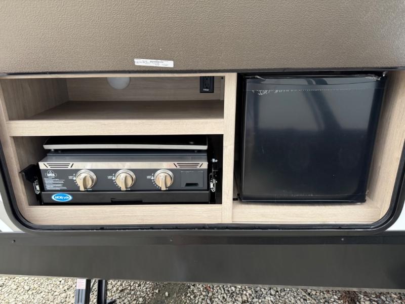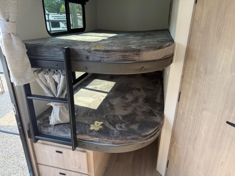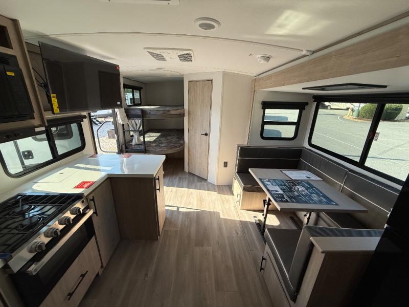 Unleash adventure with this incredible travel trailer! Sleep in style in the serene bedroom, featuring a plush queen bed, spacious wardrobe, and TV prep for entertainment. The kitchen is equipped with a pull-out pantry, 10 cu. refrigerator, microwave, and three-burner cooktop for delicious meal prep. Enjoy extra counter space with the flip-up countertop extension, optimal for easy and comfortable cooking. Family and friends can dine at the U-shaped dinette while watching the LED HDTV for added entertainment. The full bathroom offers a shower, and linen closet. Kids will love the double bunk bed, perfect for taking a nap. On the exterior, you will find the outdoor kitchen, pass-thru storage, and 20” x 20” baggage door/trash can storage, ideal for a better organization of your belongings. Finally, create outdoor activities without worrying about the weather thanks to the 19’ awning.