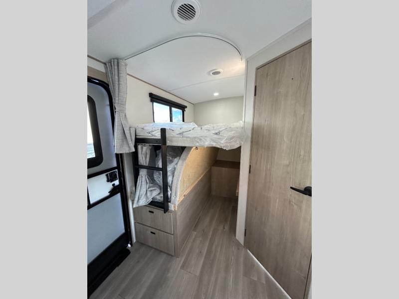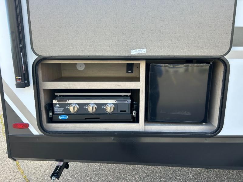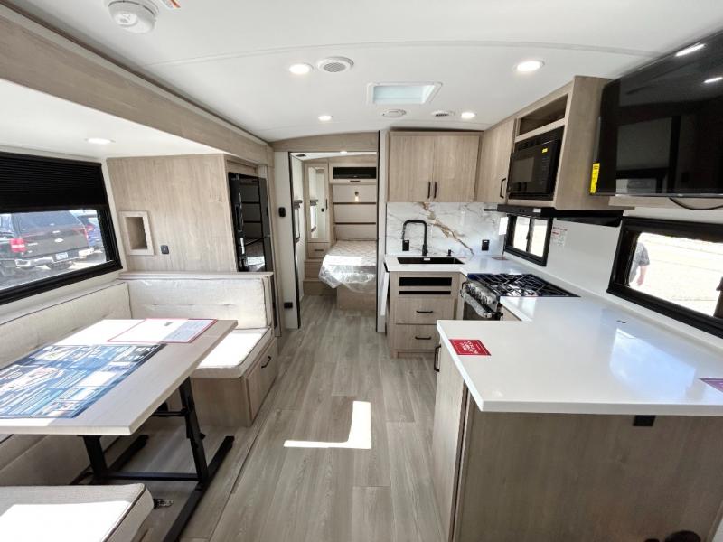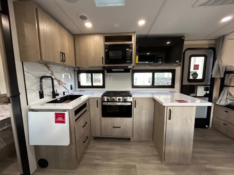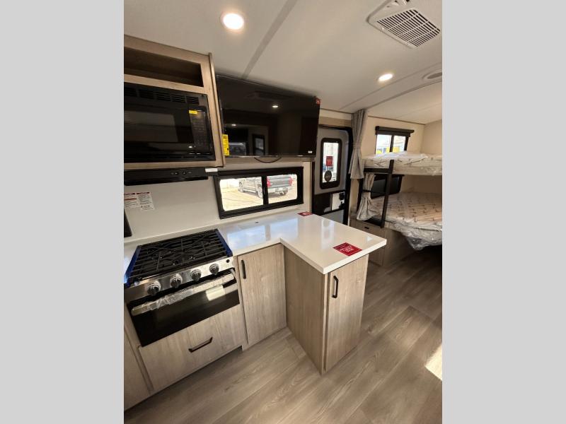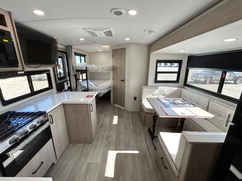 Unleash adventure with this incredible travel trailer! Sleep in style in the serene bedroom, featuring a plush queen bed, spacious wardrobe, and TV prep for entertainment. The kitchen is equipped with a pull-out pantry, 10 cu. refrigerator, microwave, and three-burner cooktop for delicious meal prep. Enjoy extra counter space with the flip-up countertop extension, optimal for easy and comfortable cooking. Family and friends can dine at the U-shaped dinette while watching the LED HDTV for added entertainment. The full bathroom offers a shower, and linen closet. Kids will love the double bunk bed, perfect for taking a nap. On the exterior, you will find the outdoor kitchen, pass-thru storage, and 20” x 20” baggage door/trash can storage, ideal for a better organization of your belongings. Finally, create outdoor activities without worrying about the weather thanks to the 19’ awning.