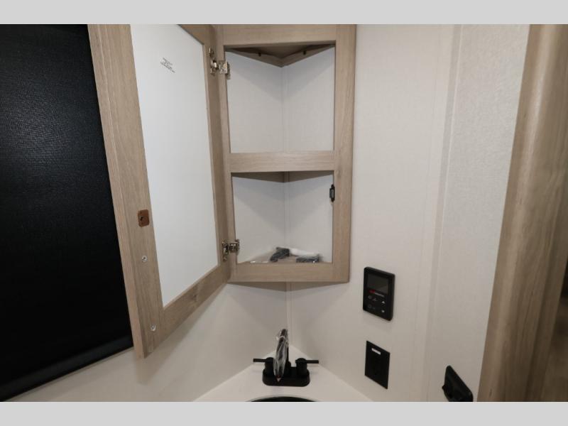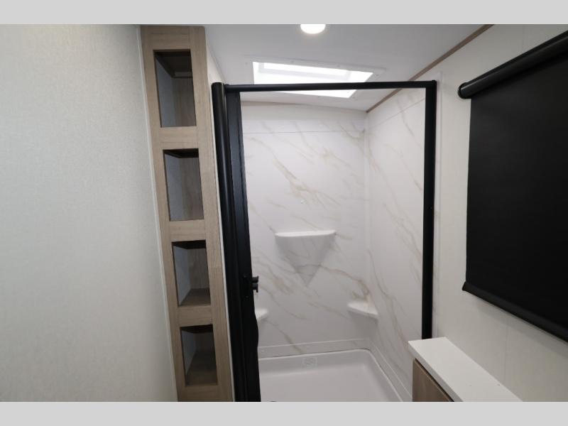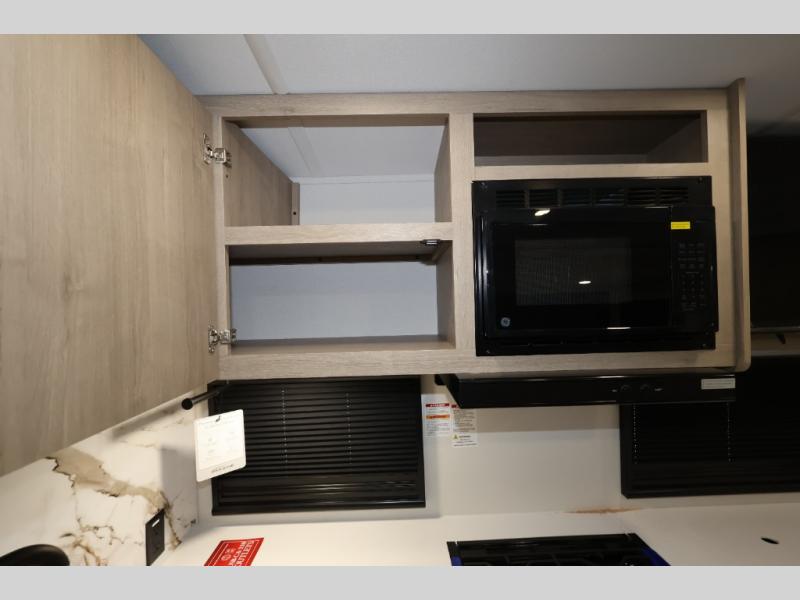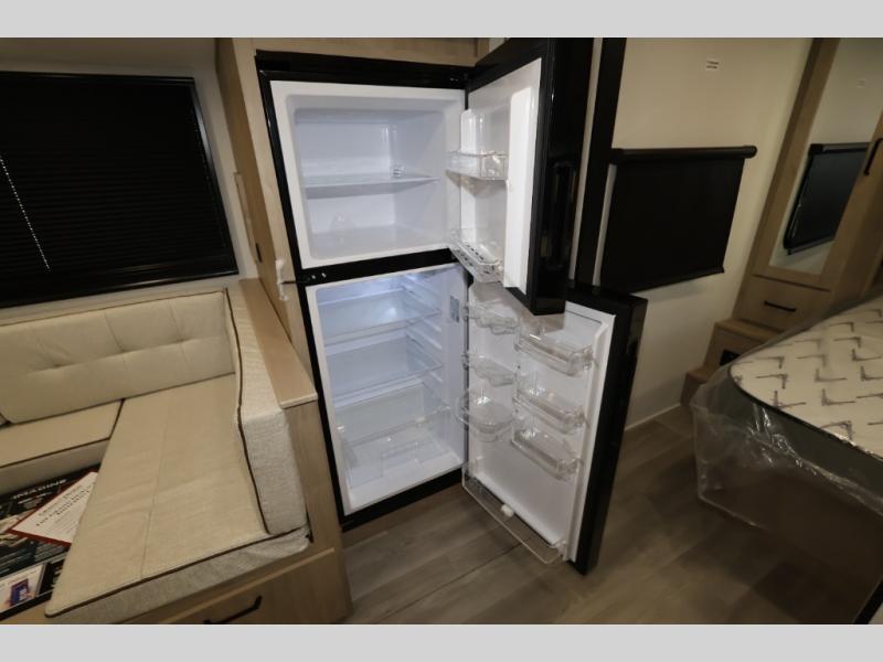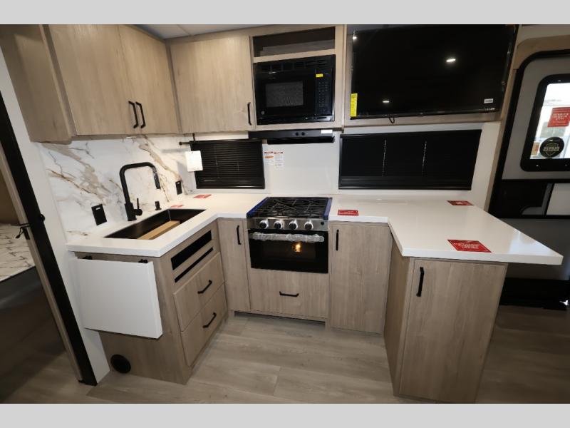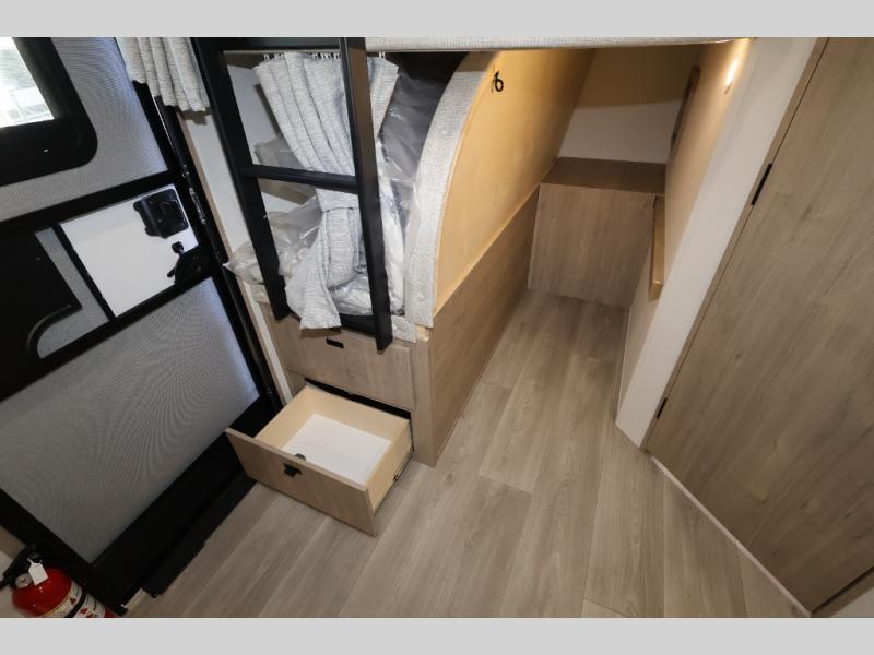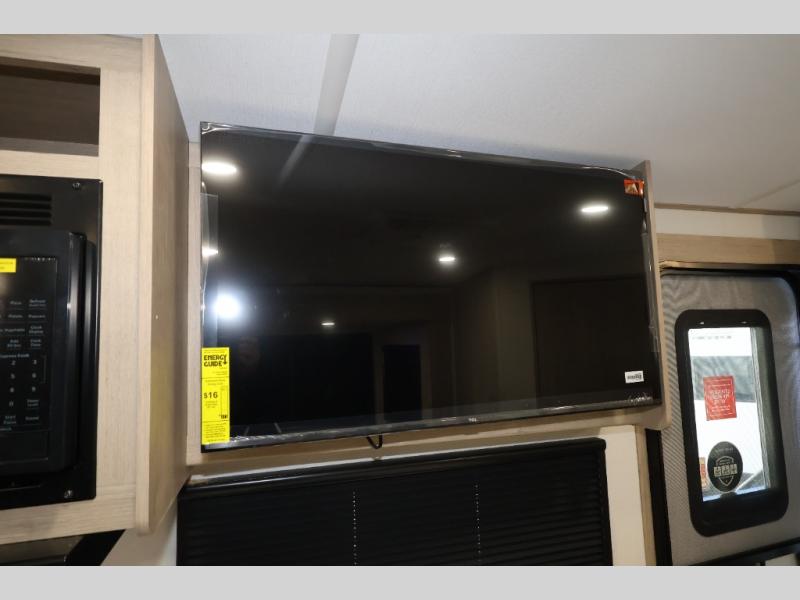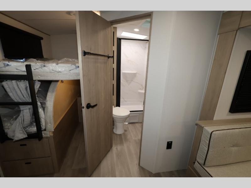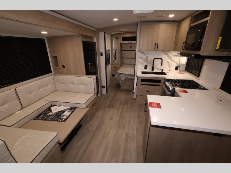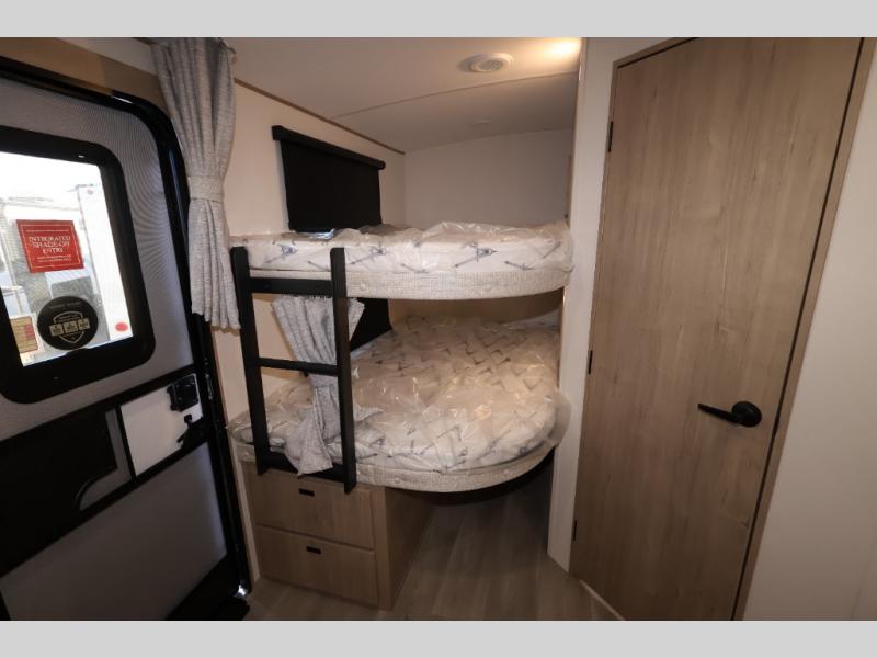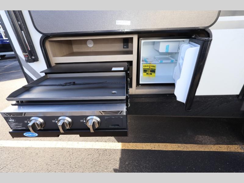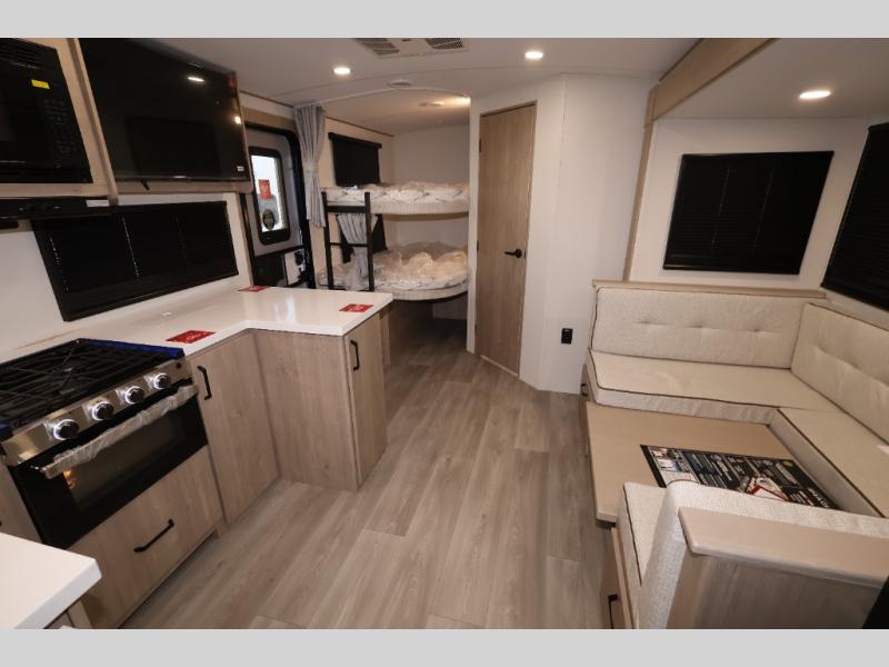 Unleash adventure with this incredible travel trailer! Sleep in style in the serene bedroom, featuring a plush queen bed, spacious wardrobe, and TV prep for entertainment. The kitchen is equipped with a pull-out pantry, 10 cu. refrigerator, microwave, and three-burner cooktop for delicious meal prep. Enjoy extra counter space with the flip-up countertop extension, optimal for easy and comfortable cooking. Family and friends can dine at the U-shaped dinette while watching TV for added entertainment. The full bathroom offers a shower, and linen closet. Kids will love the double bunk bed, perfect for taking a nap. On the exterior, you will find the outdoor griddle and a small refrigerator, pass-thru storage, and 20” x 20” baggage door/trash can storage, ideal for a better organization of your belongings. Finally, create outdoor activities without worrying about the weather thanks to the adjustable power awning with LED lights
