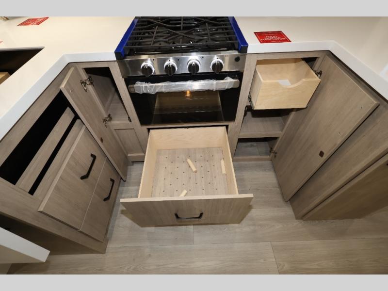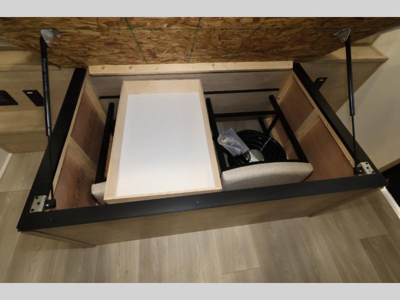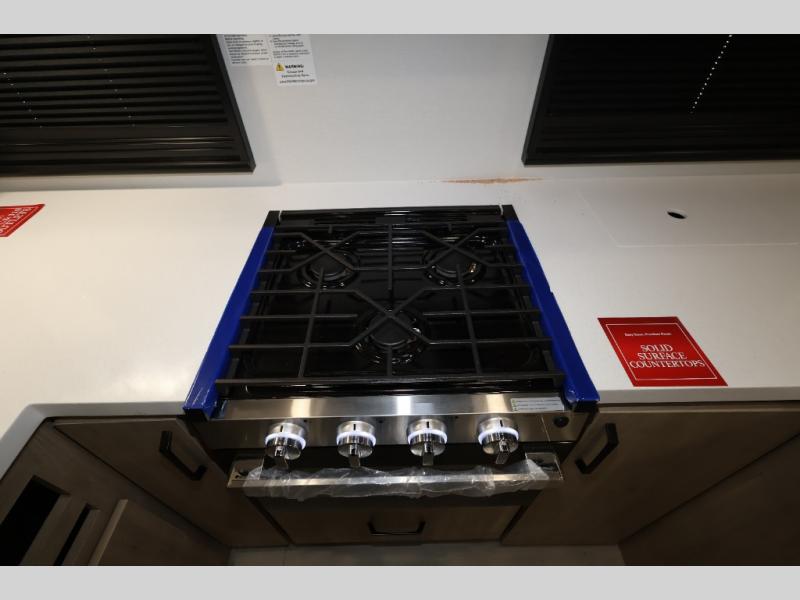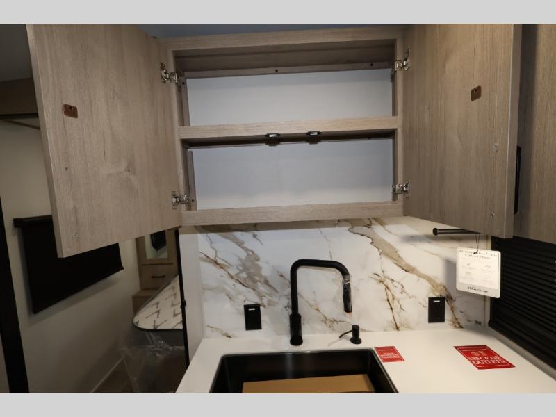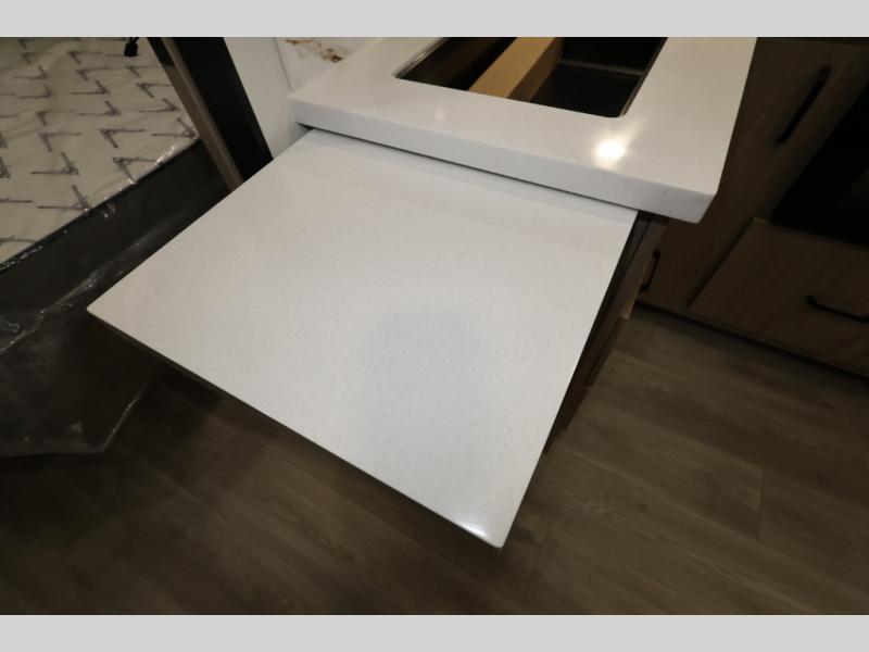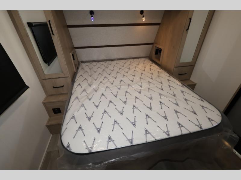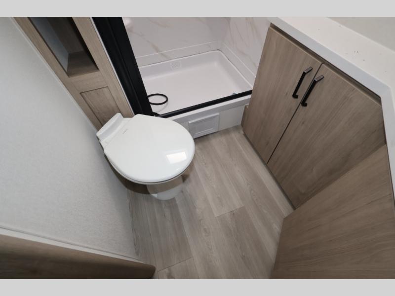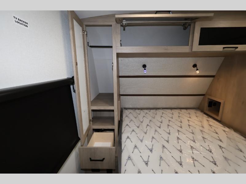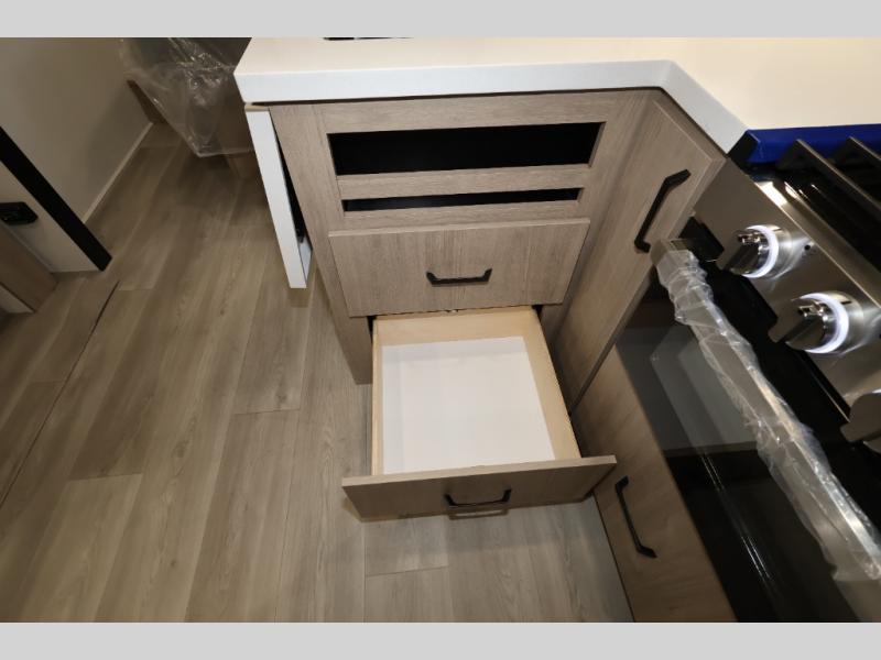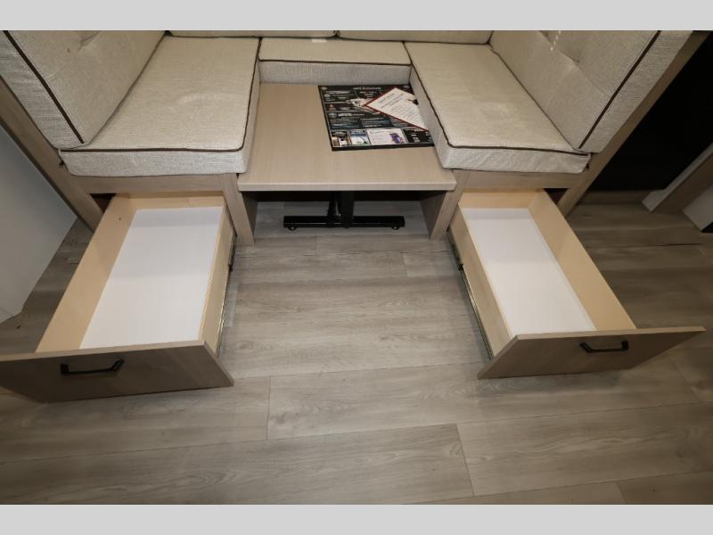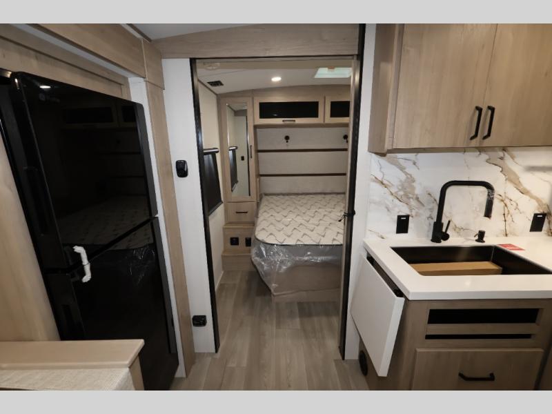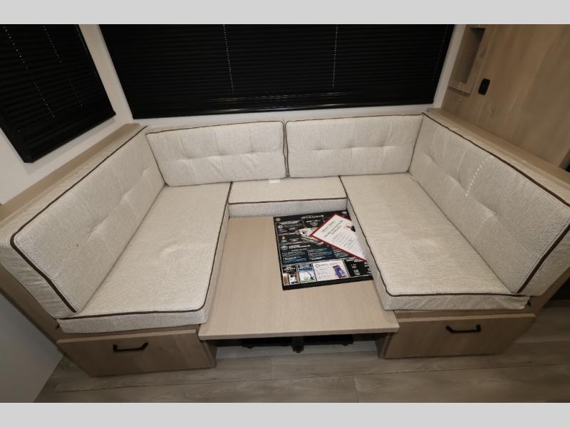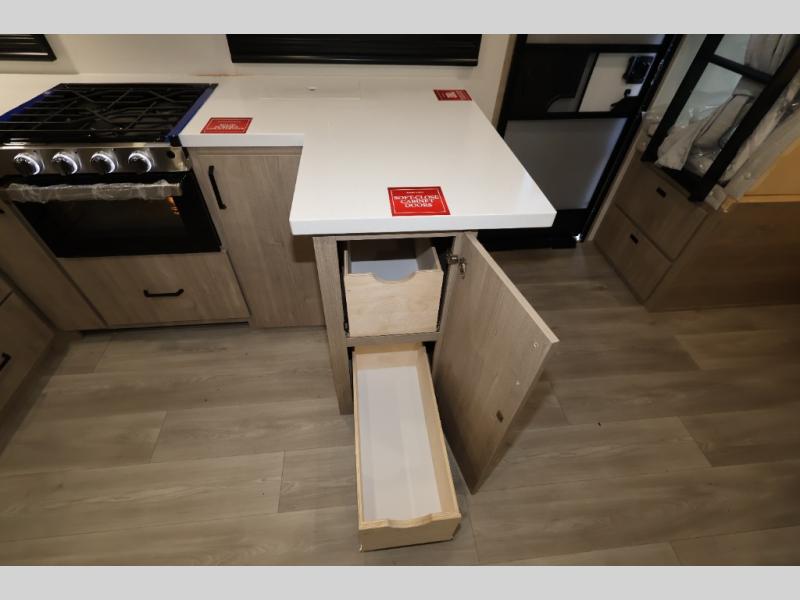 Unleash adventure with this incredible travel trailer! Sleep in style in the serene bedroom, featuring a plush queen bed, spacious wardrobe, and TV prep for entertainment. The kitchen is equipped with a pull-out pantry, 10 cu. refrigerator, microwave, and three-burner cooktop for delicious meal prep. Enjoy extra counter space with the flip-up countertop extension, optimal for easy and comfortable cooking. Family and friends can dine at the U-shaped dinette while watching TV for added entertainment. The full bathroom offers a shower, and linen closet. Kids will love the double bunk bed, perfect for taking a nap. On the exterior, you will find the outdoor griddle and a small refrigerator, pass-thru storage, and 20” x 20” baggage door/trash can storage, ideal for a better organization of your belongings. Finally, create outdoor activities without worrying about the weather thanks to the adjustable power awning with LED lights