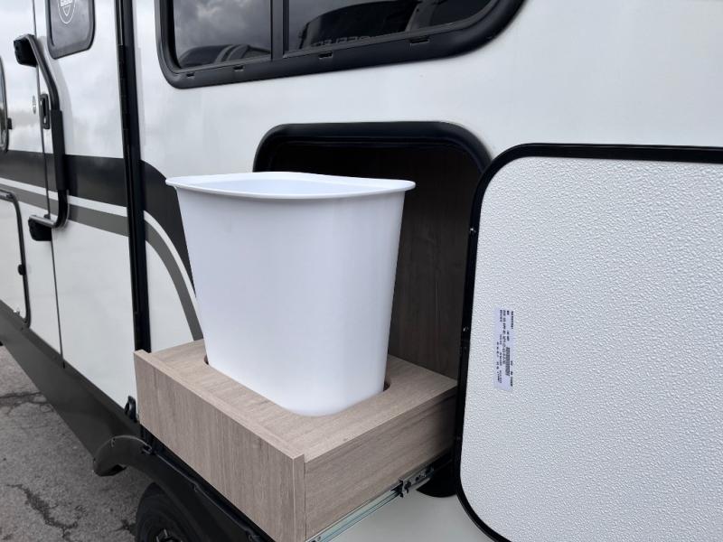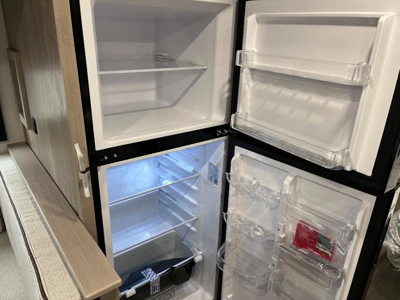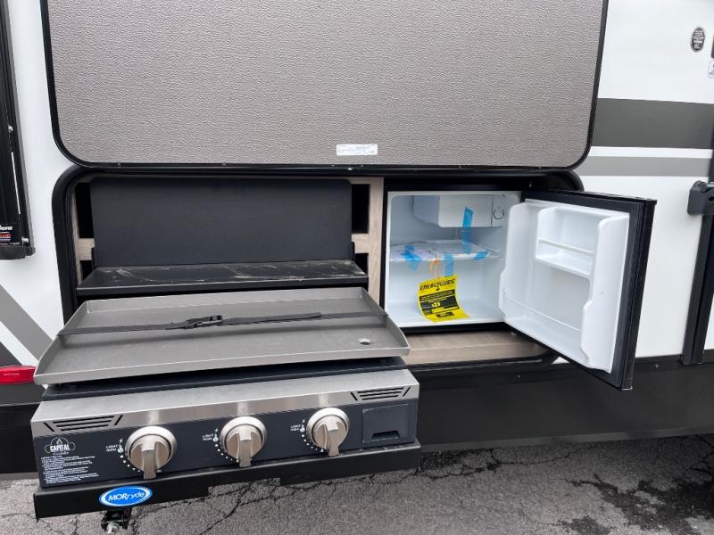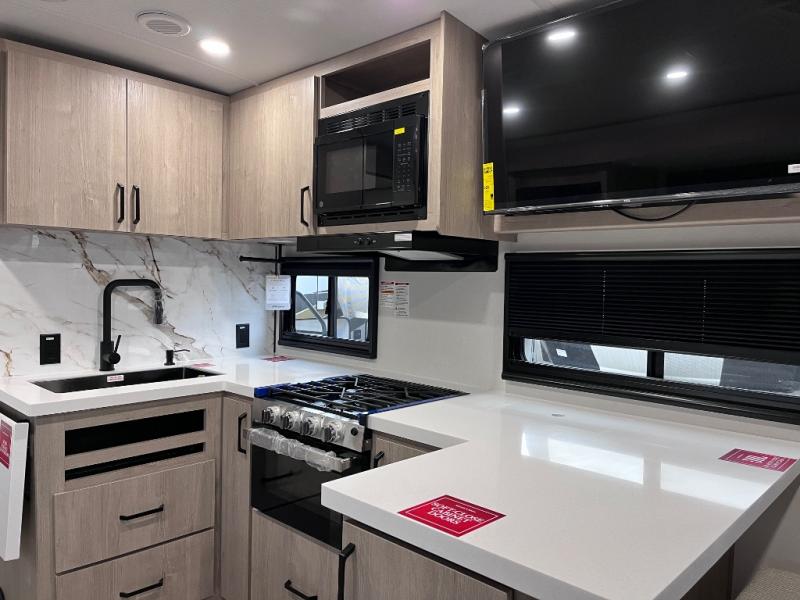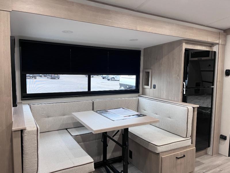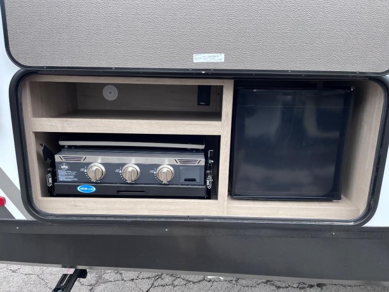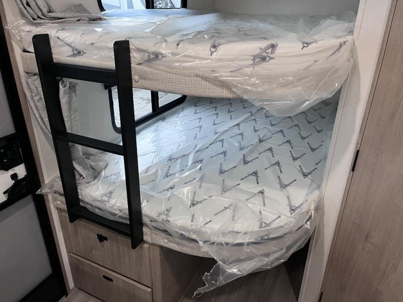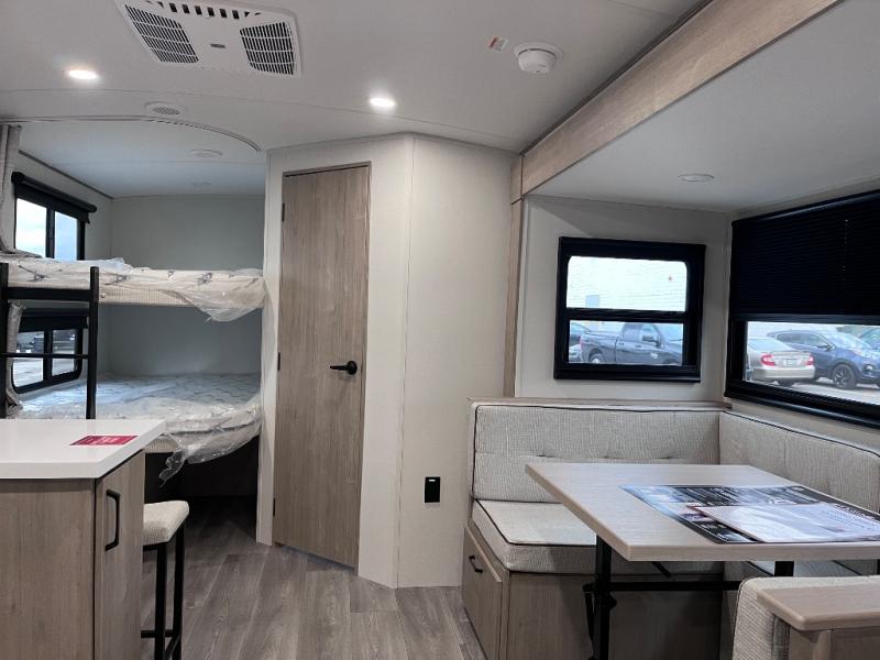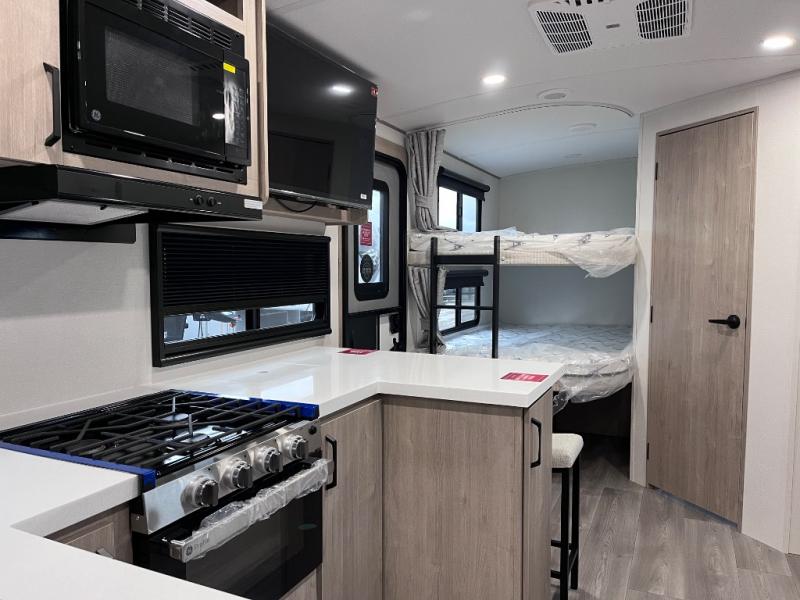 Unleash adventure with this incredible travel trailer! Sleep in style in the serene bedroom, featuring a plush queen bed, spacious wardrobe, and TV prep for entertainment. The kitchen is equipped with a pull-out pantry, 10 cu. refrigerator, microwave, and three-burner cooktop for delicious meal prep. Enjoy extra counter space with the flip-up countertop extension, optimal for easy and comfortable cooking. Family and friends can dine at the U-shaped dinette while watching the LED HDTV for added entertainment. The full bathroom offers a shower, and linen closet. Kids will love the double bunk bed, perfect for taking a nap. On the exterior, you will find the outdoor kitchen, pass-thru storage, and 20” x 20” baggage door/trash can storage, ideal for a better organization of your belongings. Finally, create outdoor activities without worrying about the weather thanks to the 19’ awning.
