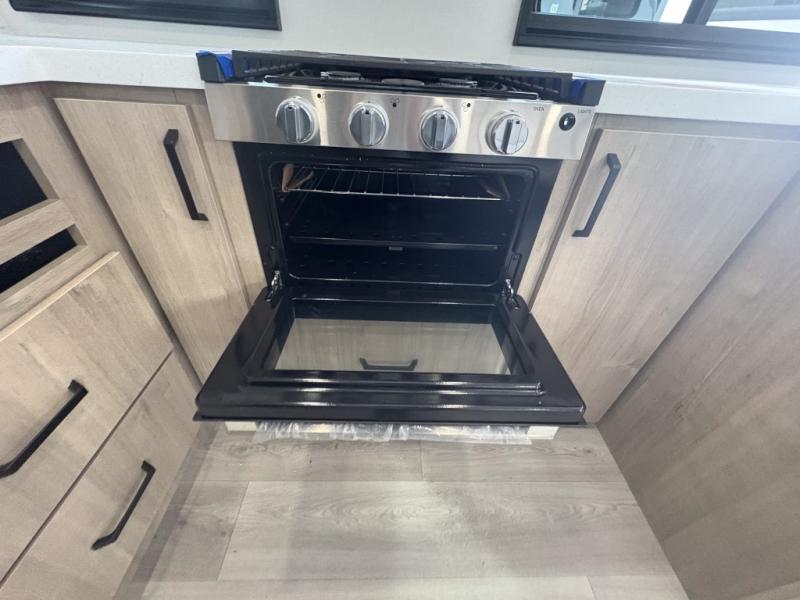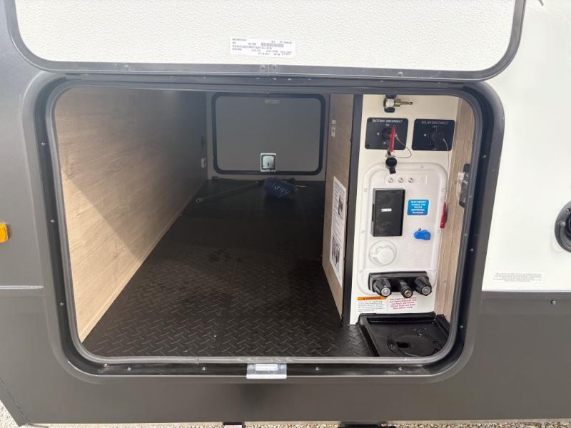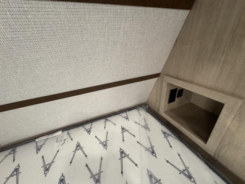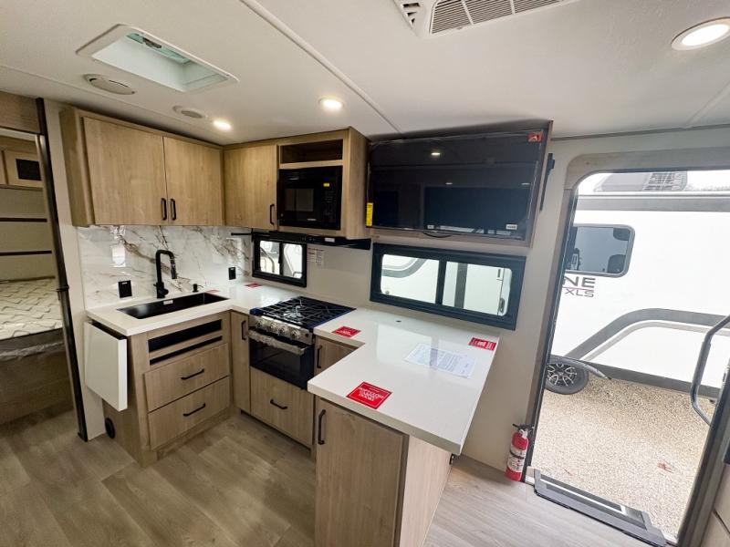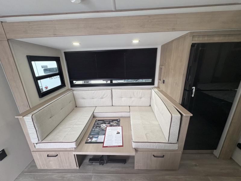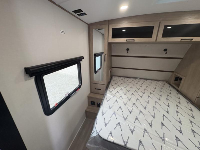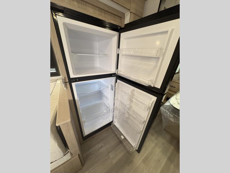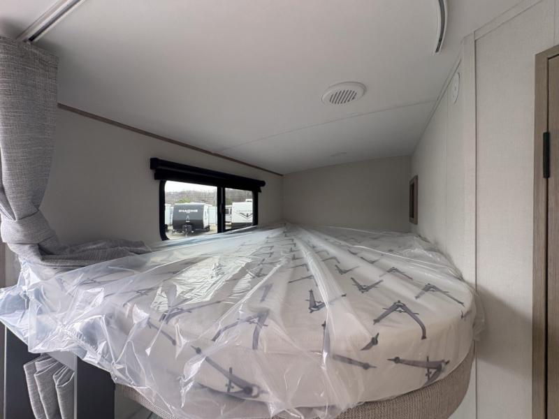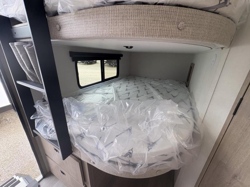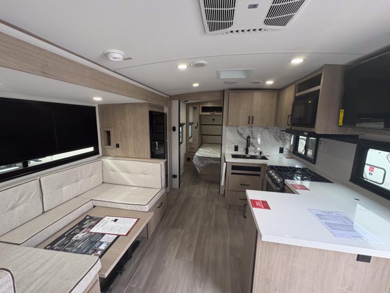 Unleash adventure with this incredible travel trailer! Sleep in style in the serene bedroom, featuring a plush queen bed, spacious wardrobe, and TV prep for entertainment. The kitchen is equipped with a pull-out pantry, 10 cu. refrigerator, microwave, and three-burner cooktop for delicious meal prep. Enjoy extra counter space with the flip-up countertop extension, optimal for easy and comfortable cooking. Family and friends can dine at the U-shaped dinette while watching TV for added entertainment. The full bathroom offers a shower, and linen closet. Kids will love the double bunk bed, perfect for taking a nap. On the exterior, you will find the outdoor griddle and a small refrigerator, pass-thru storage, and 20” x 20” baggage door/trash can storage, ideal for a better organization of your belongings. Finally, create outdoor activities without worrying about the weather thanks to the adjustable power awning with LED lights