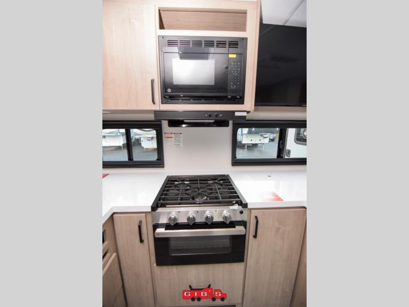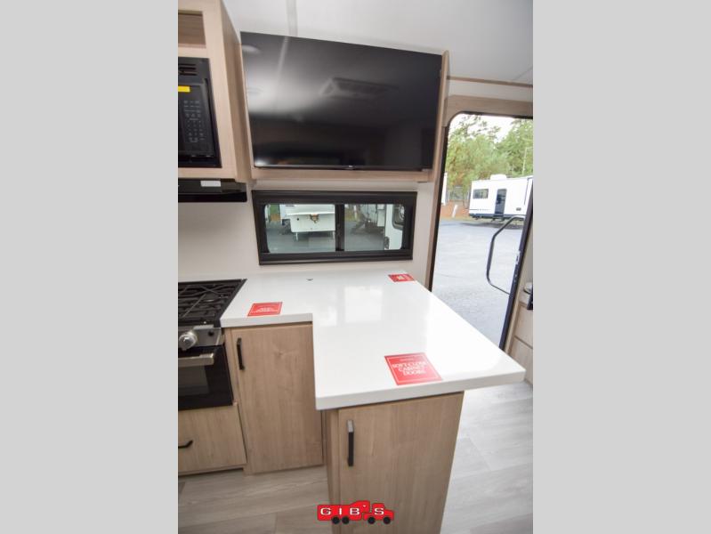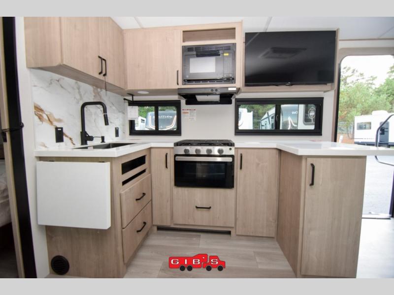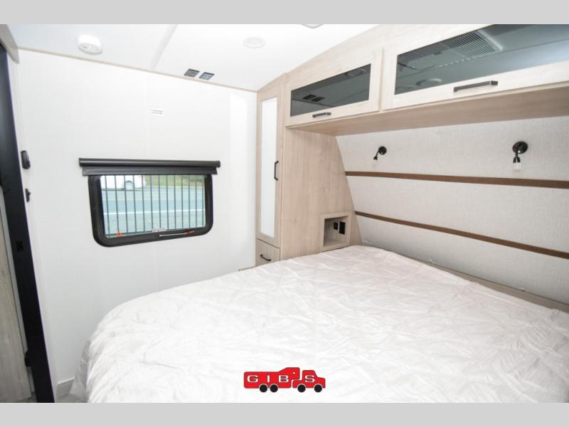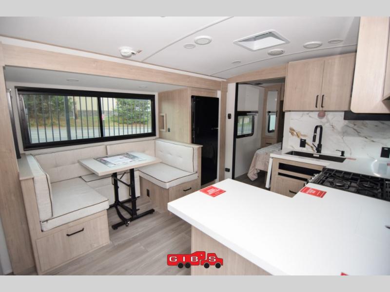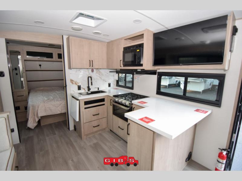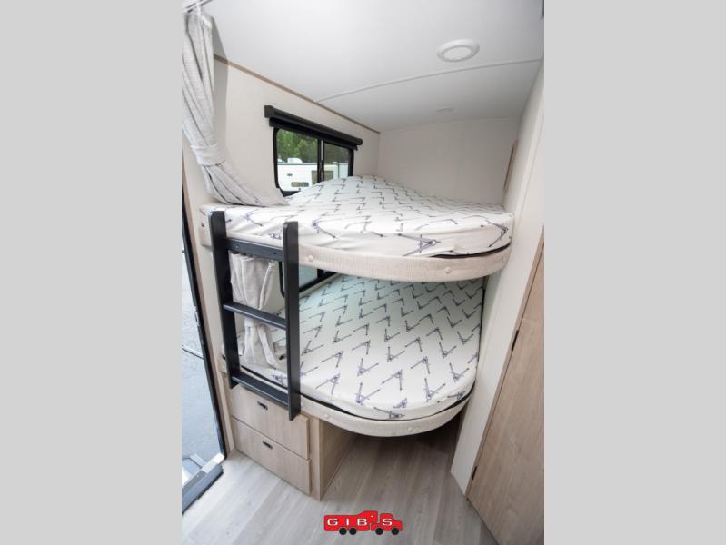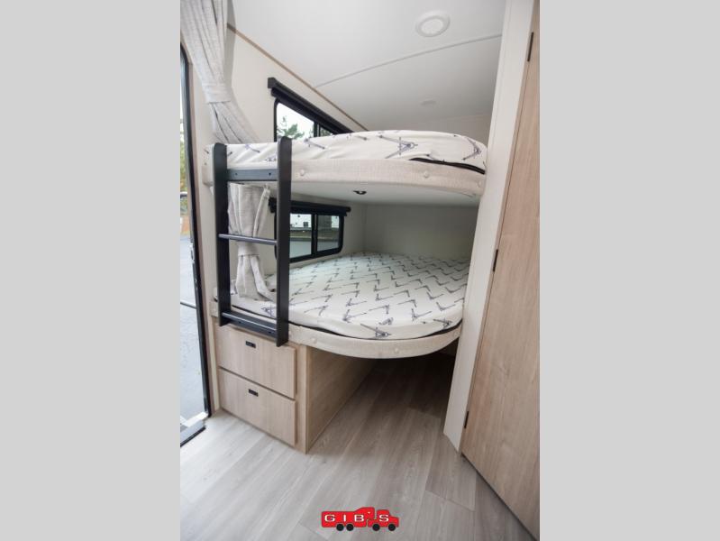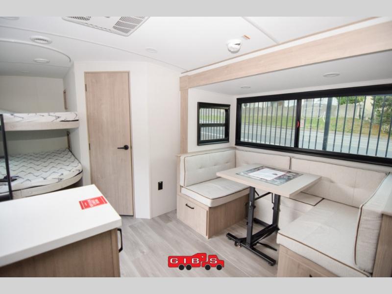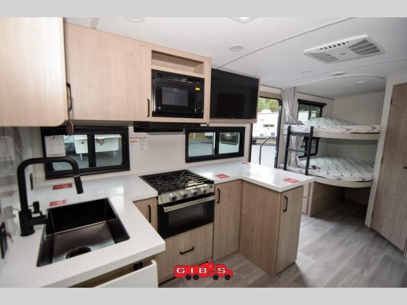 Unleash adventure with this incredible travel trailer! Sleep in style in the serene bedroom, featuring a plush queen bed, spacious wardrobe, and TV prep for entertainment. The kitchen is equipped with a pull-out pantry, 10 cu. refrigerator, microwave, and three-burner cooktop for delicious meal prep. Enjoy extra counter space with the flip-up countertop extension, optimal for easy and comfortable cooking. Family and friends can dine at the U-shaped dinette while watching TV for added entertainment. The full bathroom offers a shower, and linen closet. Kids will love the double bunk bed, perfect for taking a nap. On the exterior, you will find the outdoor griddle and a small refrigerator, pass-thru storage, and 20” x 20” baggage door/trash can storage, ideal for a better organization of your belongings. Finally, create outdoor activities without worrying about the weather thanks to the adjustable power awning with LED lights