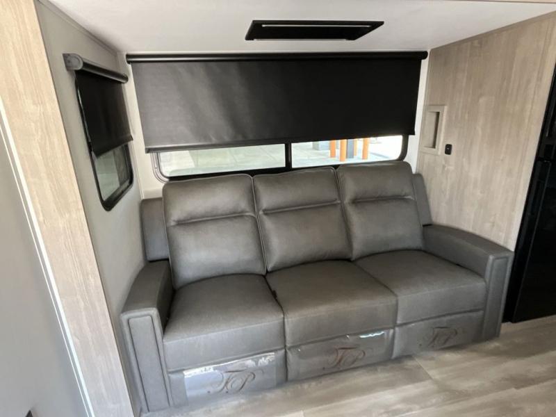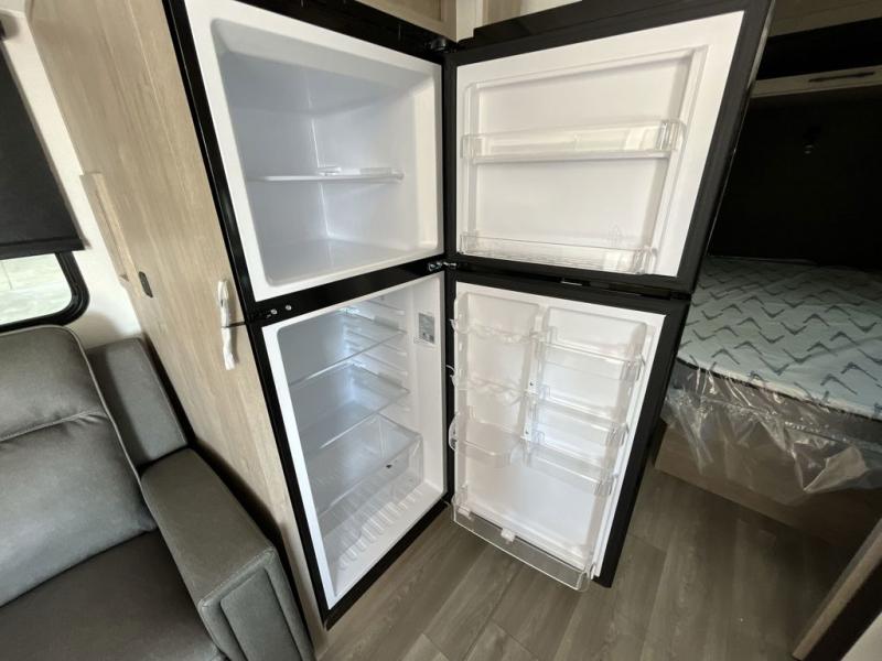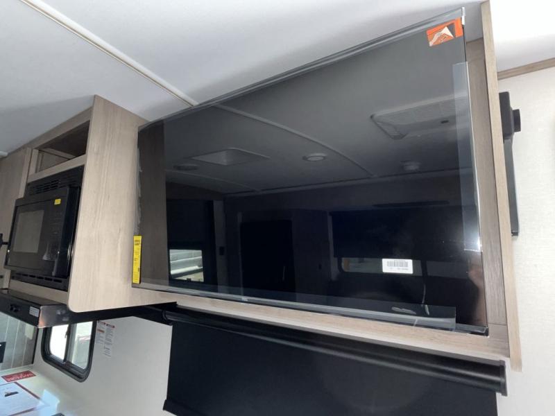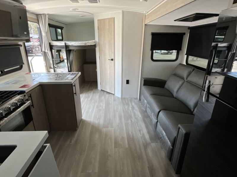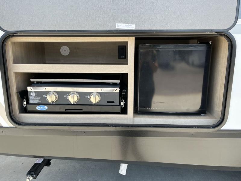 Unleash adventure with this incredible travel trailer! Sleep in style in the serene bedroom, featuring a plush queen bed, spacious wardrobe, and TV prep for entertainment. The kitchen is equipped with a pull-out pantry, 10 cu. refrigerator, microwave, and three-burner cooktop for delicious meal prep. Enjoy extra counter space with the flip-up countertop extension, optimal for easy and comfortable cooking. Family and friends can dine at the U-shaped dinette while watching TV for added entertainment. The full bathroom offers a shower, and linen closet. Kids will love the double bunk bed, perfect for taking a nap. On the exterior, you will find the outdoor griddle and a small refrigerator, pass-thru storage, and 20” x 20” baggage door/trash can storage, ideal for a better organization of your belongings. Finally, create outdoor activities without worrying about the weather thanks to the adjustable power awning with LED lights
