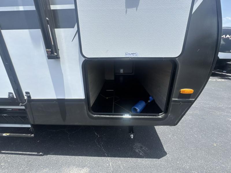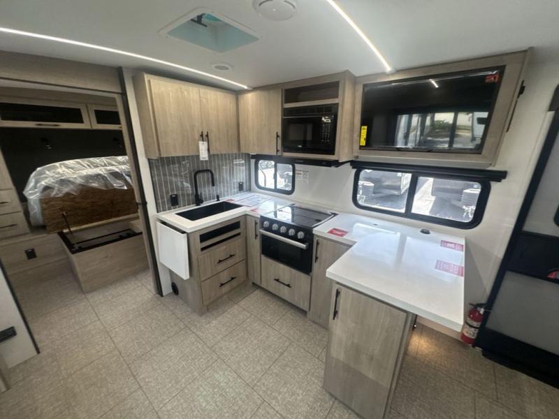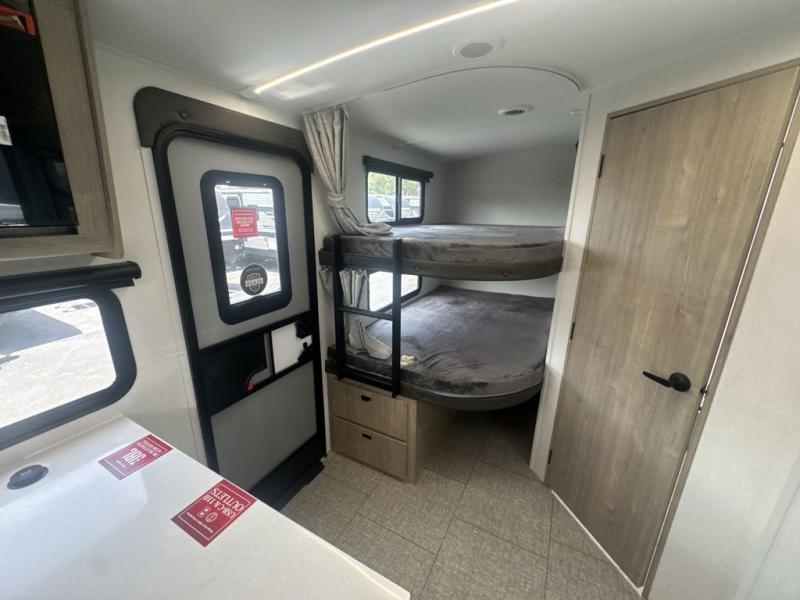 Unleash adventure with this incredible travel trailer! Sleep in style in the serene bedroom, featuring a plush queen bed, spacious wardrobe, and TV prep for entertainment. The kitchen is equipped with a pull-out pantry, 10 cu. refrigerator, microwave, and three-burner cooktop for delicious meal prep. Enjoy extra counter space with the flip-up countertop extension, optimal for easy and comfortable cooking. Family and friends can dine at the U-shaped dinette while watching TV for added entertainment. The full bathroom offers a shower, and linen closet. Kids will love the double bunk bed, perfect for taking a nap. On the exterior, you will find the outdoor griddle and a small refrigerator, pass-thru storage, and 20” x 20” baggage door/trash can storage, ideal for a better organization of your belongings. Finally, create outdoor activities without worrying about the weather thanks to the adjustable power awning with LED lights
