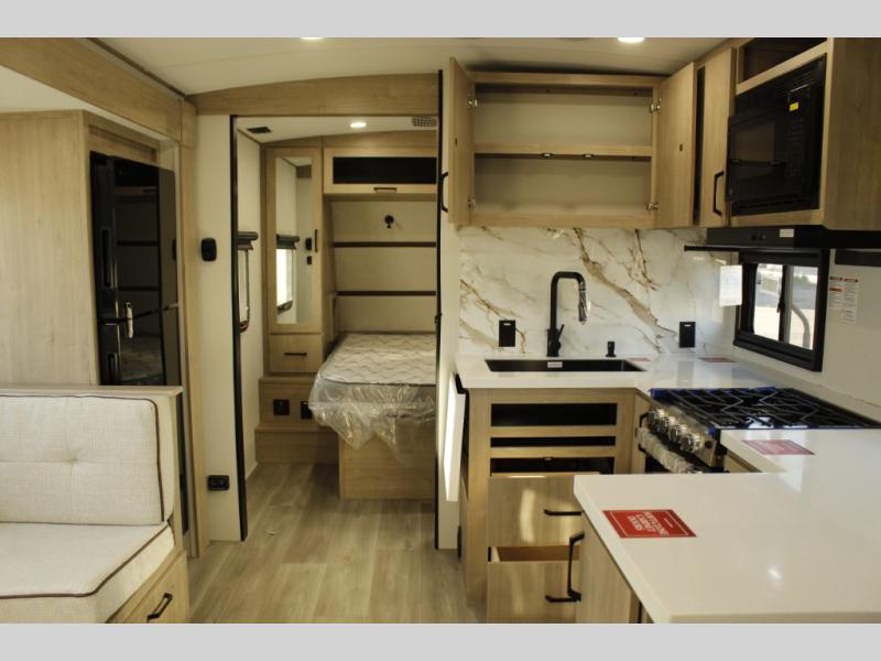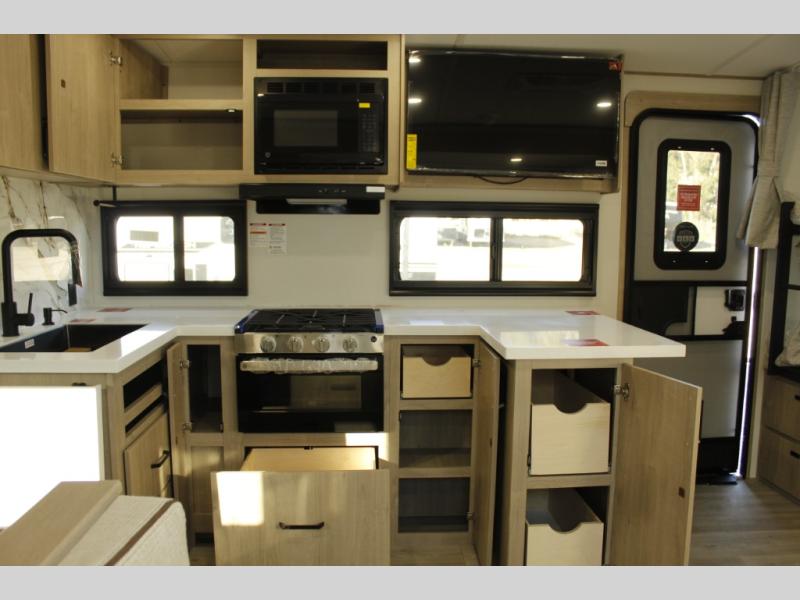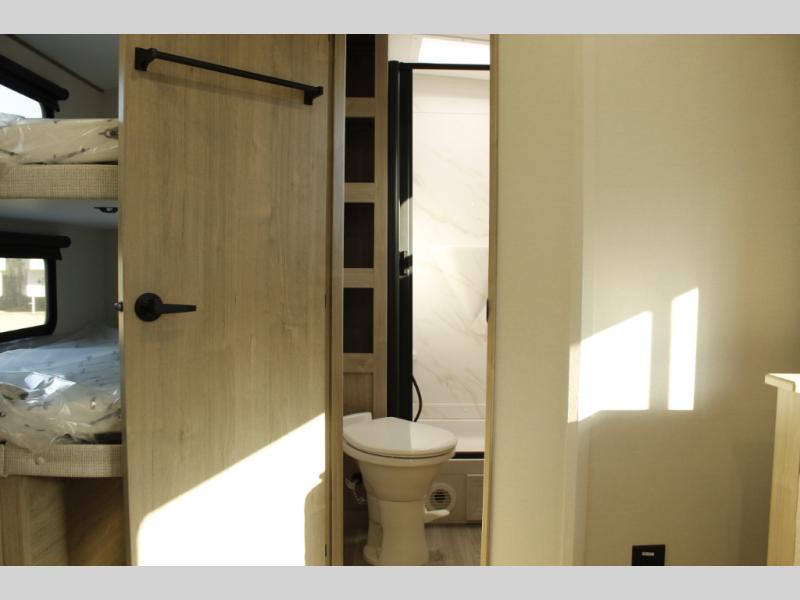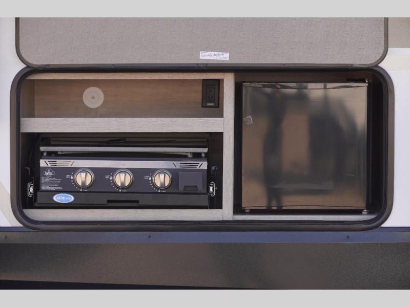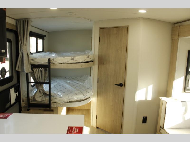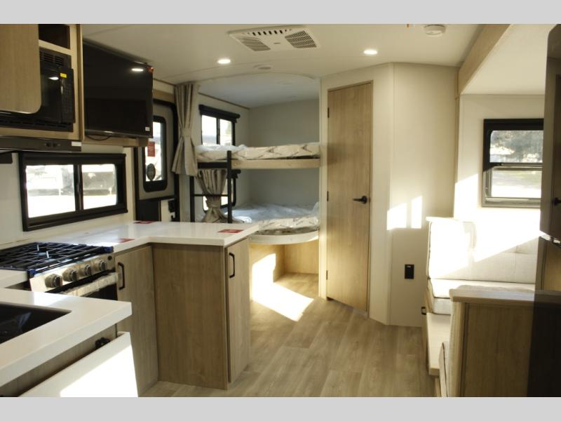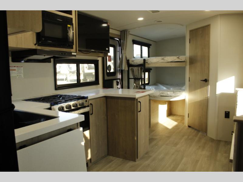 Unleash adventure with this incredible travel trailer! Sleep in style in the serene bedroom, featuring a plush queen bed, spacious wardrobe, and TV prep for entertainment. The kitchen is equipped with a pull-out pantry, 10 cu. refrigerator, microwave, and three-burner cooktop for delicious meal prep. Enjoy extra counter space with the flip-up countertop extension, optimal for easy and comfortable cooking. Family and friends can dine at the U-shaped dinette while watching TV for added entertainment. The full bathroom offers a shower, and linen closet. Kids will love the double bunk bed, perfect for taking a nap. On the exterior, you will find the outdoor griddle and a small refrigerator, pass-thru storage, and 20” x 20” baggage door/trash can storage, ideal for a better organization of your belongings. Finally, create outdoor activities without worrying about the weather thanks to the adjustable power awning with LED lights
