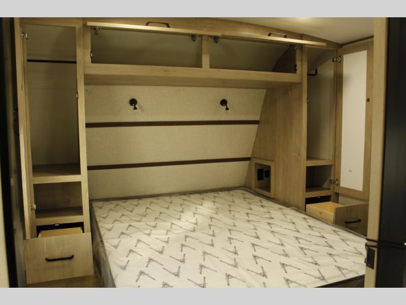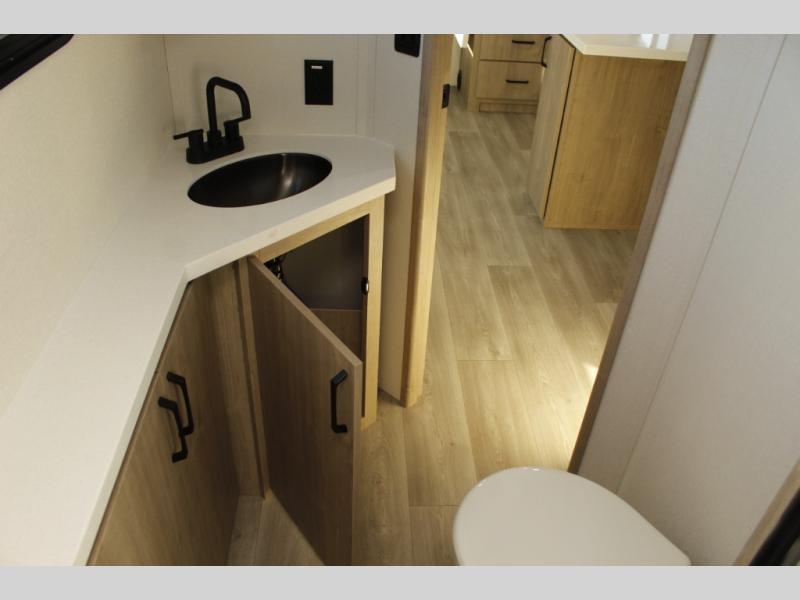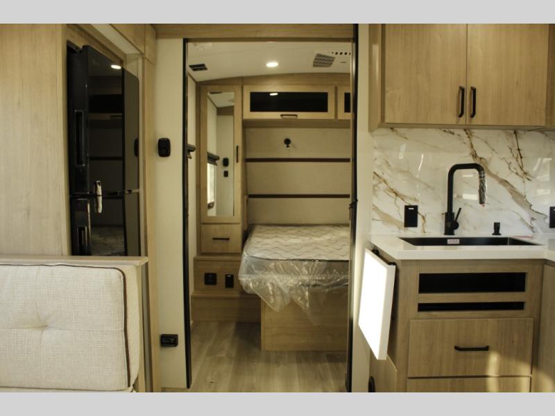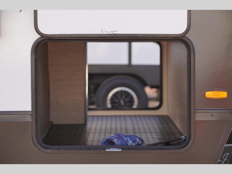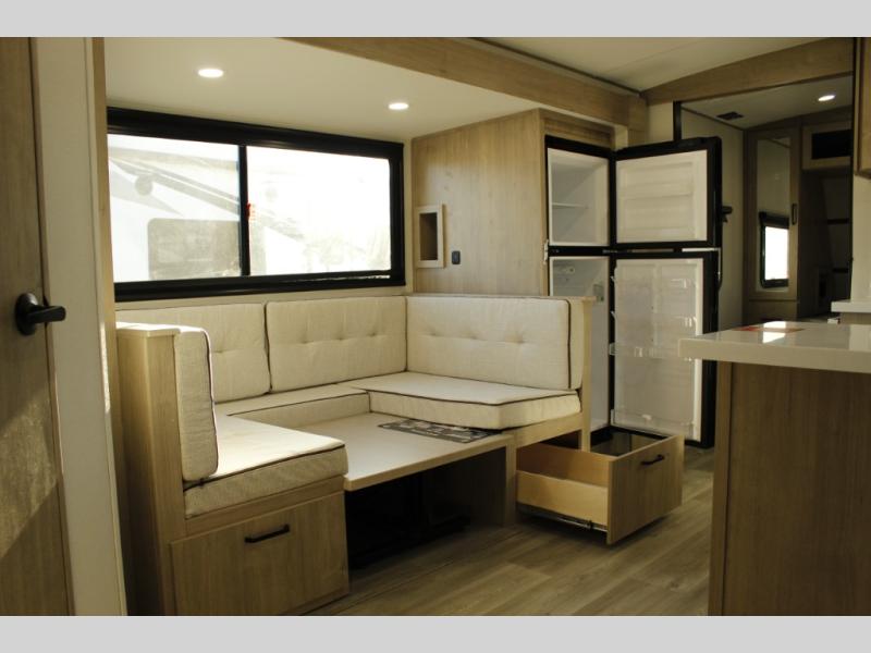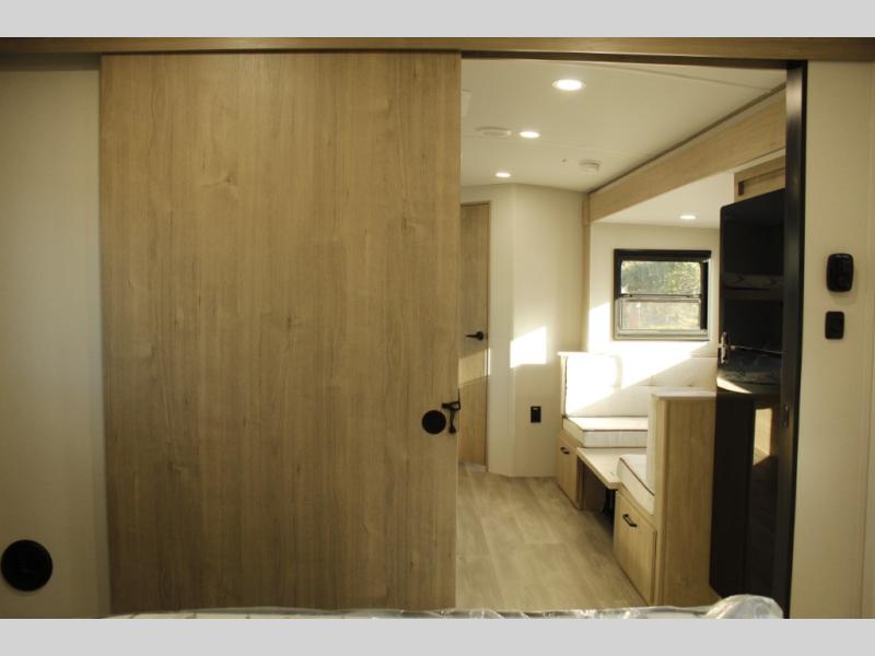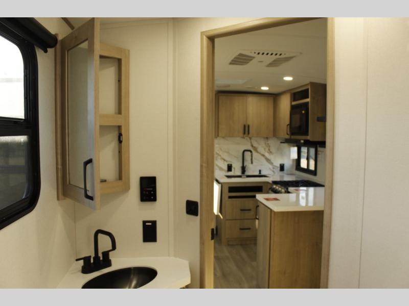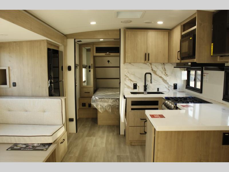 Unleash adventure with this incredible travel trailer! Sleep in style in the serene bedroom, featuring a plush queen bed, spacious wardrobe, and TV prep for entertainment. The kitchen is equipped with a pull-out pantry, 10 cu. refrigerator, microwave, and three-burner cooktop for delicious meal prep. Enjoy extra counter space with the flip-up countertop extension, optimal for easy and comfortable cooking. Family and friends can dine at the U-shaped dinette while watching TV for added entertainment. The full bathroom offers a shower, and linen closet. Kids will love the double bunk bed, perfect for taking a nap. On the exterior, you will find the outdoor griddle and a small refrigerator, pass-thru storage, and 20” x 20” baggage door/trash can storage, ideal for a better organization of your belongings. Finally, create outdoor activities without worrying about the weather thanks to the adjustable power awning with LED lights
