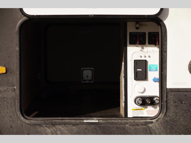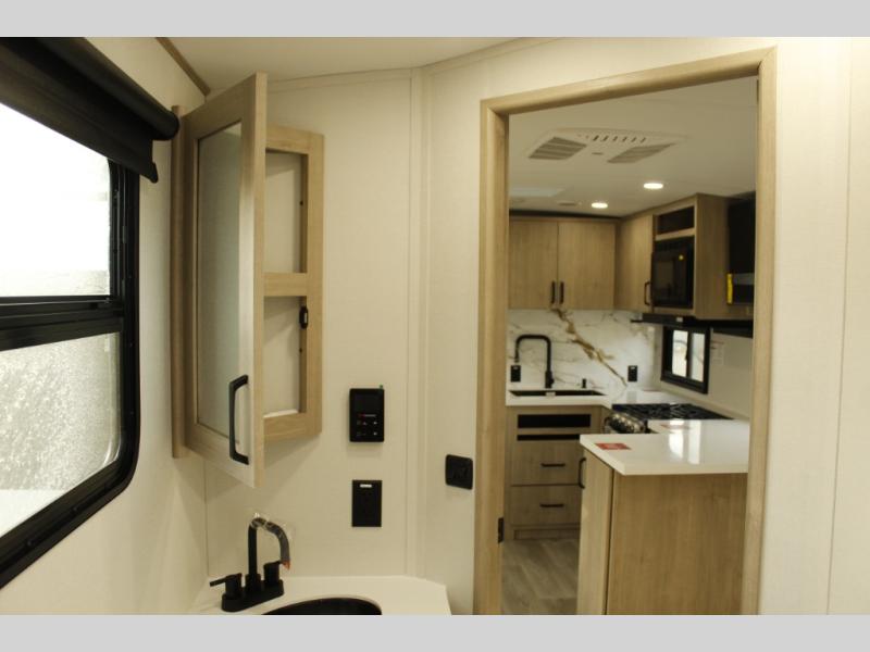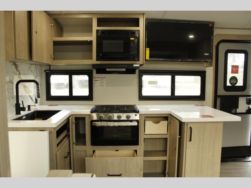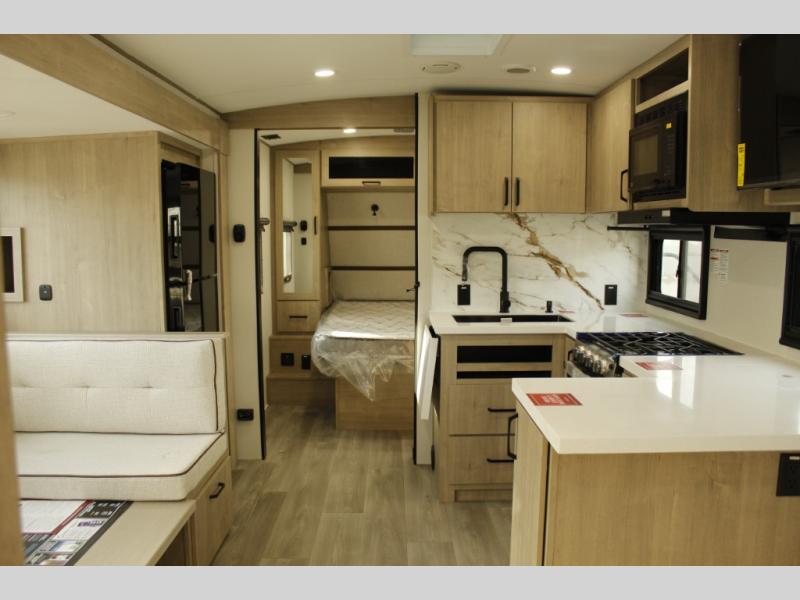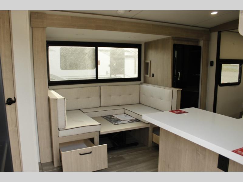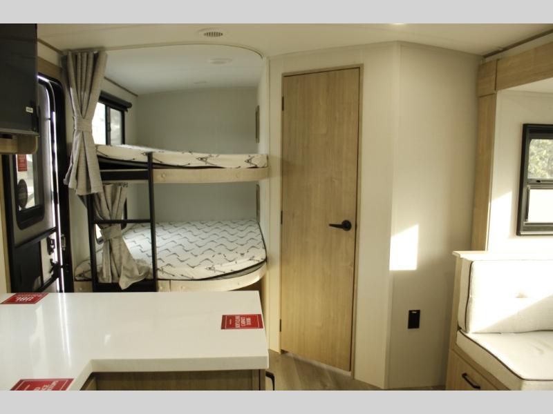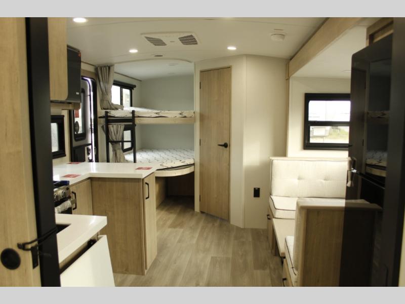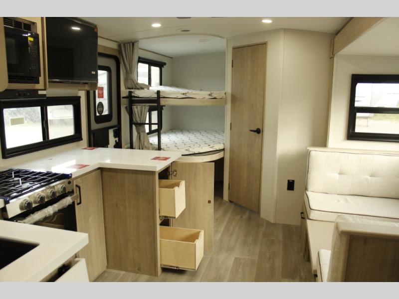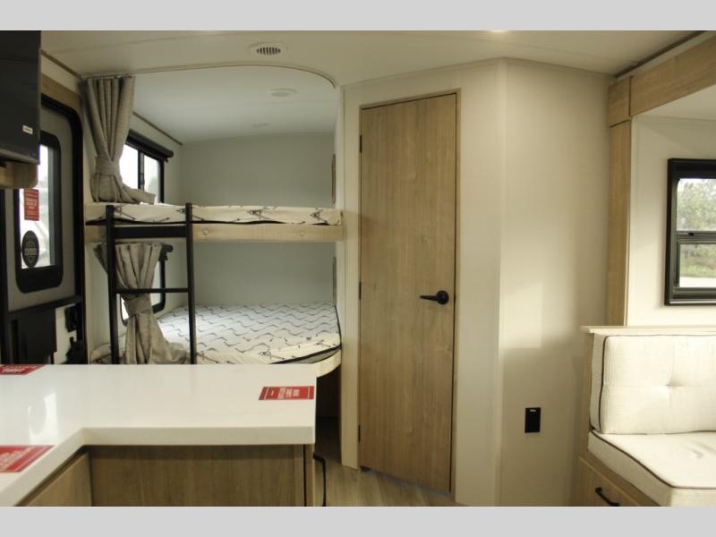 Unleash adventure with this incredible travel trailer! Sleep in style in the serene bedroom, featuring a plush queen bed, spacious wardrobe, and TV prep for entertainment. The kitchen is equipped with a pull-out pantry, 10 cu. refrigerator, microwave, and three-burner cooktop for delicious meal prep. Enjoy extra counter space with the flip-up countertop extension, optimal for easy and comfortable cooking. Family and friends can dine at the U-shaped dinette while watching TV for added entertainment. The full bathroom offers a shower, and linen closet. Kids will love the double bunk bed, perfect for taking a nap. On the exterior, you will find the outdoor griddle and a small refrigerator, pass-thru storage, and 20” x 20” baggage door/trash can storage, ideal for a better organization of your belongings. Finally, create outdoor activities without worrying about the weather thanks to the adjustable power awning with LED lights