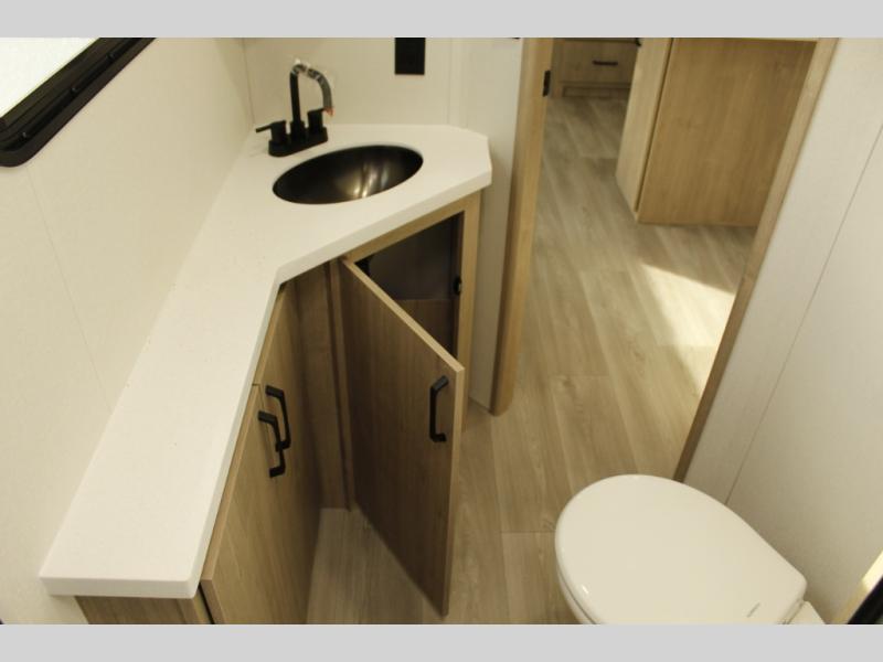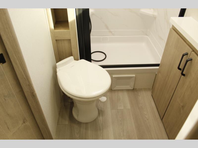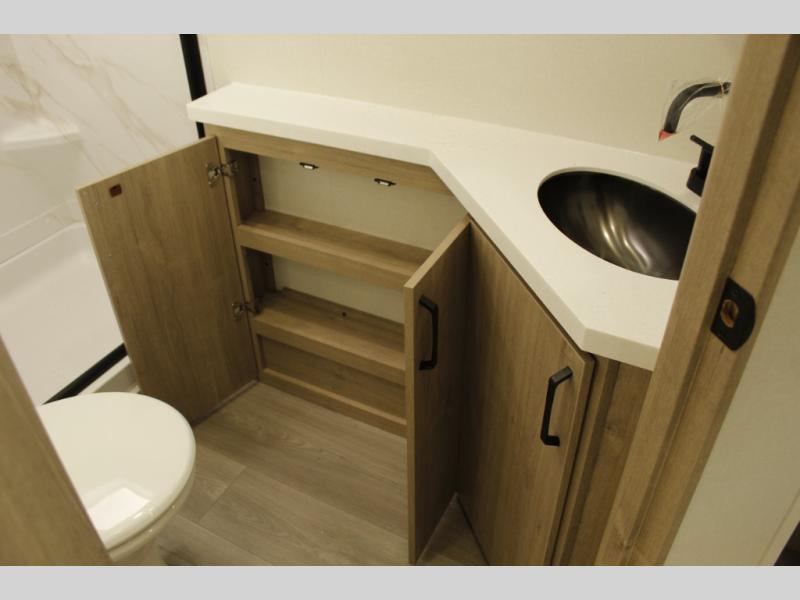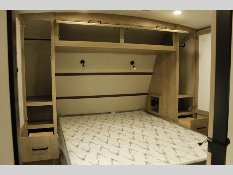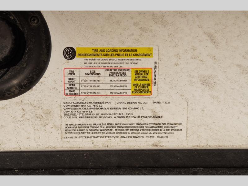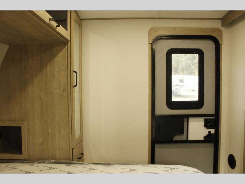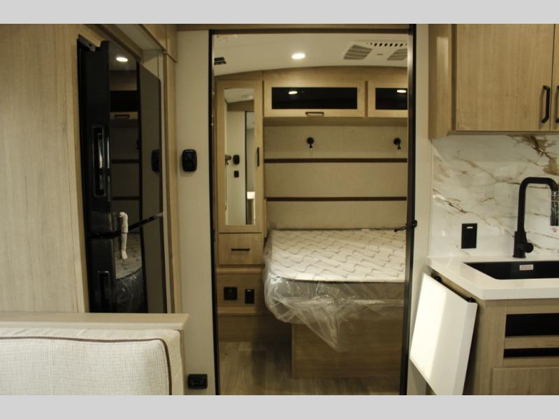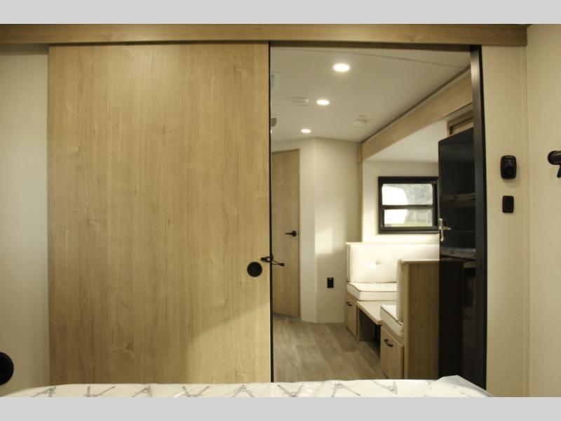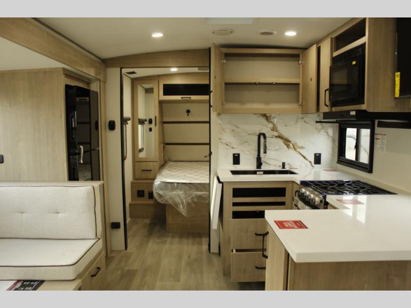 Unleash adventure with this incredible travel trailer! Sleep in style in the serene bedroom, featuring a plush queen bed, spacious wardrobe, and TV prep for entertainment. The kitchen is equipped with a pull-out pantry, 10 cu. refrigerator, microwave, and three-burner cooktop for delicious meal prep. Enjoy extra counter space with the flip-up countertop extension, optimal for easy and comfortable cooking. Family and friends can dine at the U-shaped dinette while watching TV for added entertainment. The full bathroom offers a shower, and linen closet. Kids will love the double bunk bed, perfect for taking a nap. On the exterior, you will find the outdoor griddle and a small refrigerator, pass-thru storage, and 20” x 20” baggage door/trash can storage, ideal for a better organization of your belongings. Finally, create outdoor activities without worrying about the weather thanks to the adjustable power awning with LED lights