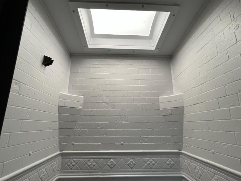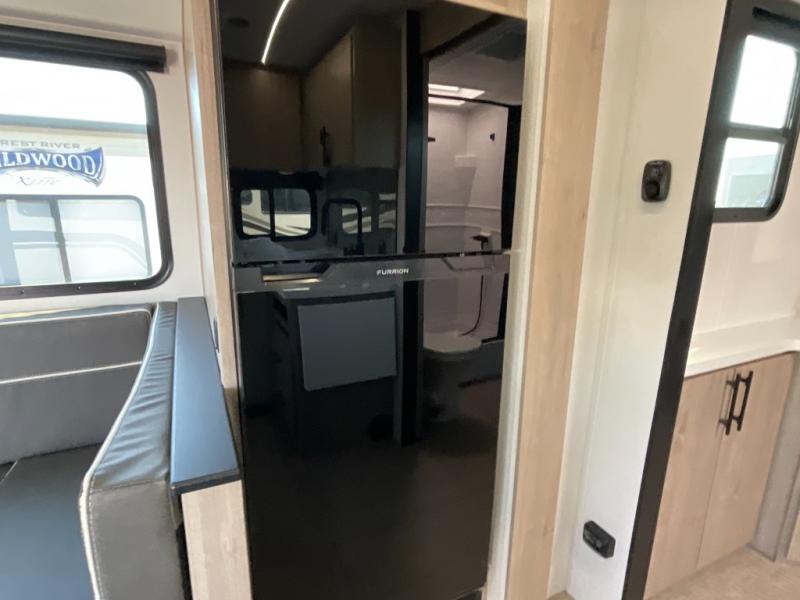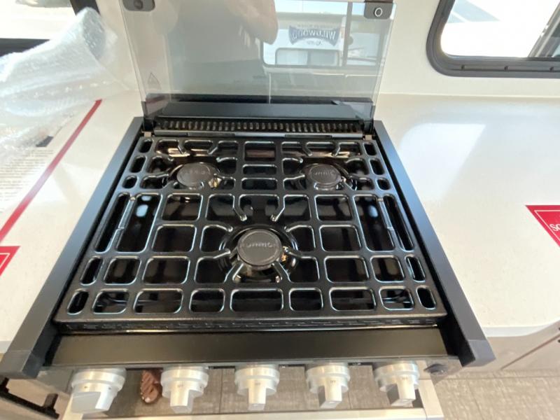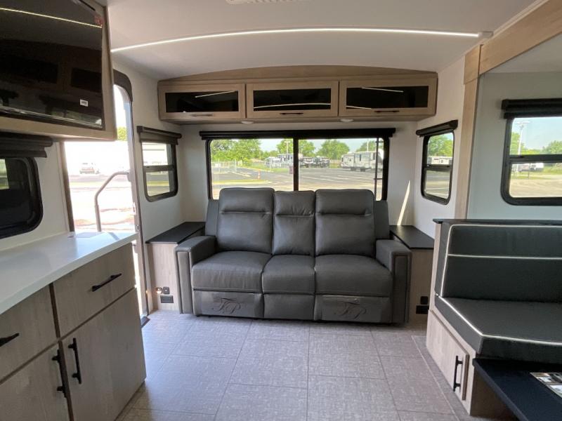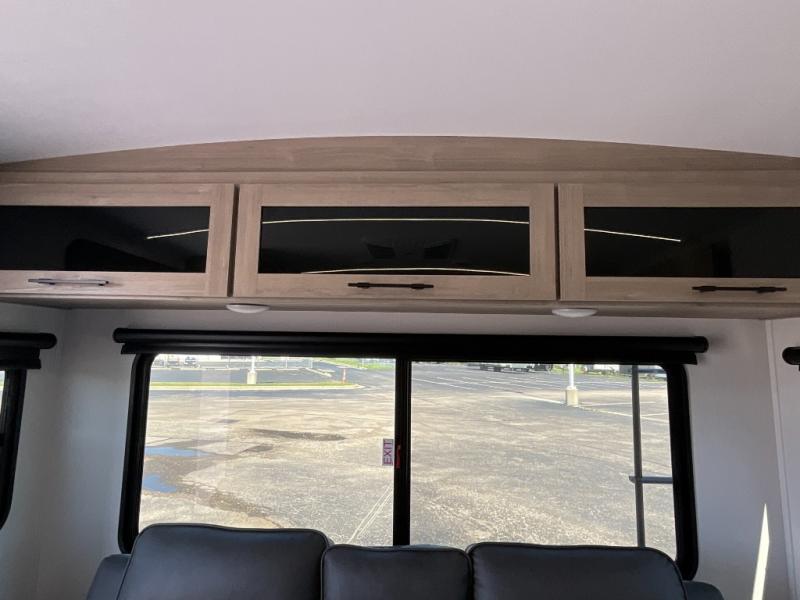 Step inside and experience the open, inviting rear lounge. Oversized windows brighten the space with natural light, while the tri-fold sofa and theater seating provide the perfect spots to unwind after a day of exploring. The entertainment center is strategically positioned for easy viewing and includes a modern TV setup and optional fireplace, bringing residential comfort right to your campsite.