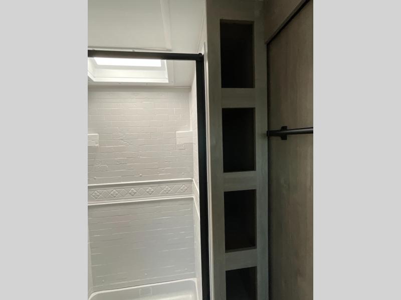 The private front bedroom features a walk-around queen bed with overhead cabinets and dual wardrobes, providing excellent storage for longer trips. A solid sliding door offers privacy, making this space feel like a true retreat. The spacious walk-through bathroom includes a large shower, linen storage, and ample room to move—another signature of Grand Design’s thoughtful interior planning.