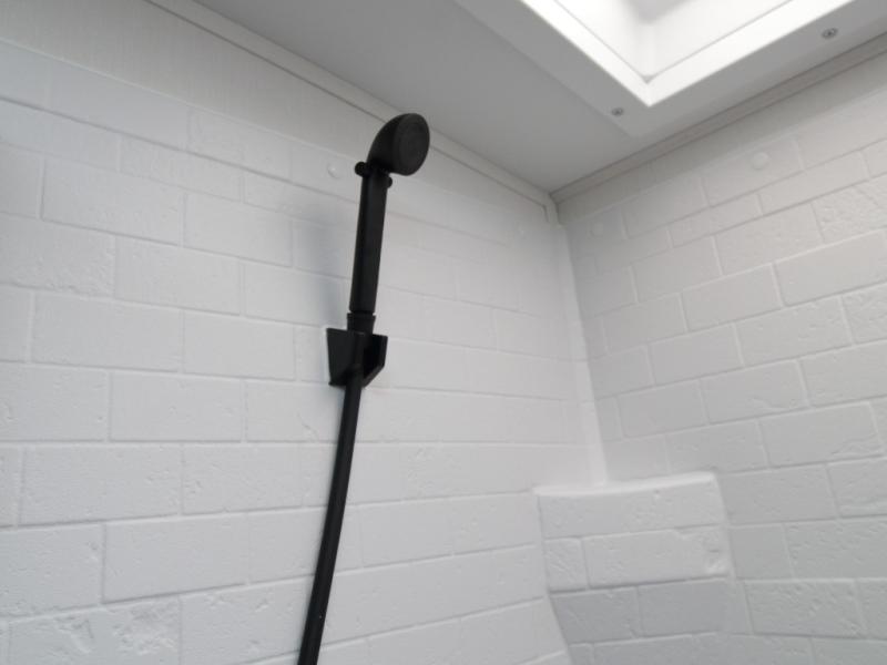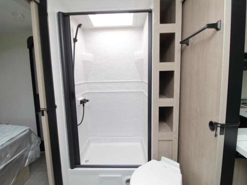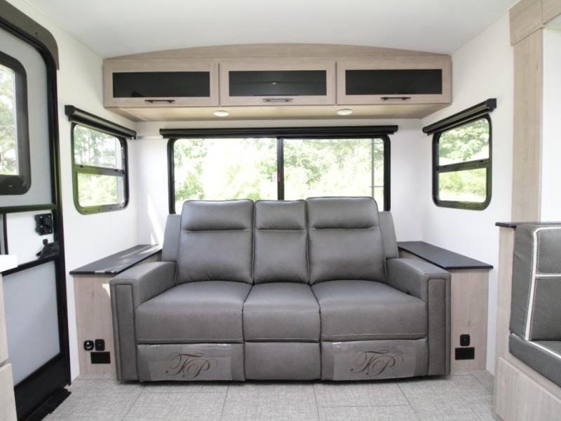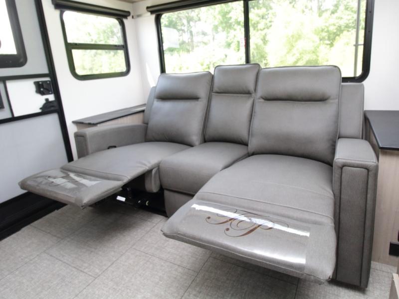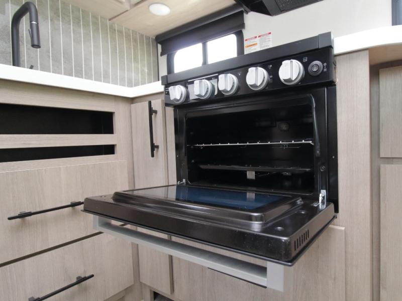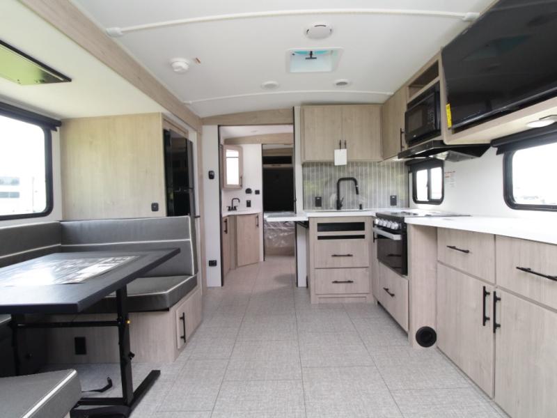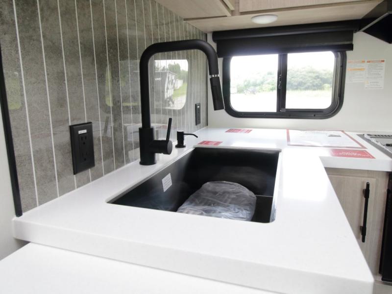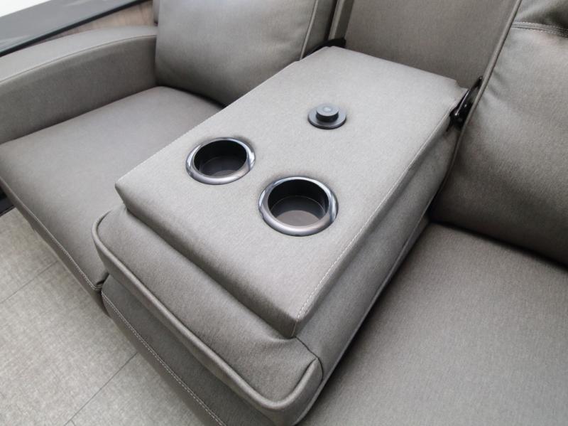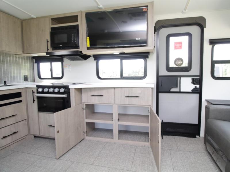 In the kitchen, you’ll appreciate the added counter space provided by the flip-up countertop extension—ideal for meal prep or serving snacks. Outside, a 21-foot power awning provides shade and shelter, while the LP quick connect and exterior spray port help make outdoor cooking and cleanup a breeze.