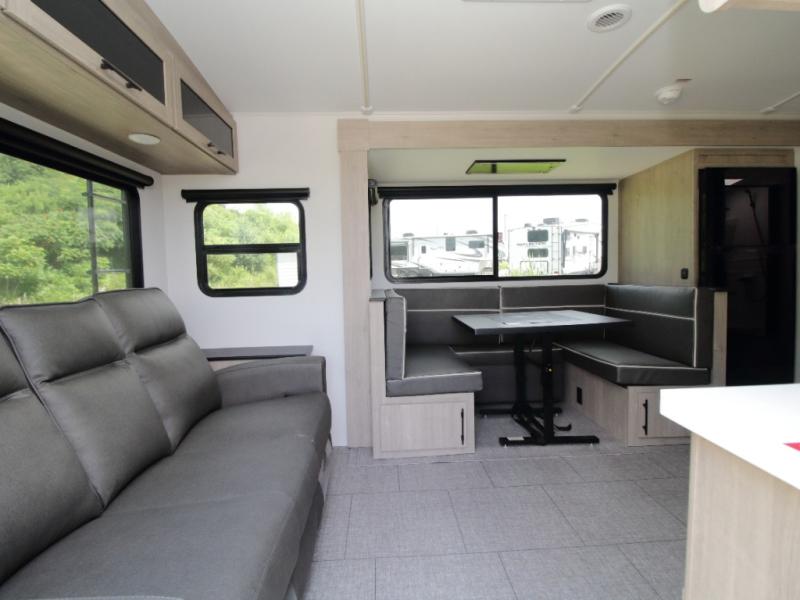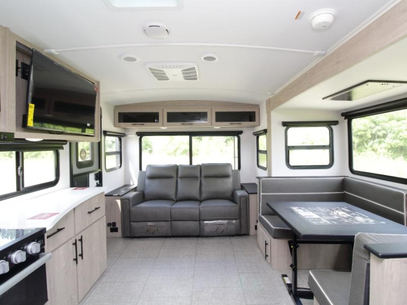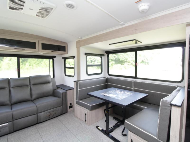 The spacious interior features a tri-fold sofa and a U-shaped dinette with a removable ottoman—perfect for relaxing or gathering around the LED HDTV after a day outdoors. The walk-through bathroom connects the bedroom to the main living area, offering privacy and ease of access.