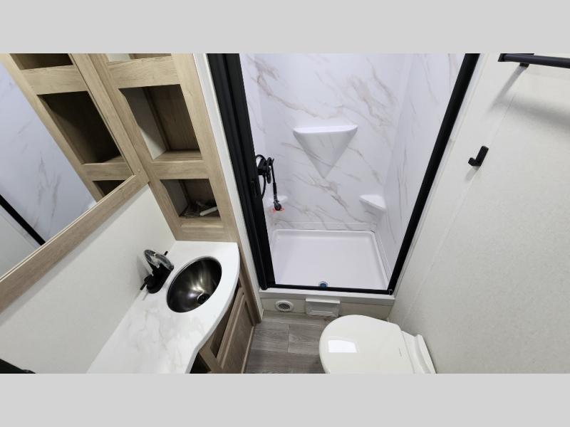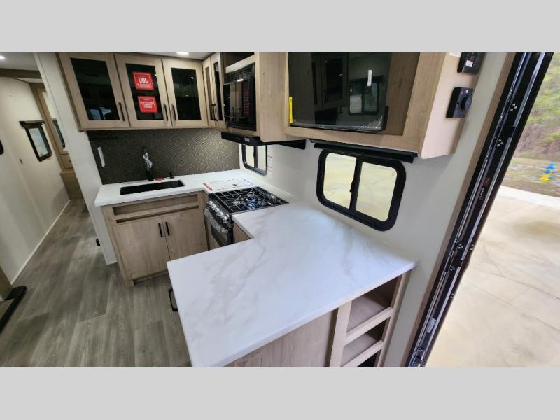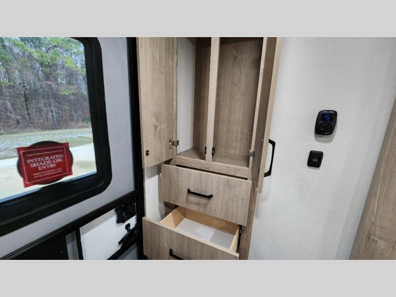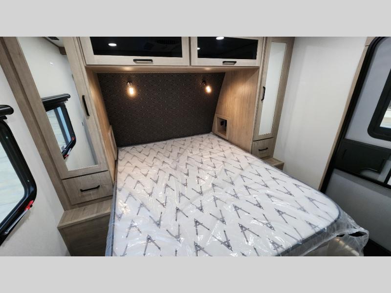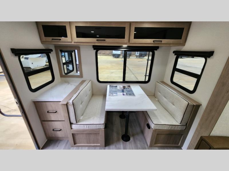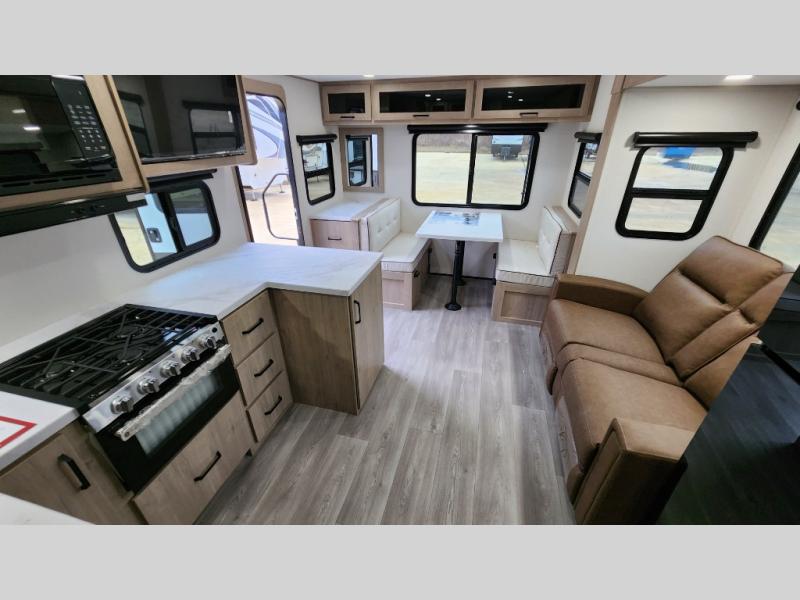 This 25RLE model travel trailer is designed for both comfort and convenience from front to back. At the front, the private bedroom features a spacious 60" x 80" queen bed with built-in wardrobe cubby storage and one of two entry doors for easy access. Moving down the hall, the full bathroom offers a residential-style walk-in shower with a skylight that adds both light and headroom, along with a mirrored medicine cabinet and linen shelves for towels and toiletries. The main living area opens up with a large slide out that houses 60" theater seating and a 10-cu. ft. refrigerator for all your fresh groceries, while a nearby pantry keeps your dry goods organized. Across from the slide, the U-shaped kitchen provides ample counter space, a three-burner range with oven, stainless steel sink, and microwave, everything you need to cook in comfort. At the rear, the booth dinette creates the perfect spot for meals or games and easily converts into an extra-sleeping area when needed.