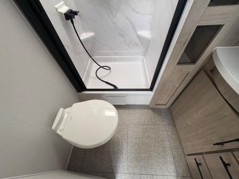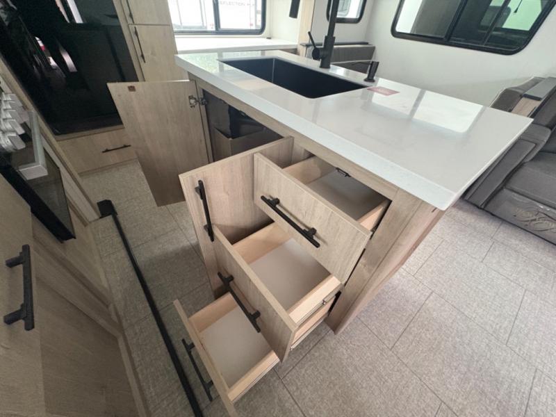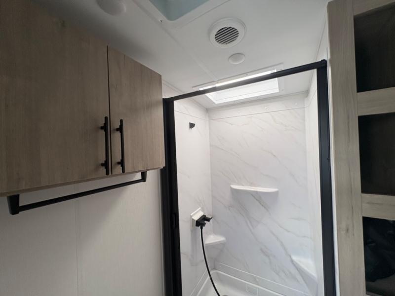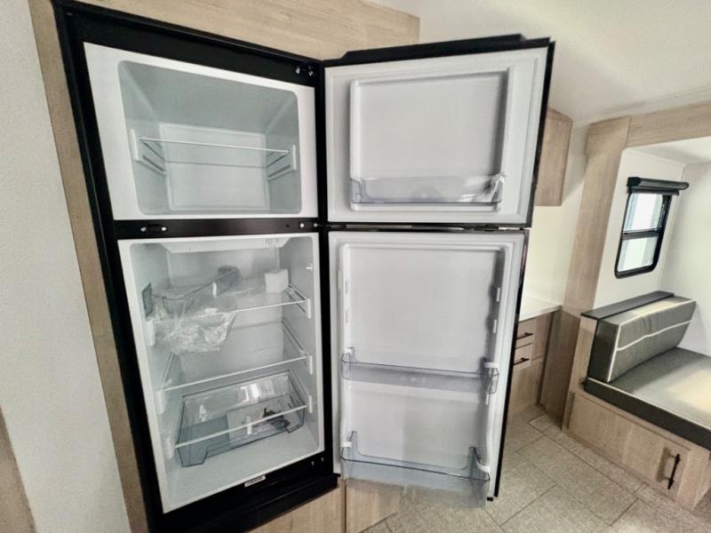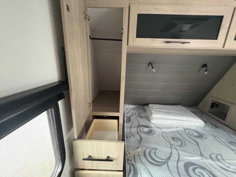 With this Imagine travel trailer, you can work while you're on the road because it offers you a desk in the main living area. You won't have to miss out on the action since you'll be right next to the booth dinette and tri-fold sofa, and there is even a pantry directly to the left of the desk for you to grab a quick snack while you're working. Once you're done with work, you can relax on the tri-fold sofa while you watch the telescoping LED HDTV, and the private bedroom offers you a 60" x 80" queen bed to rest on when you're ready to call it a night.