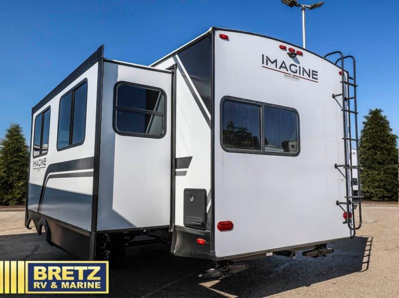 Just imagine leaving the world behind and secluding yourself away with your favorite people in your Grand Design Imagine travel trailer! The Imagine has been designed to enjoy extended season camping and includes a high-capacity furnace, a heated and enclosed underbelly with suspended tanks, a designated heat duct to the subfloor, and a high-density roof insulation with attic vent. You'll have maximum head room on the interior with 81" radius ceilings, and large panoramic windows to let in natural lighting. The exclusive drop-frame pass-through storage compartment is going to allow you to bring along lots of equipment, and the universal docking station is an all-in-one location for utilities and hook-ups. You'll also have oversized tank capacities so that you can fill and empty your tanks less often.