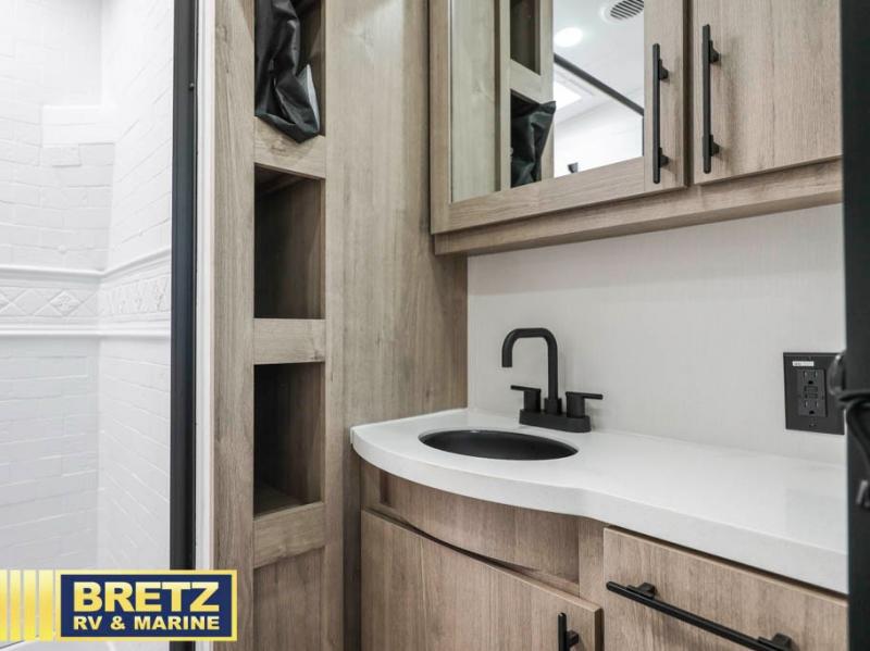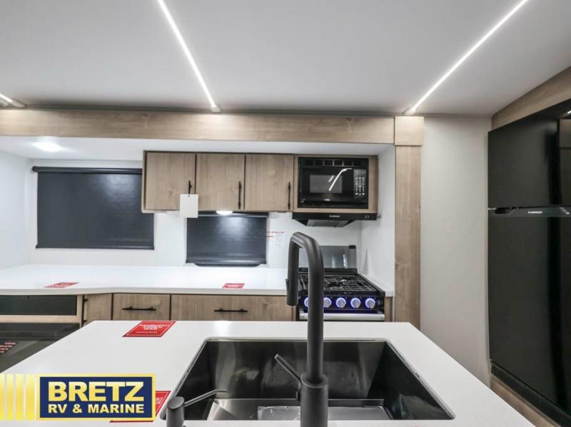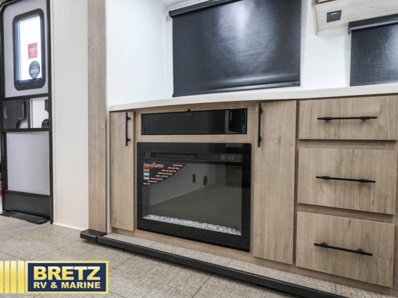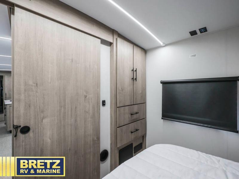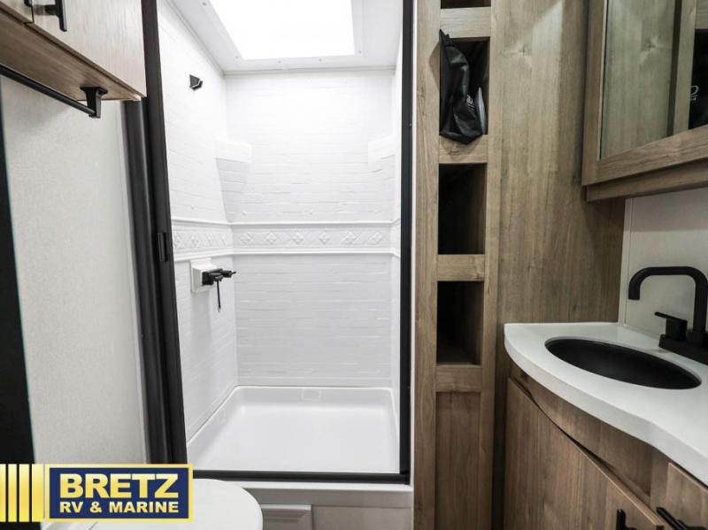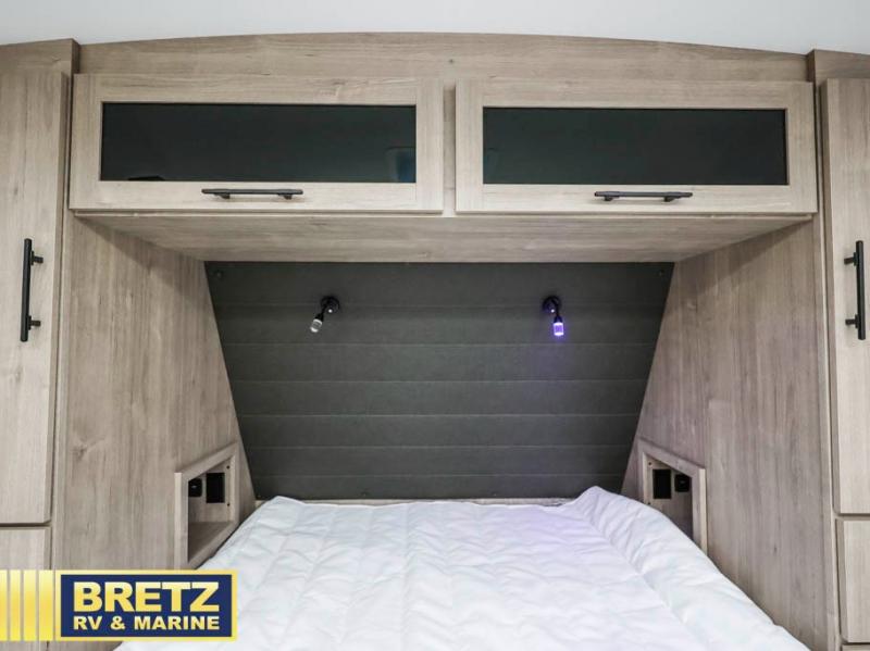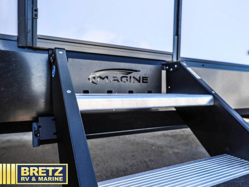 With this Imagine travel trailer, you can work while you're on the road because it offers you a desk in the main living area. You won't have to miss out on the action since you'll be right next to the booth dinette and tri-fold sofa, and there is even a pantry directly to the left of the desk for you to grab a quick snack while you're working. Once you're done with work, you can relax on the tri-fold sofa while you watch the telescoping LED HDTV, and the private bedroom offers you a 60" x 80" queen bed to rest on when you're ready to call it a night.