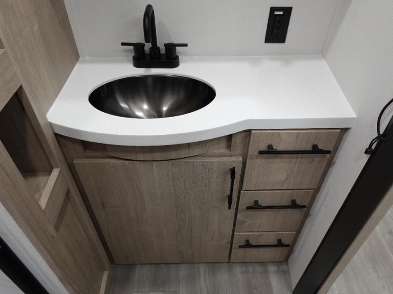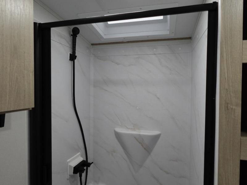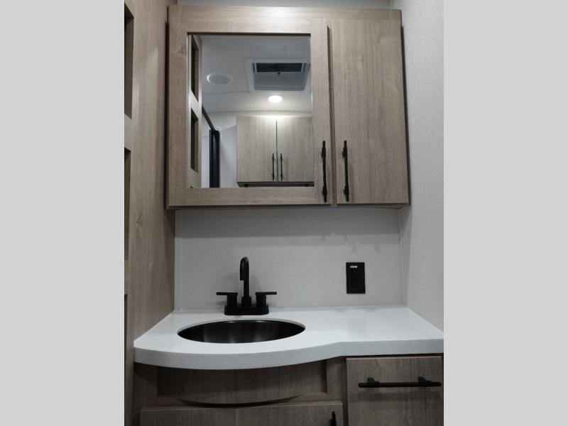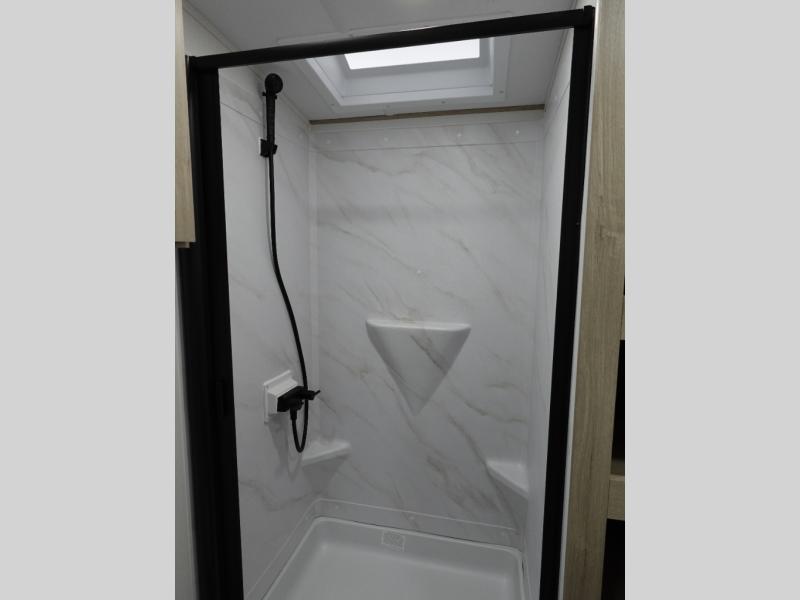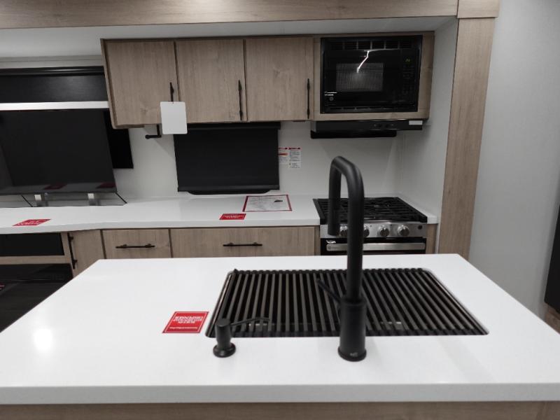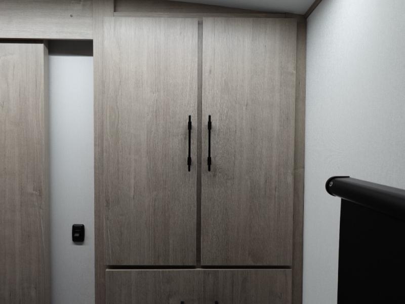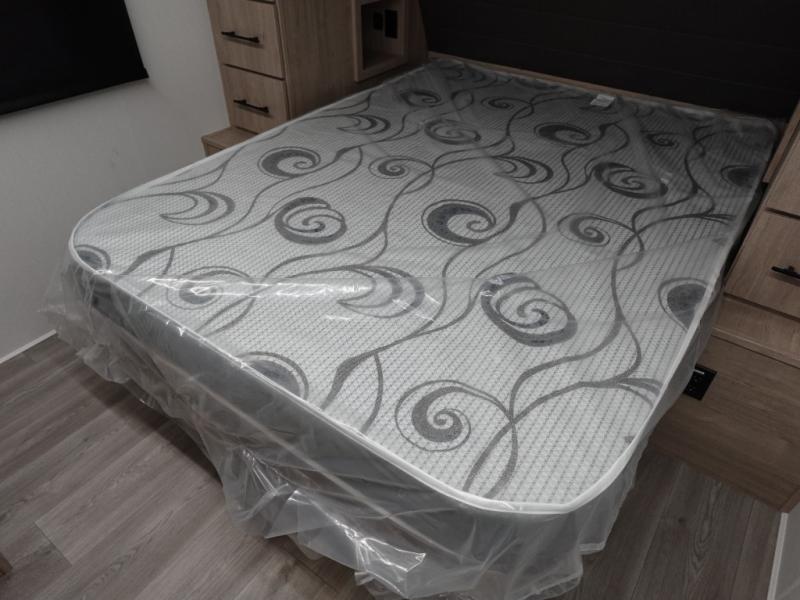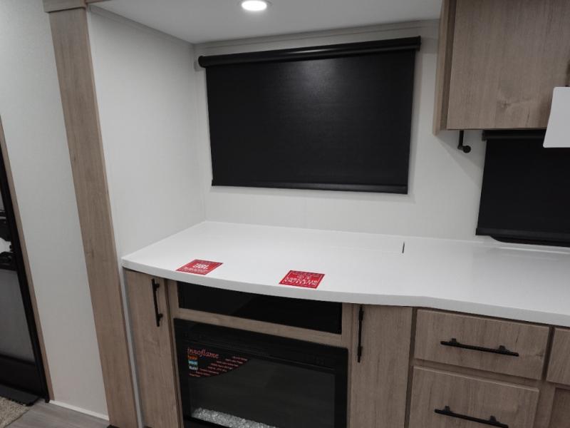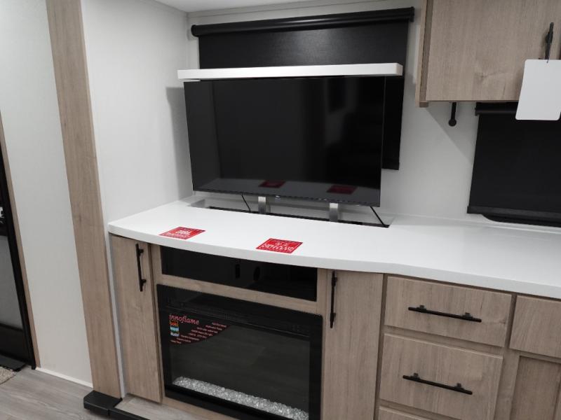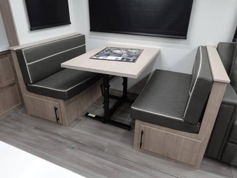 With this Imagine travel trailer, you can work while you're on the road because it offers you a desk in the main living area. You won't have to miss out on the action since you'll be right next to the booth dinette and tri-fold sofa, and there is even a pantry directly to the left of the desk for you to grab a quick snack while you're working. Once you're done with work, you can relax on the tri-fold sofa while you watch the telescoping LED HDTV, and the private bedroom offers you a 60" x 80" queen bed to rest on when you're ready to call it a night.
