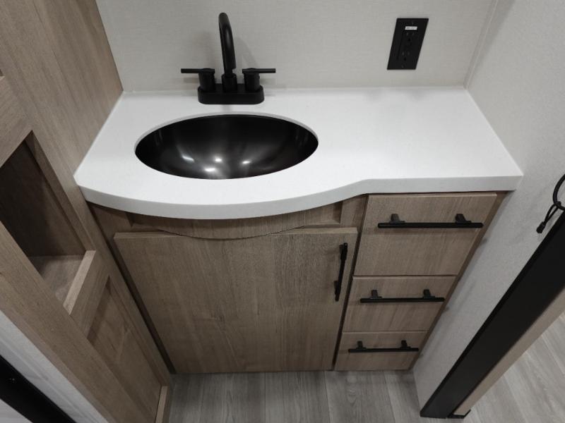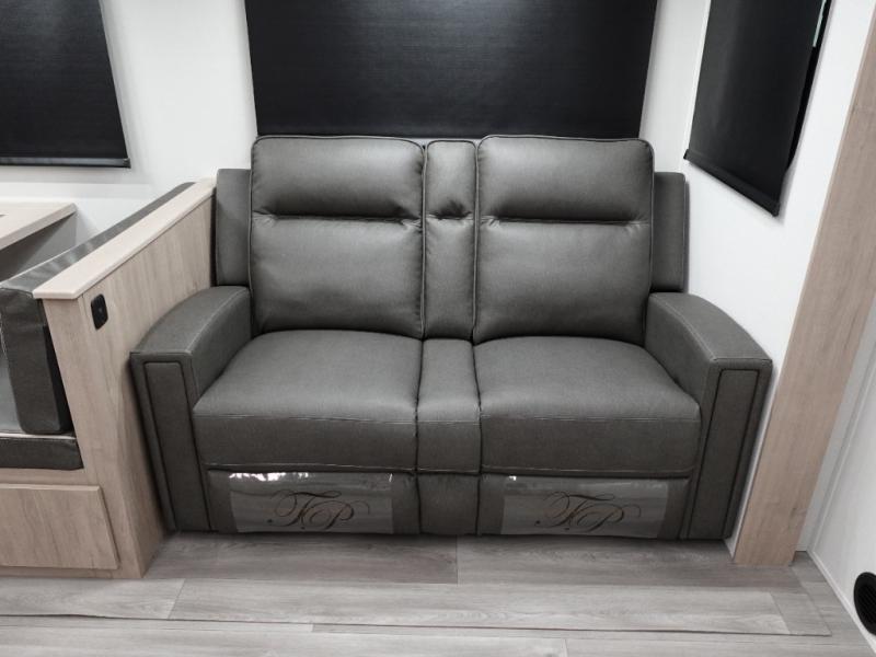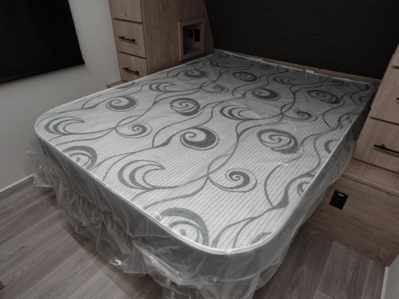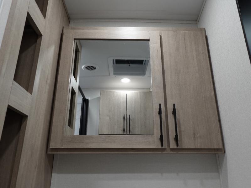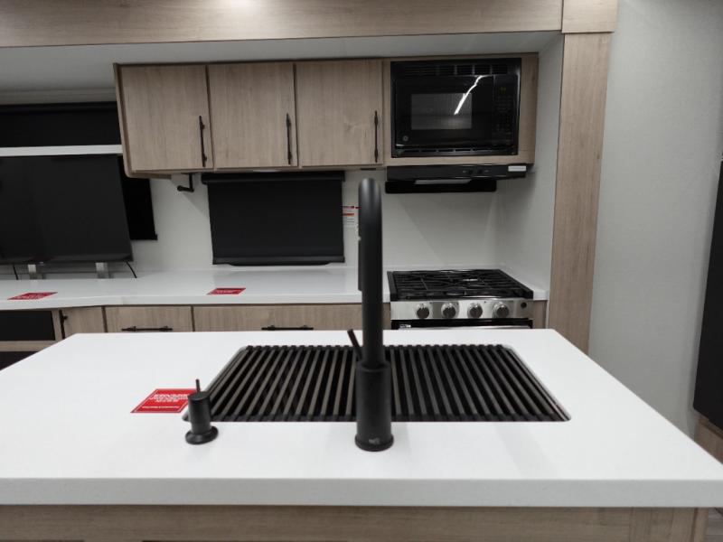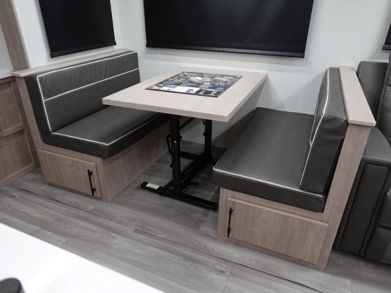 With this Imagine travel trailer, you can work while you're on the road because it offers you a desk in the main living area. You won't have to miss out on the action since you'll be right next to the booth dinette and tri-fold sofa, and there is even a pantry directly to the left of the desk for you to grab a quick snack while you're working. Once you're done with work, you can relax on the tri-fold sofa while you watch the telescoping LED HDTV, and the private bedroom offers you a 60" x 80" queen bed to rest on when you're ready to call it a night.