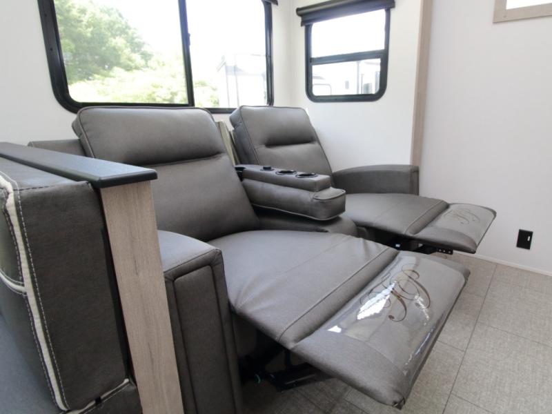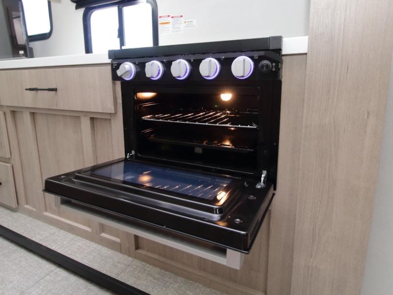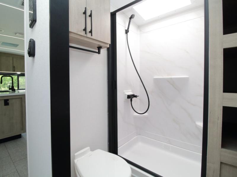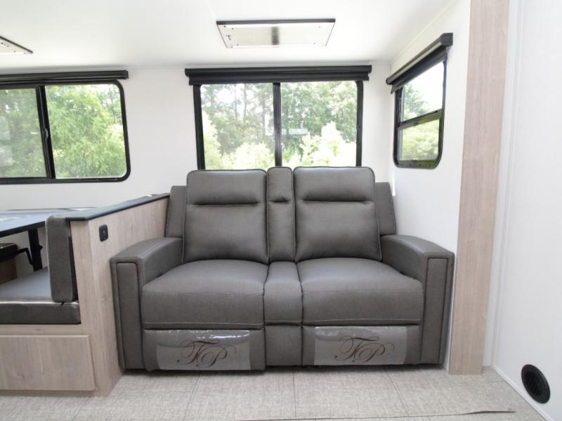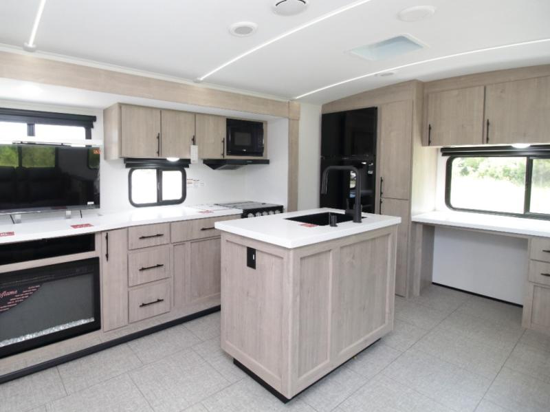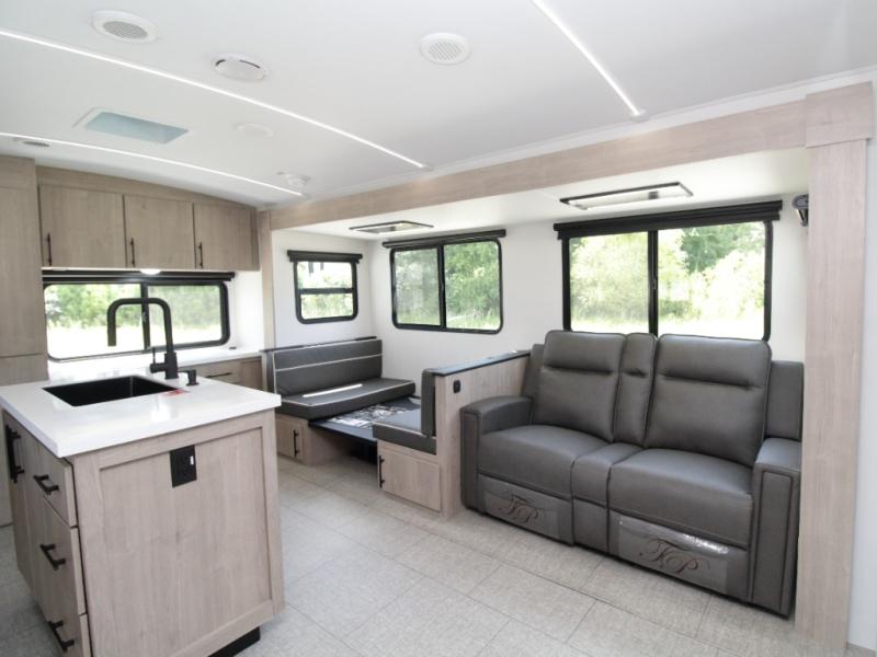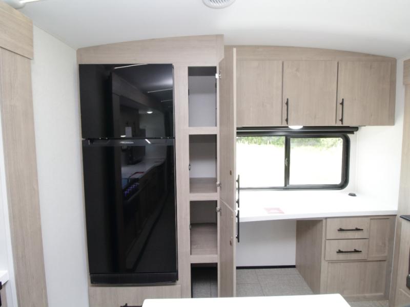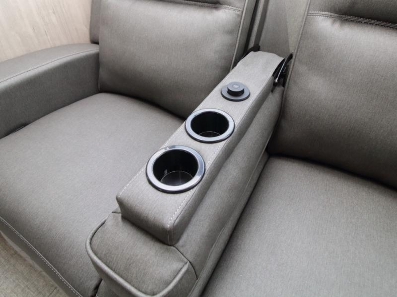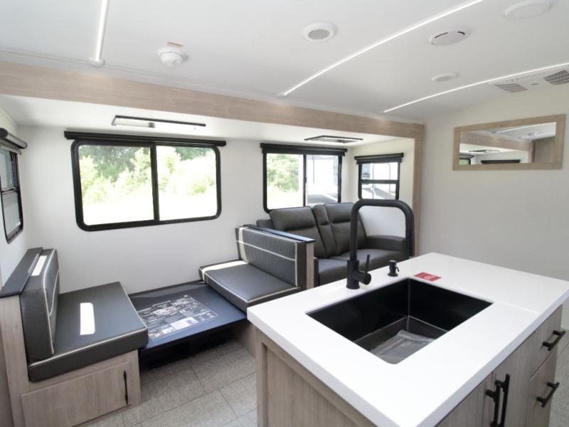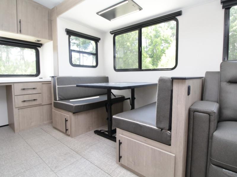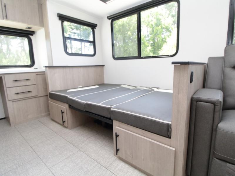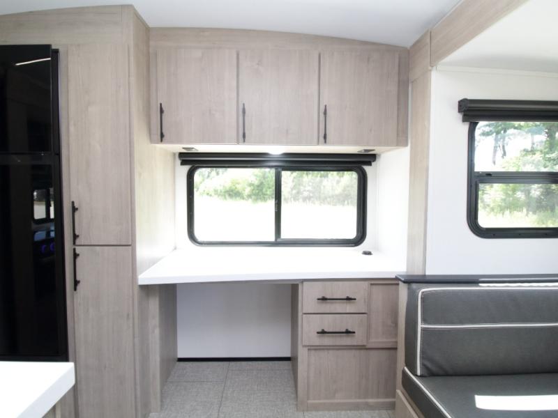 The rear desk provides a dedicated workspace without taking up living space, and it's located right next to the pantry, booth dinette, and tri-fold sofa so you can stay engaged with the rest of the RV. Enjoy quick access to snacks, storage, and entertainment, all within arm’s reach.