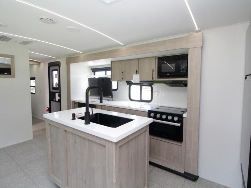 And when you’d rather cook outside, take advantage of the outdoor griddle and mini fridge, all under your power awning.