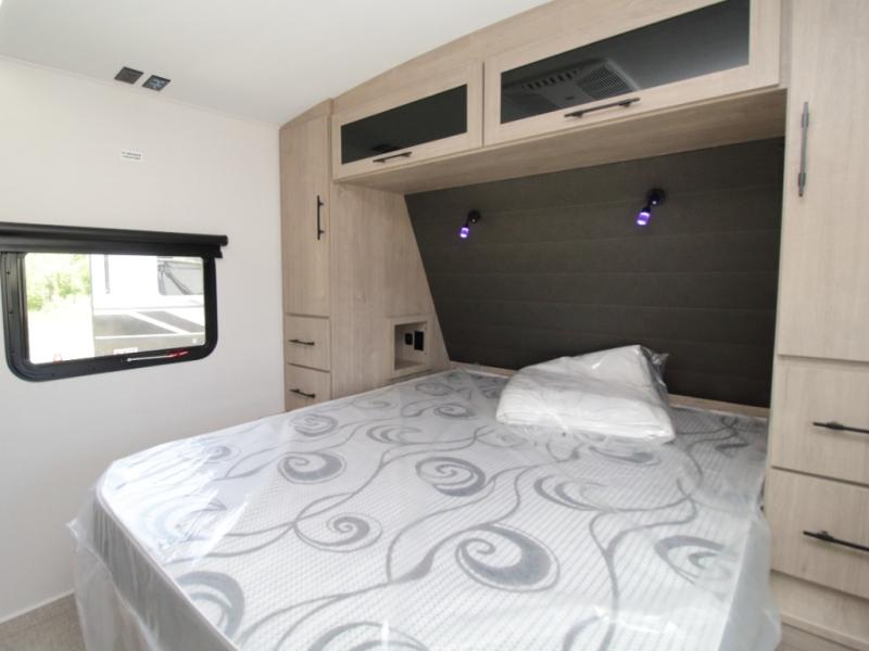 The front bedroom features a 60" x 80" walk-around queen bed, dual wardrobes, overhead cabinets, and TV prep. The adjacent bathroom includes a walk-in shower, linen cabinet, and plenty of countertop space.