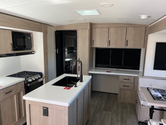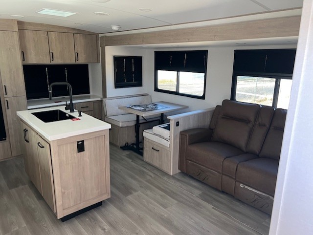 With this Imagine travel trailer, you can work while you're on the road because it offers you a desk in the main living area. You won't have to miss out on the action since you'll be right next to the booth dinette and tri-fold sofa, and there is even a pantry directly to the left of the desk for you to grab a quick snack while you're working. Once you're done with work, you can relax on the tri-fold sofa while you watch the telescoping LED HDTV, and the private bedroom offers you a 60" x 80" queen bed to rest on when you're ready to call it a night.