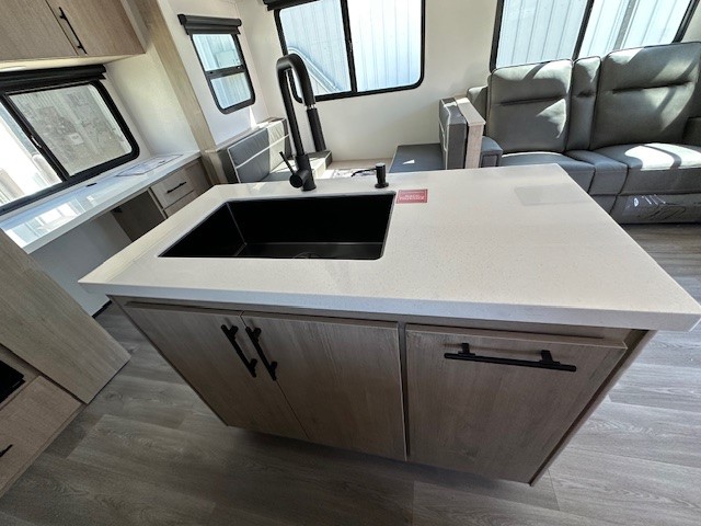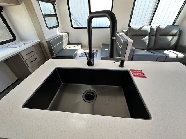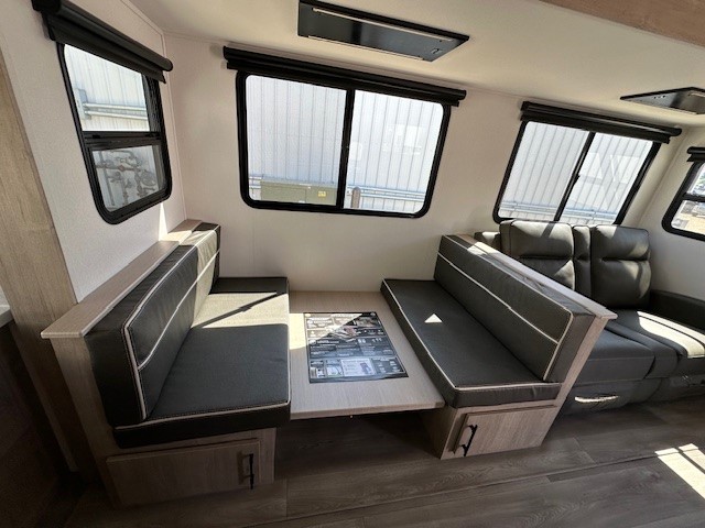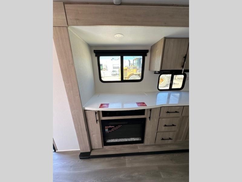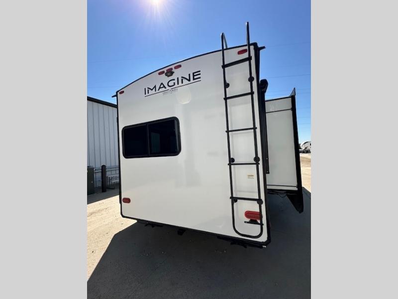 With this Imagine travel trailer, you can work while you're on the road because it offers you a desk in the main living area. You won't have to miss out on the action since you'll be right next to the booth dinette and tri-fold sofa, and there is even a pantry directly to the left of the desk for you to grab a quick snack while you're working. Once you're done with work, you can relax on the tri-fold sofa while you watch the telescoping LED HDTV, and the private bedroom offers you a 60" x 80" queen bed to rest on when you're ready to call it a night.