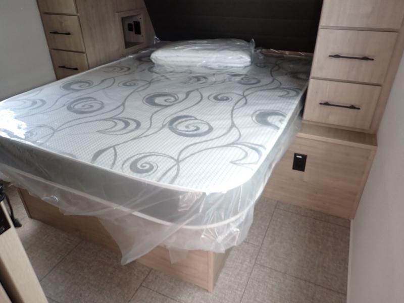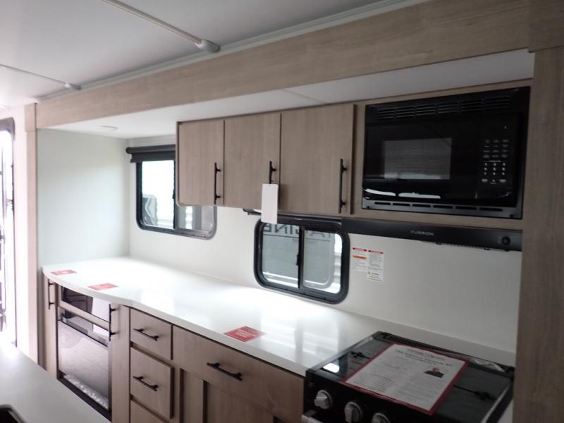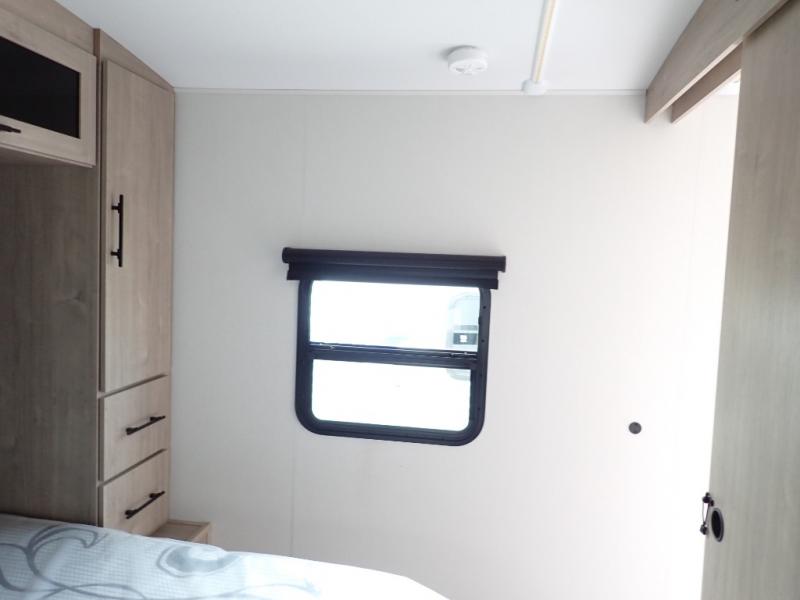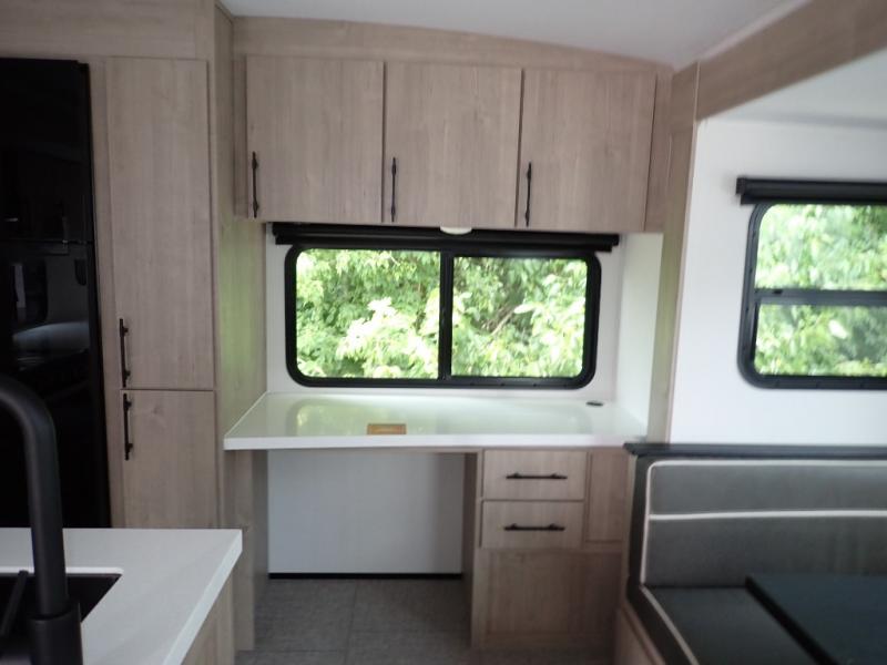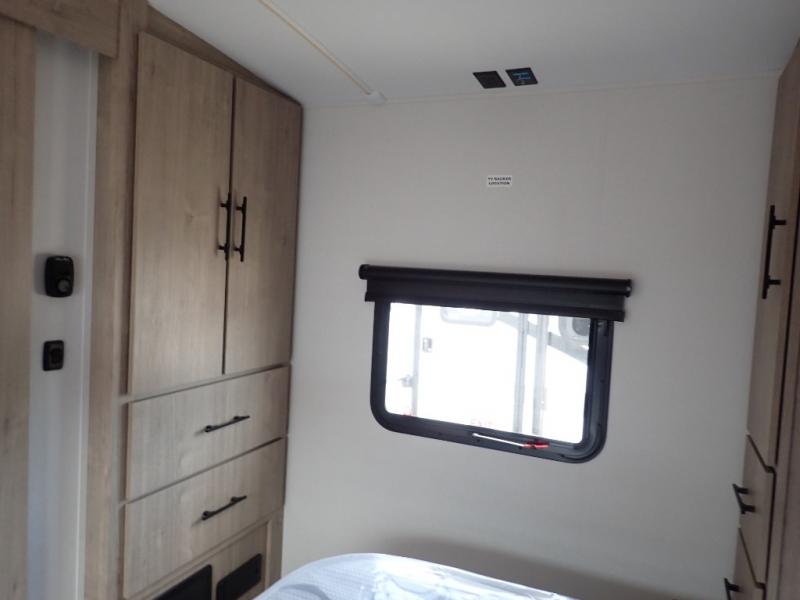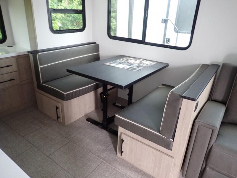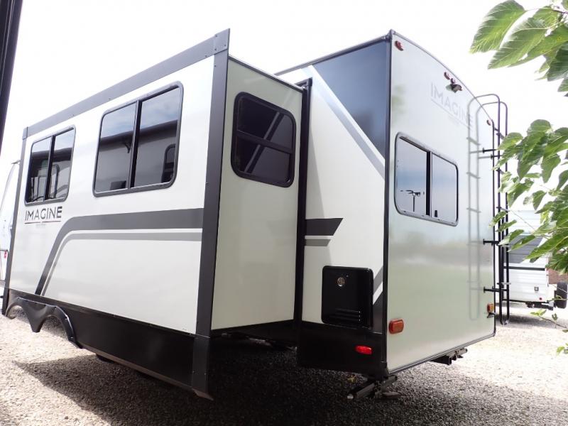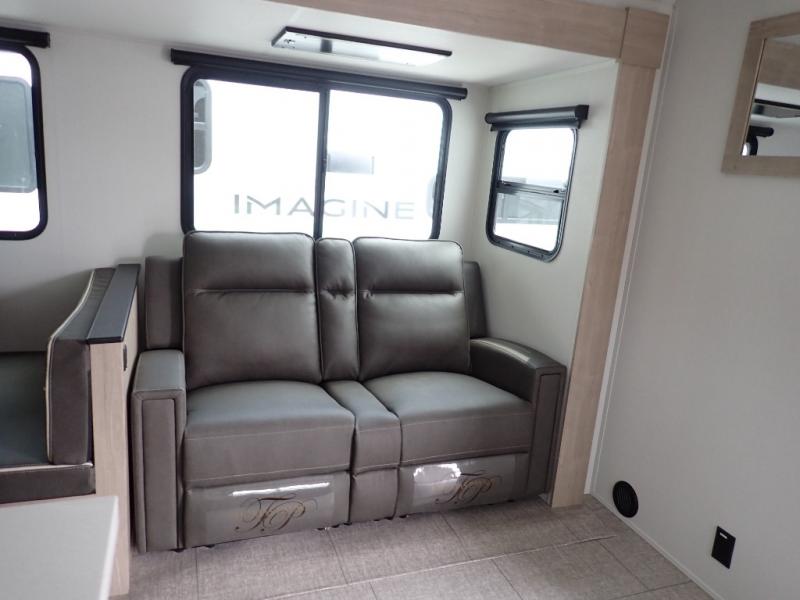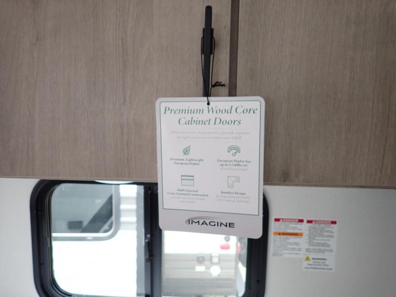 With this Imagine travel trailer, you can work while you're on the road because it offers you a desk in the main living area. You won't have to miss out on the action since you'll be right next to the booth dinette and tri-fold sofa, and there is even a pantry directly to the left of the desk for you to grab a quick snack while you're working. Once you're done with work, you can relax on the tri-fold sofa while you watch the telescoping LED HDTV, and the private bedroom offers you a 60" x 80" queen bed to rest on when you're ready to call it a night.