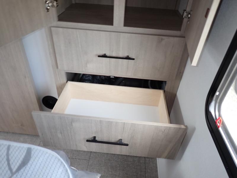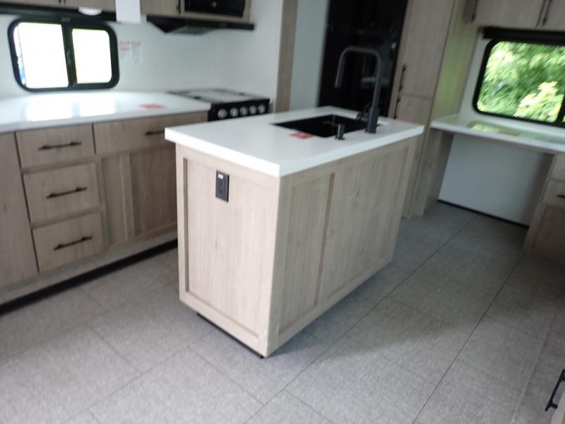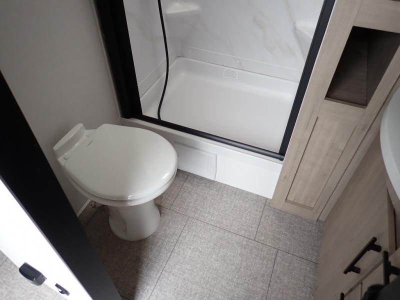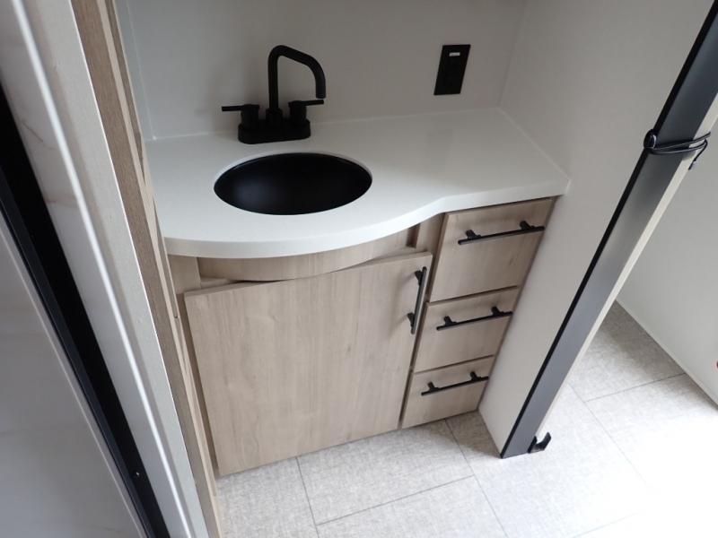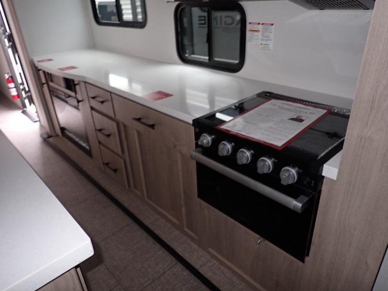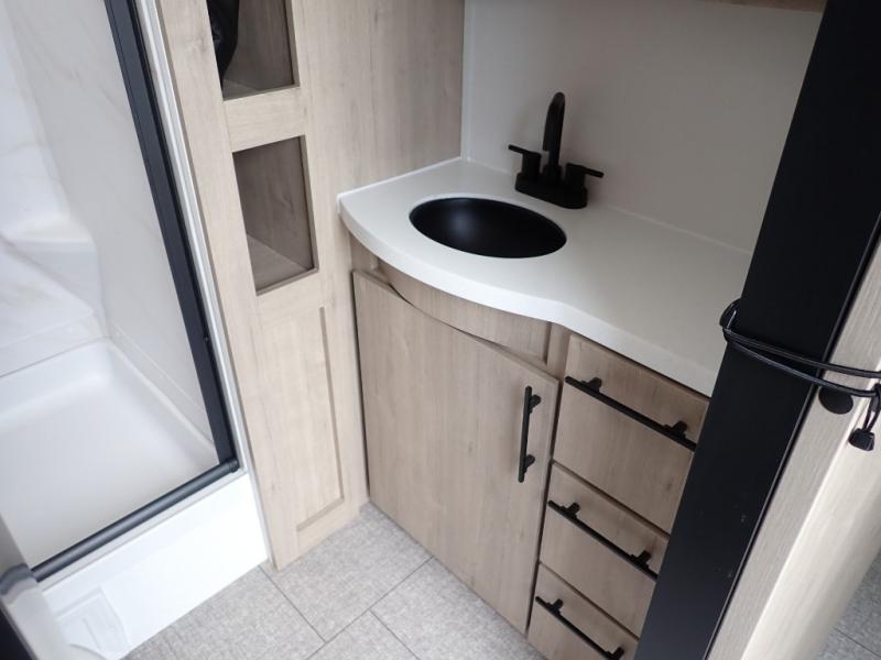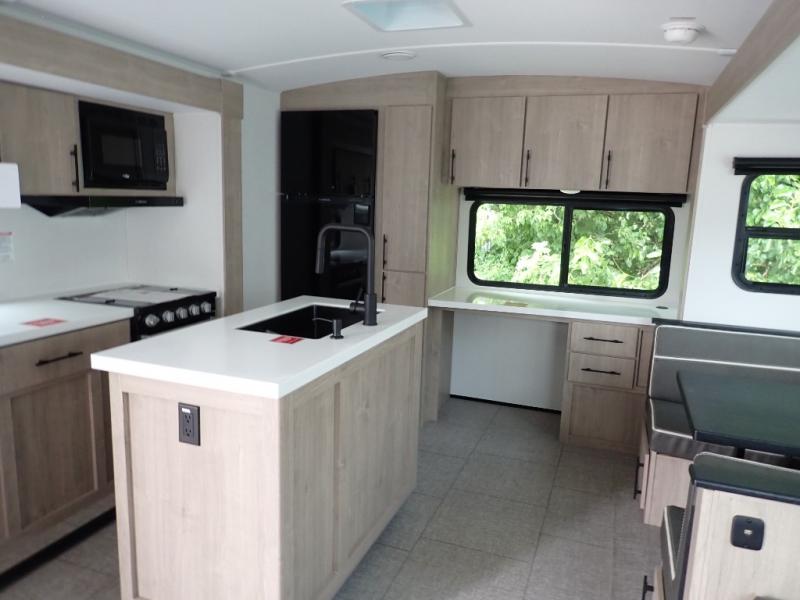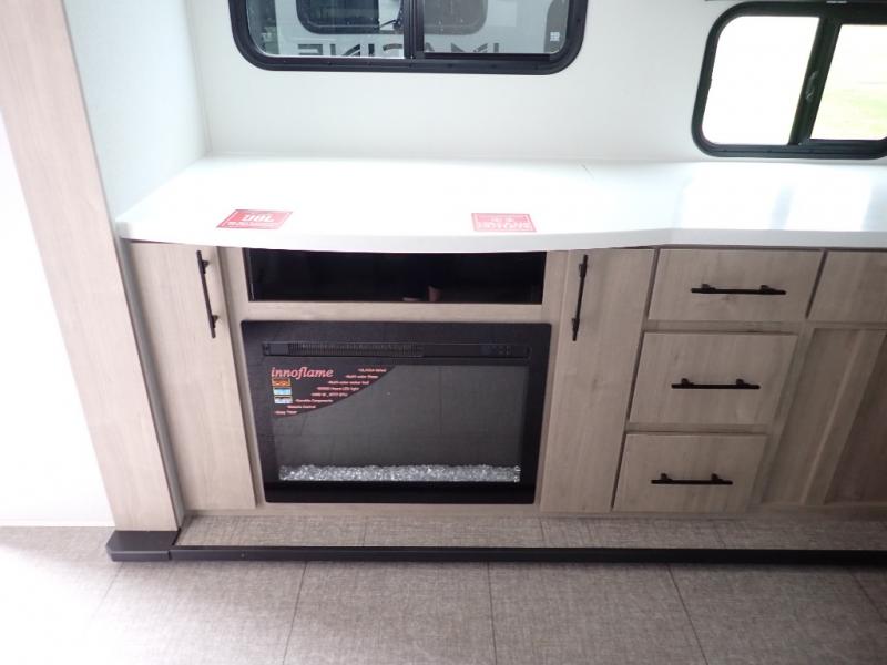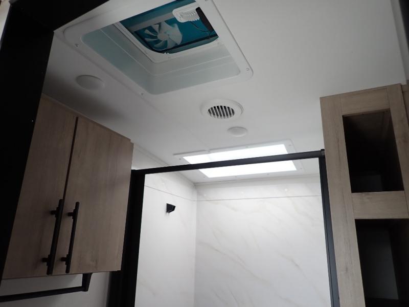 With this Imagine travel trailer, you can work while you're on the road because it offers you a desk in the main living area. You won't have to miss out on the action since you'll be right next to the booth dinette and tri-fold sofa, and there is even a pantry directly to the left of the desk for you to grab a quick snack while you're working. Once you're done with work, you can relax on the tri-fold sofa while you watch the telescoping LED HDTV, and the private bedroom offers you a 60" x 80" queen bed to rest on when you're ready to call it a night.