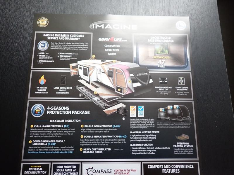 Just imagine leaving the world behind and secluding yourself away with your favorite people in your Grand Design Imagine travel trailer! The Imagine has been designed to enjoy extended season camping and includes a high-capacity furnace, a heated and enclosed underbelly with suspended tanks, a designated heat duct to the subfloor, and a high-density roof insulation with attic vent. You'll have maximum head room on the interior with 81" radius ceilings, and large panoramic windows to let in natural lighting. The exclusive drop-frame pass-through storage compartment is going to allow you to bring along lots of equipment, and the universal docking station is an all-in-one location for utilities and hook-ups. You'll also have oversized tank capacities so that you can fill and empty your tanks less often.