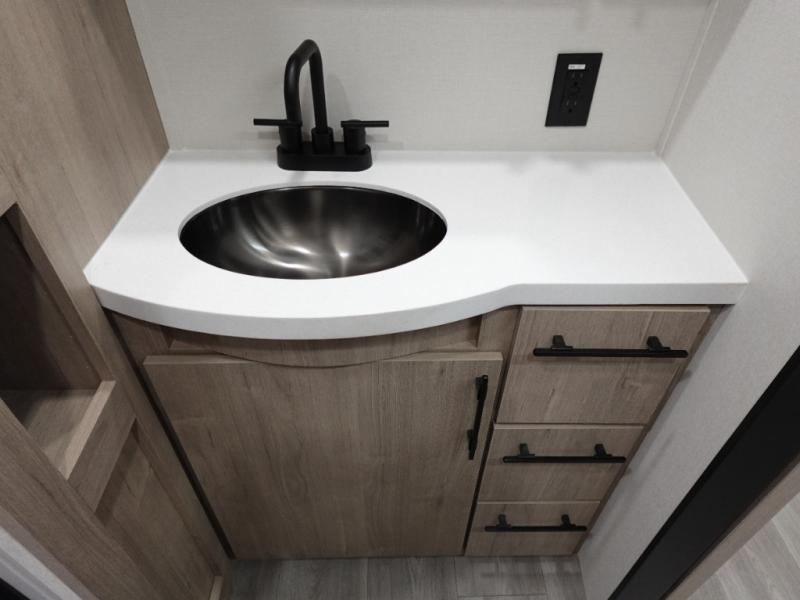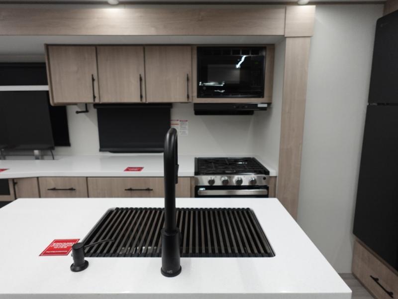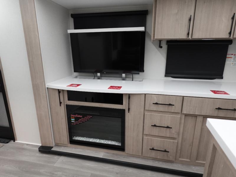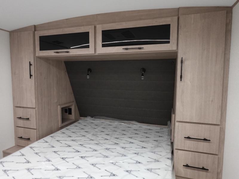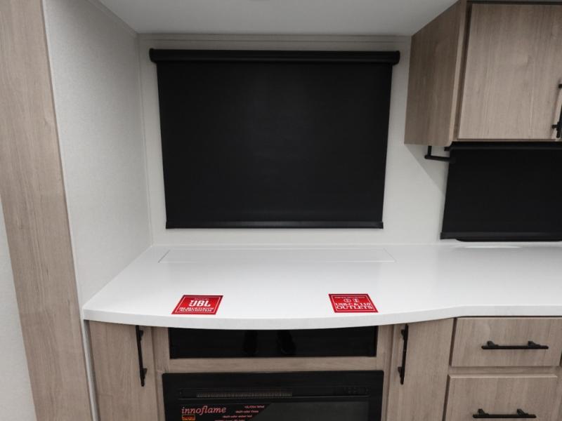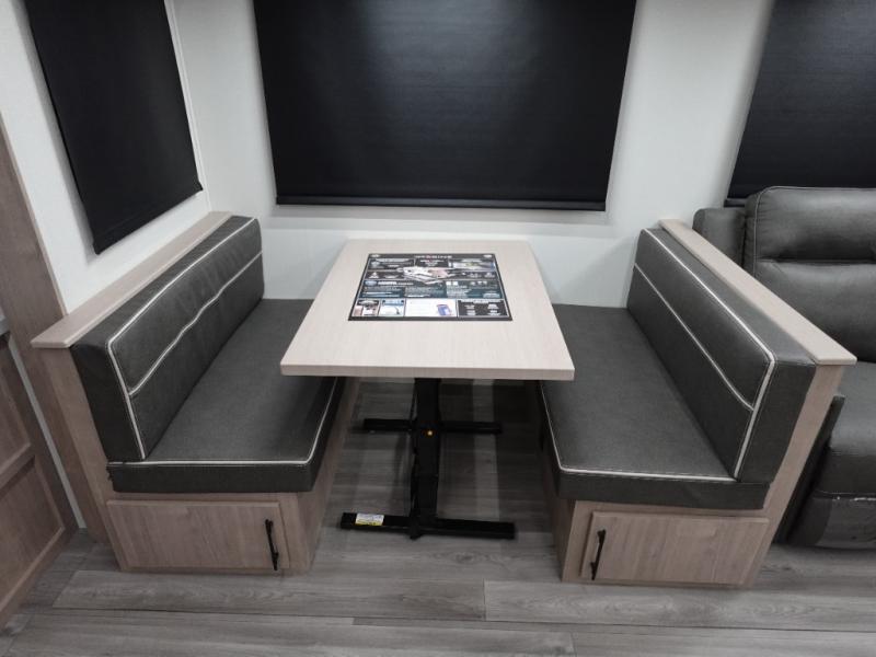 With this Imagine travel trailer, you can work while you're on the road because it offers you a desk in the main living area. You won't have to miss out on the action since you'll be right next to the booth dinette and sofa, and there is even a pantry directly to the left of the desk for you to grab a quick snack while you're working. Once you're done with work, you can relax on the sofa while you watch the telescoping LED HDTV, and the private bedroom offers you a 60" x 80" queen bed to rest on when you're ready to call it a night.