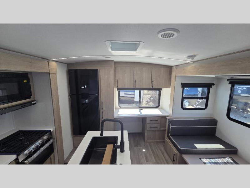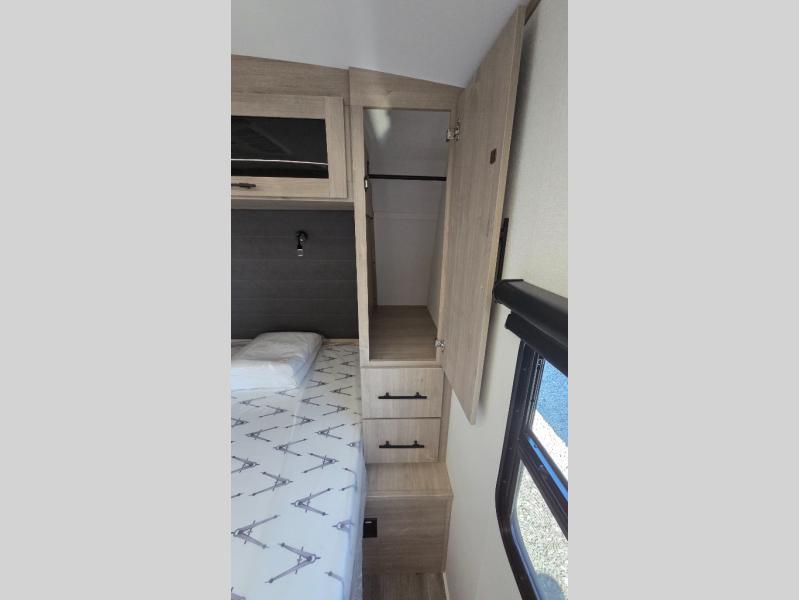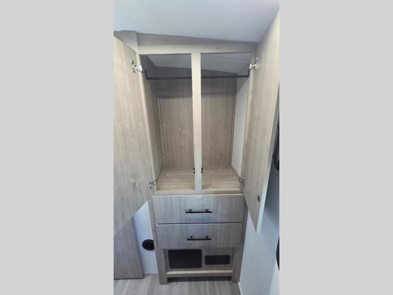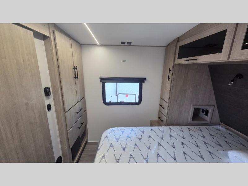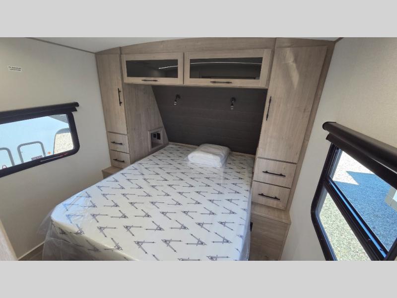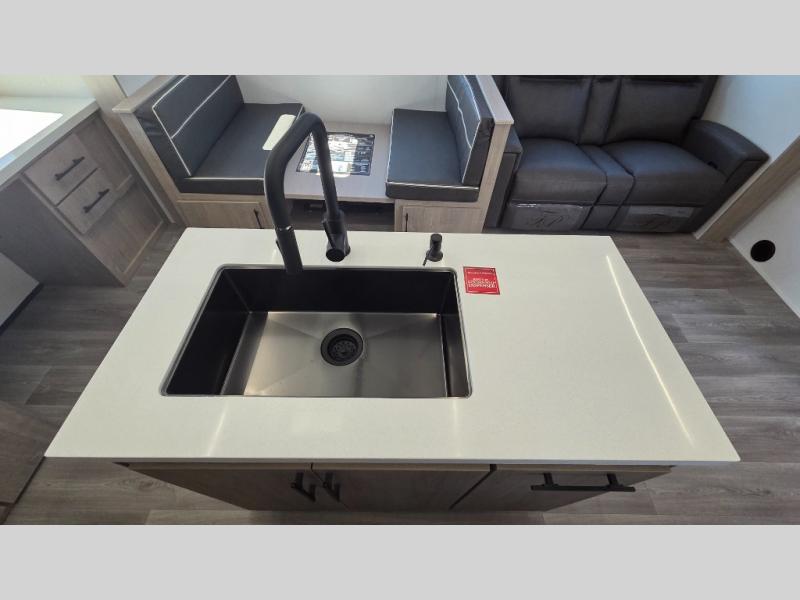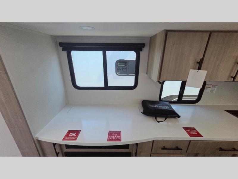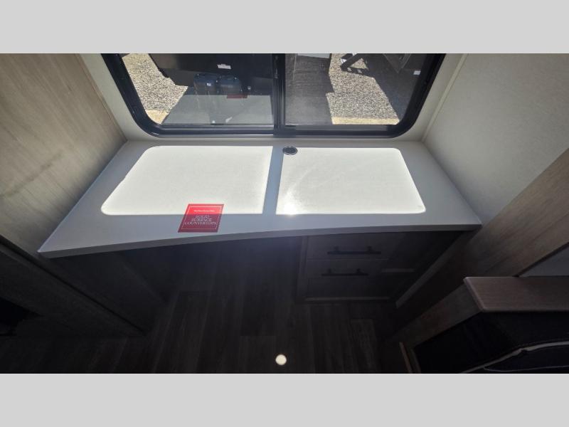 With this Imagine travel trailer, you can work while you're on the road because it offers you a desk in the main living area. You won't have to miss out on the action since you'll be right next to the booth dinette and tri-fold sofa, and there is even a pantry directly to the left of the desk for you to grab a quick snack while you're working. Once you're done with work, you can relax on the tri-fold sofa while you watch the telescoping LED HDTV, and the private bedroom offers you a 60" x 80" queen bed to rest on when you're ready to call it a night.