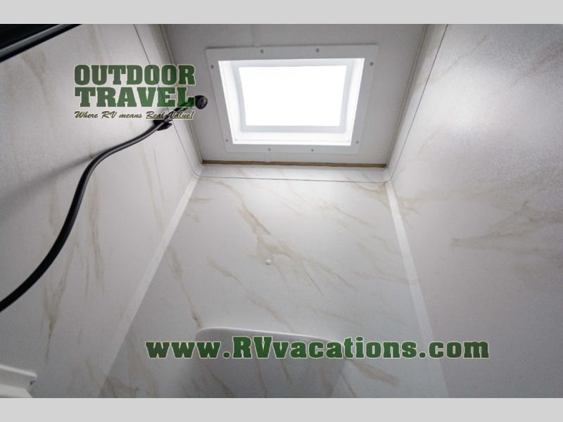 With this Imagine travel trailer, you can work while you're on the road because it offers you a desk in the main living area. You won't have to miss out on the action since you'll be right next to the booth dinette and tri-fold sofa, and there is even a pantry directly to the left of the desk for you to grab a quick snack while you're working. Once you're done with work, you can relax on the tri-fold sofa while you watch the telescoping LED HDTV, and the private bedroom offers you a 60" x 80" queen bed to rest on when you're ready to call it a night.