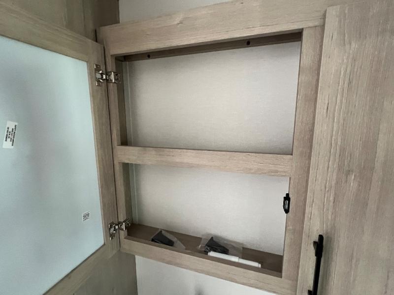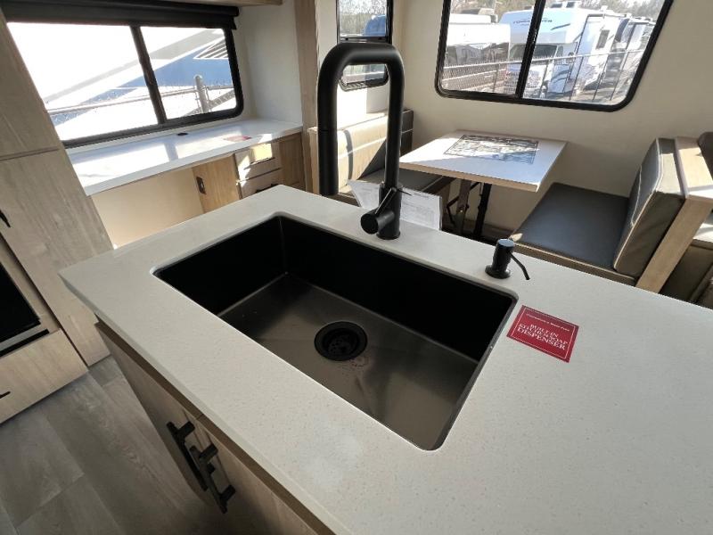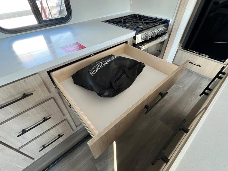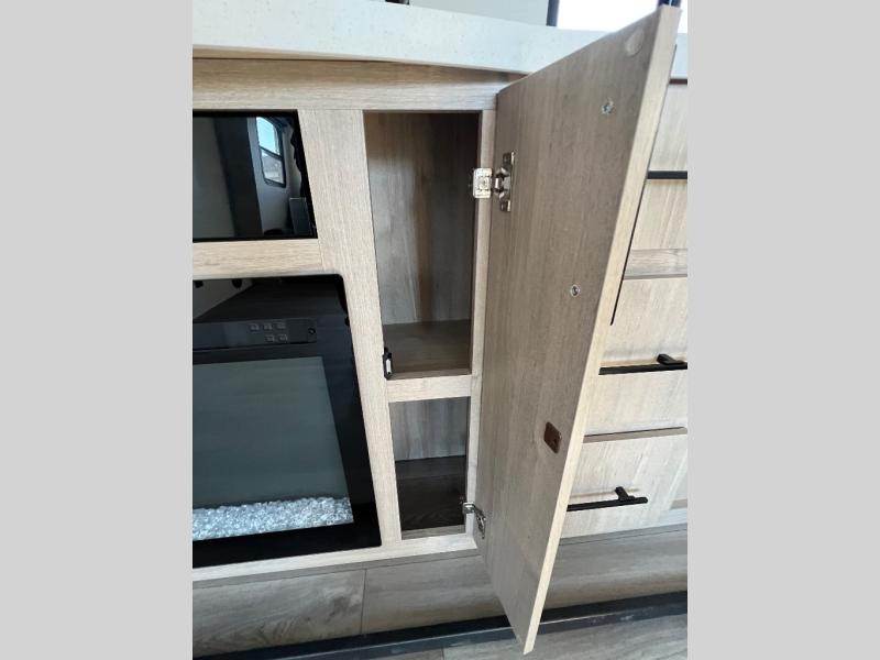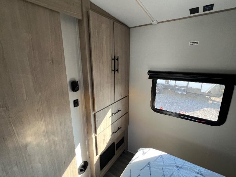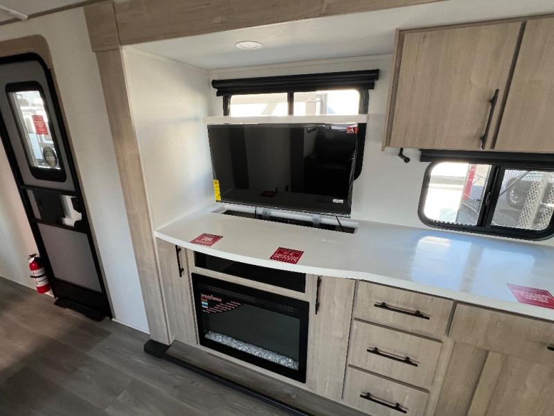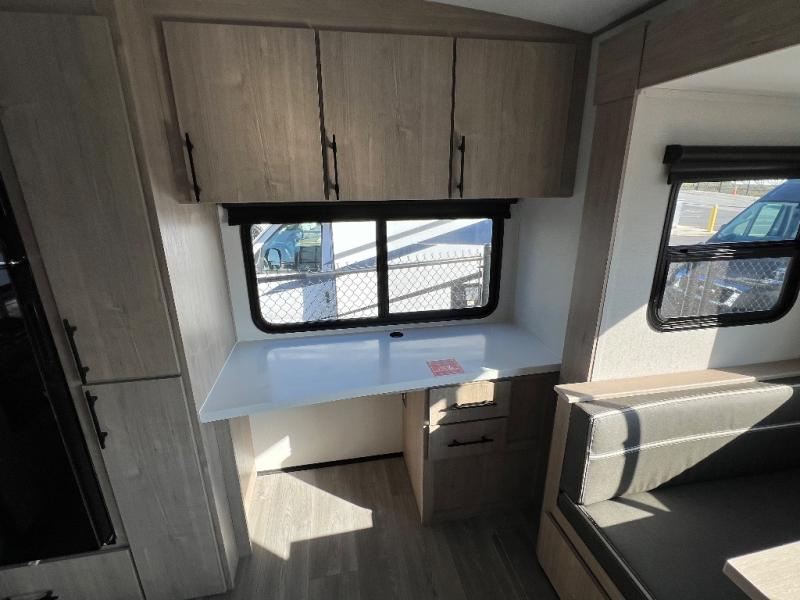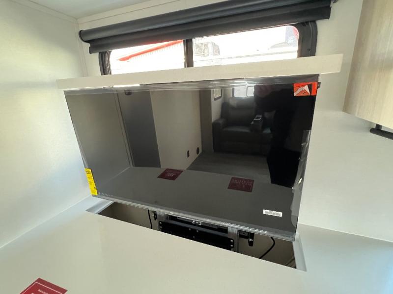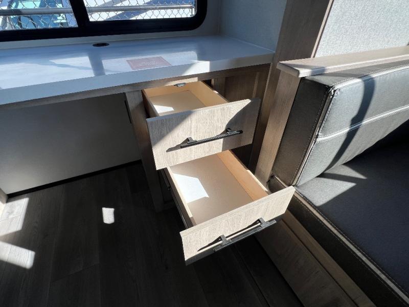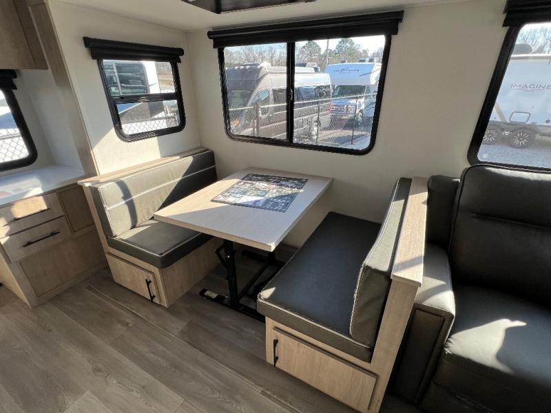 With this Imagine travel trailer, you can work while you're on the road because it offers you a desk in the main living area. You won't have to miss out on the action since you'll be right next to the booth dinette and tri-fold sofa, and there is even a pantry directly to the left of the desk for you to grab a quick snack while you're working. Once you're done with work, you can relax on the tri-fold sofa while you watch the telescoping LED HDTV, and the private bedroom offers you a 60" x 80" queen bed to rest on when you're ready to call it a night.