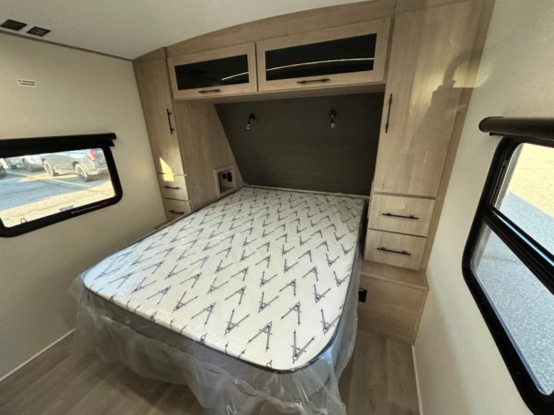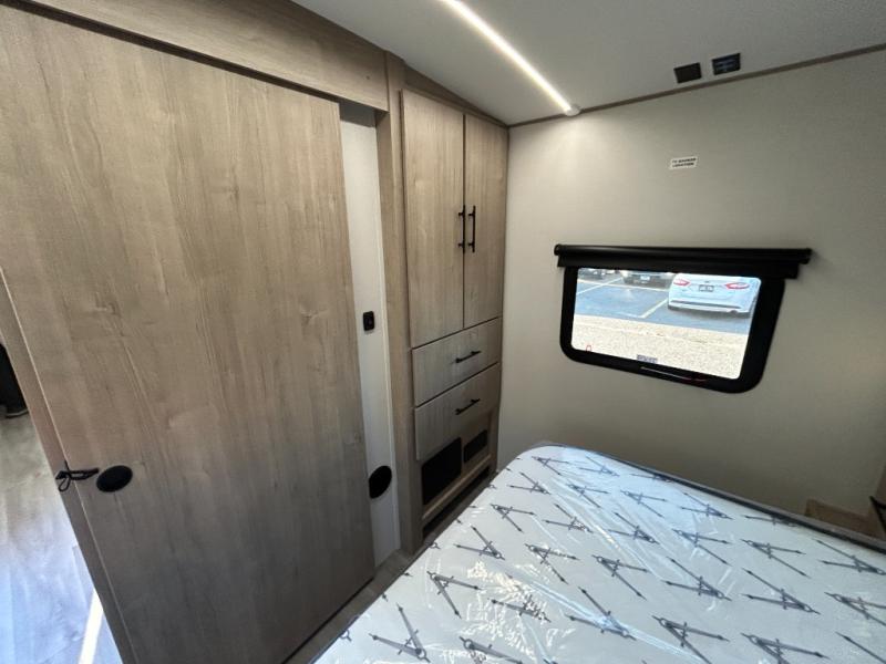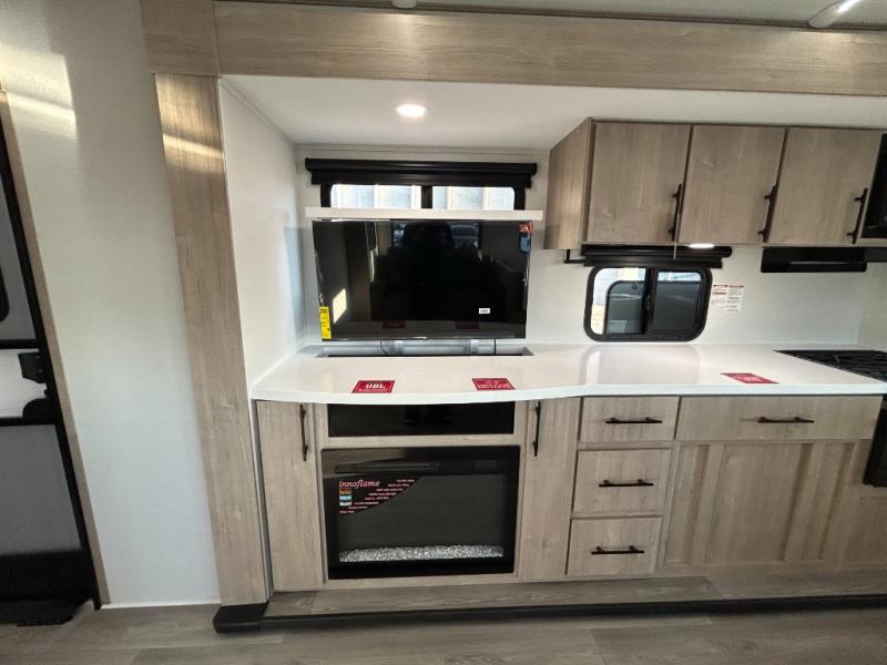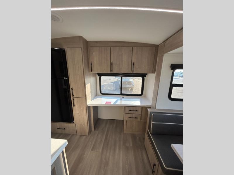 With this Imagine travel trailer, you can work while you're on the road because it offers you a desk in the main living area. You won't have to miss out on the action since you'll be right next to the booth dinette and theater seating, and there is even a pantry directly to the left of the desk for you to grab a quick snack while you're working. Once you're done with work, you can relax on the tri-fold sofa while you watch the telescoping LED HDTV, and the private bedroom offers you a 60" x 80" queen bed to rest on when you're ready to call it a night.