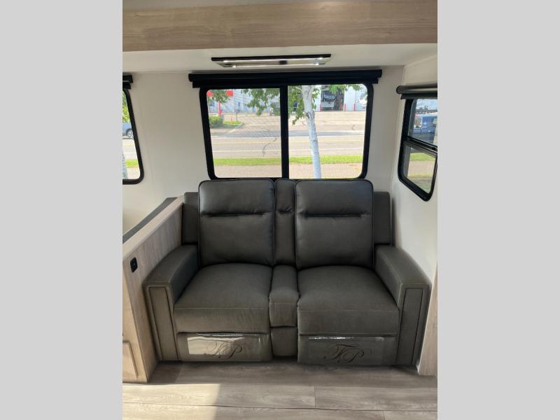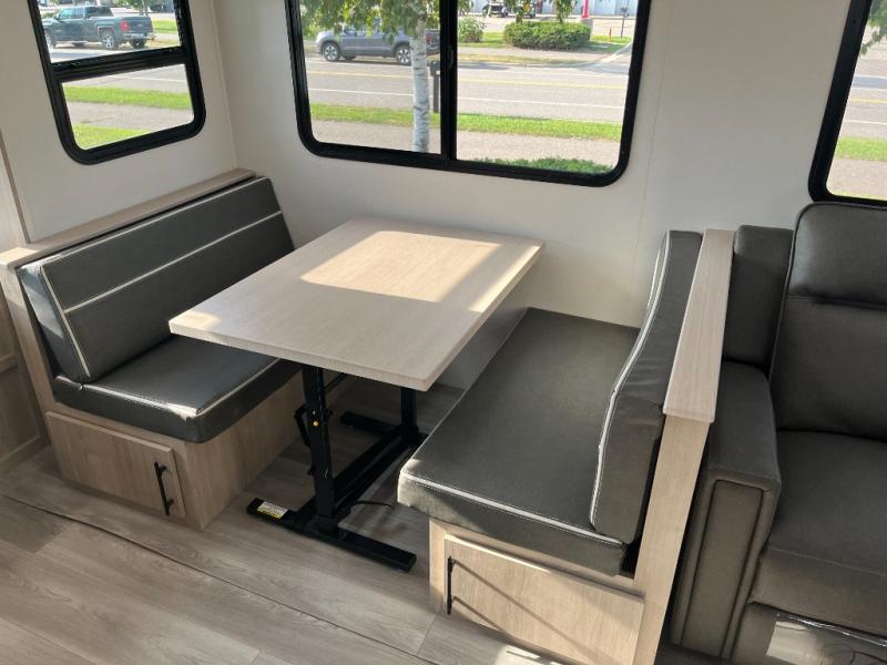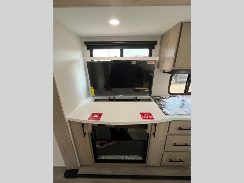 With this Imagine travel trailer, you can work while you're on the road because it offers you a desk in the main living area. You won't have to miss out on the action since you'll be right next to the booth dinette and tri-fold sofa, and there is even a pantry directly to the left of the desk for you to grab a quick snack while you're working. Once you're done with work, you can relax on the tri-fold sofa while you watch the telescoping LED HDTV, and the private bedroom offers you a 60" x 80" queen bed to rest on when you're ready to call it a night.