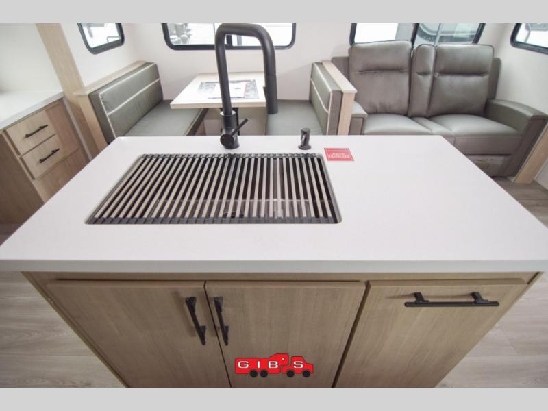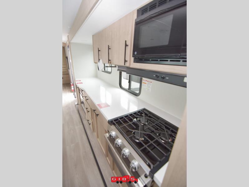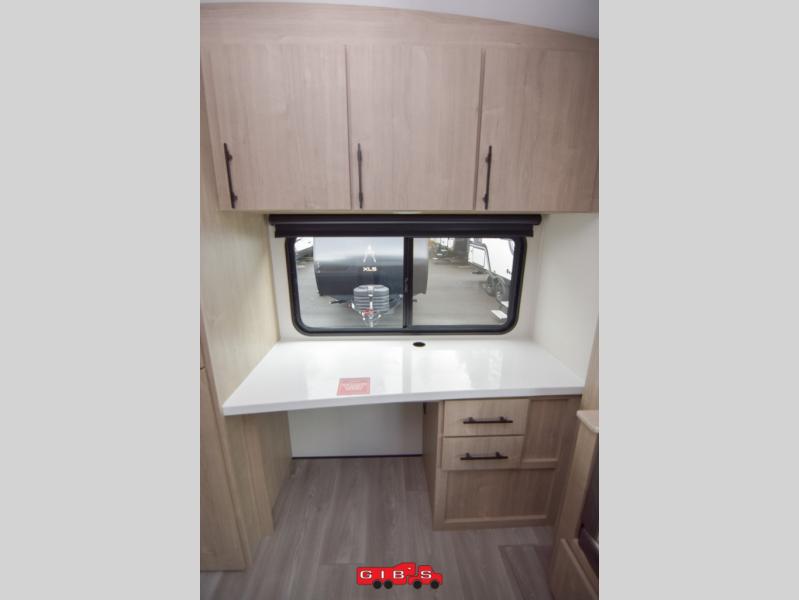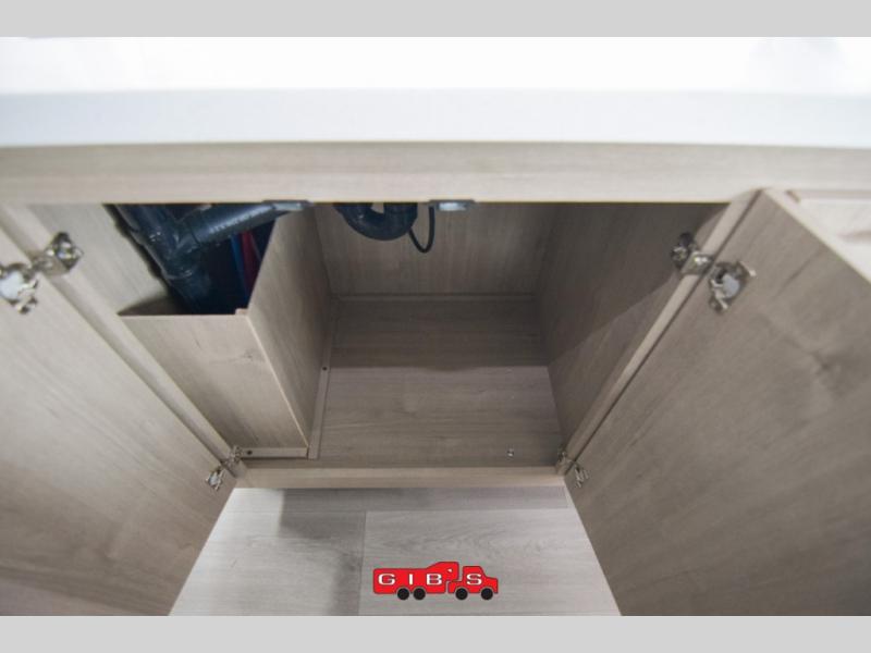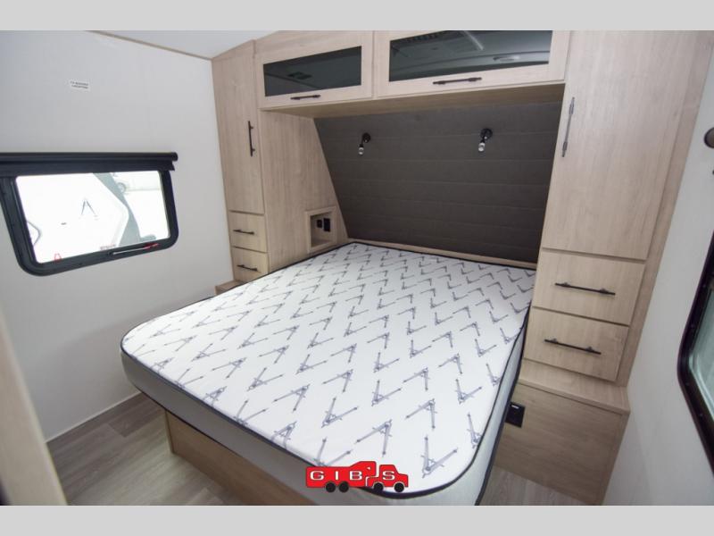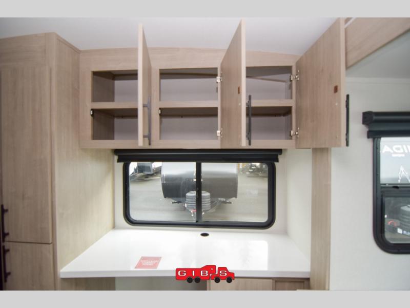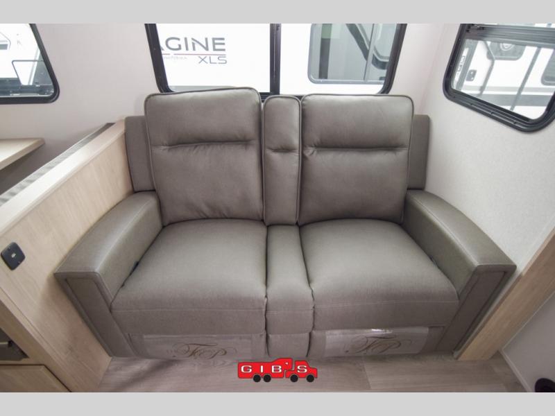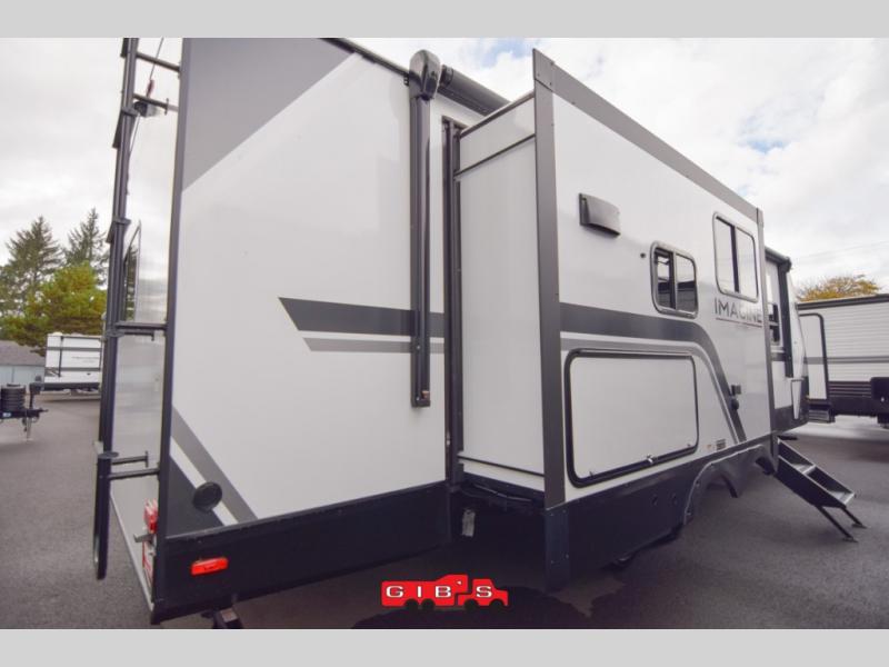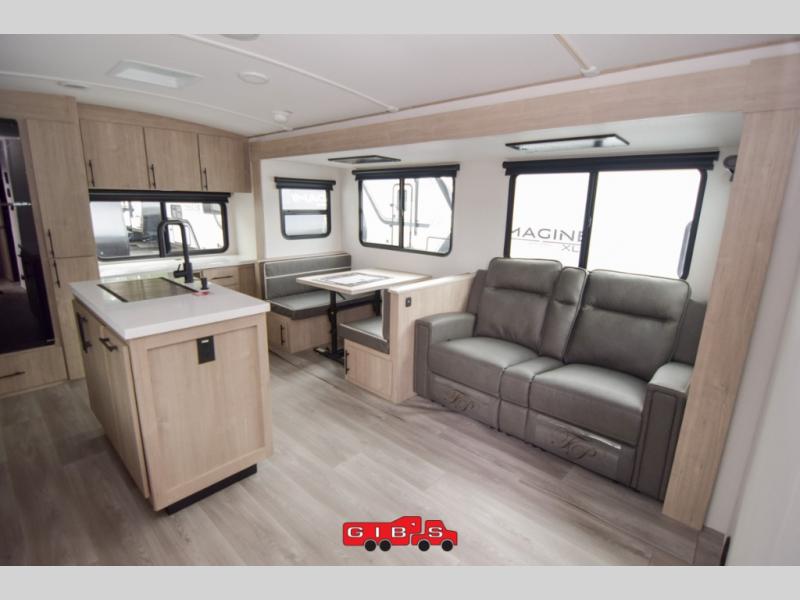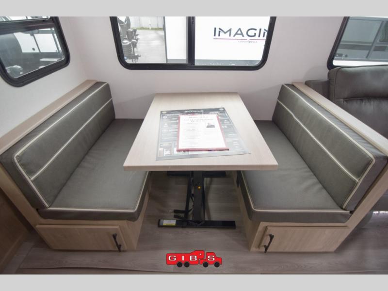 With this Imagine travel trailer, you can work while you're on the road because it offers you a desk in the main living area. You won't have to miss out on the action since you'll be right next to the booth dinette and tri-fold sofa, and there is even a pantry directly to the left of the desk for you to grab a quick snack while you're working. Once you're done with work, you can relax on the tri-fold sofa while you watch the telescoping LED HDTV, and the private bedroom offers you a 60" x 80" queen bed to rest on when you're ready to call it a night.