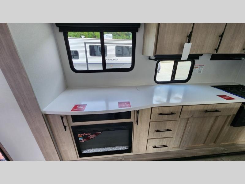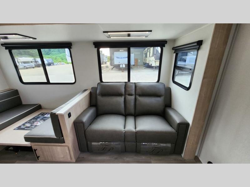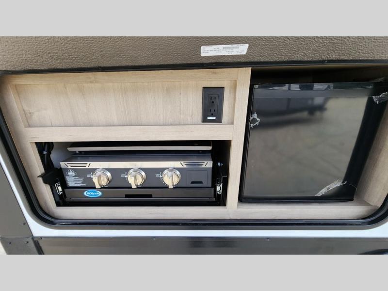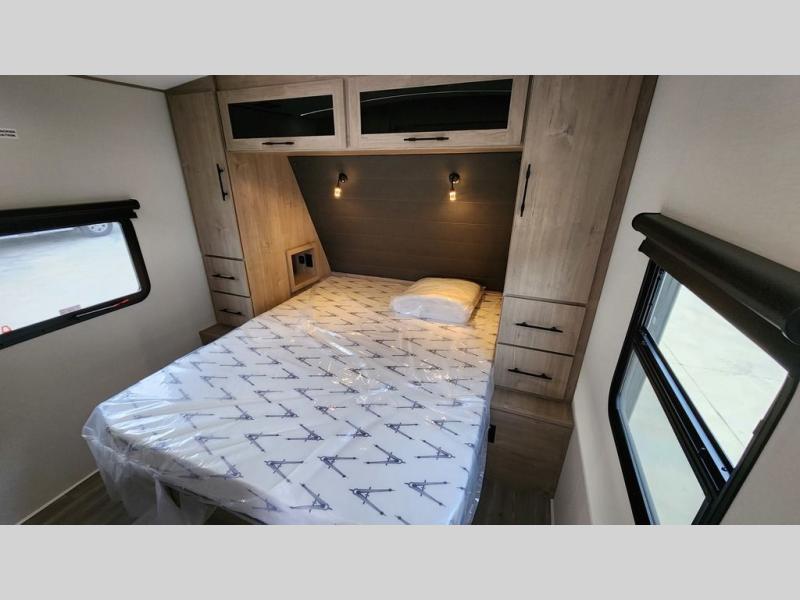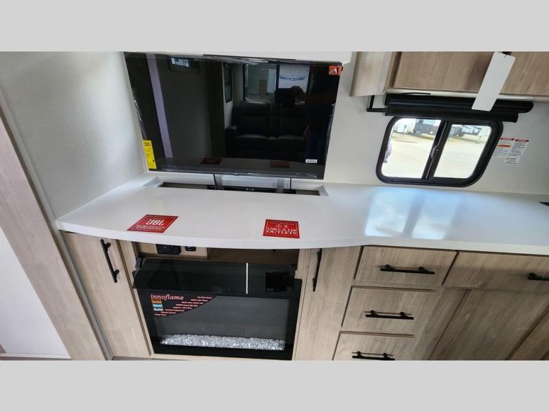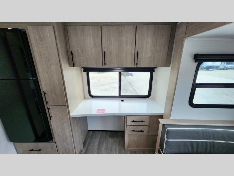 With this Imagine travel trailer, you can work while you're on the road because it offers you a desk in the main living area. You won't have to miss out on the action since you'll be right next to the booth dinette and tri-fold sofa, and there is even a pantry directly to the left of the desk for you to grab a quick snack while you're working. Once you're done with work, you can relax on the tri-fold sofa while you watch the telescoping TV, and the private bedroom offers you a 60" x 80" queen bed to rest on when you're ready to call it a night.