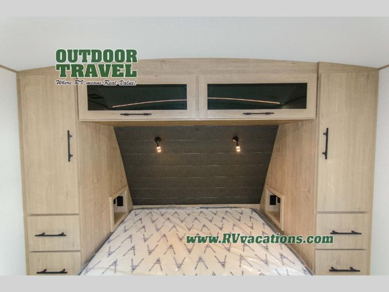 With this Imagine travel trailer, you can work while you're on the road because it offers you a desk in the main living area. You won't have to miss out on the action since you'll be right next to the booth dinette and tri-fold sofa, and there is even a pantry directly to the left of the desk for you to grab a quick snack while you're working. Once you're done with work, you can relax on the tri-fold sofa while you watch the telescoping LED HDTV, and the private bedroom offers you a 60" x 80" queen bed to rest on when you're ready to call it a night.